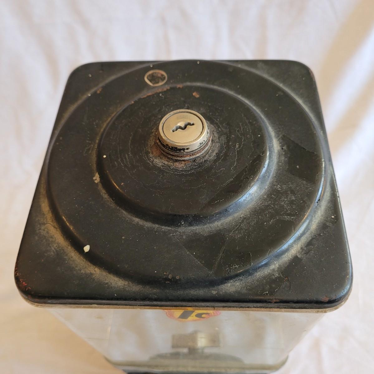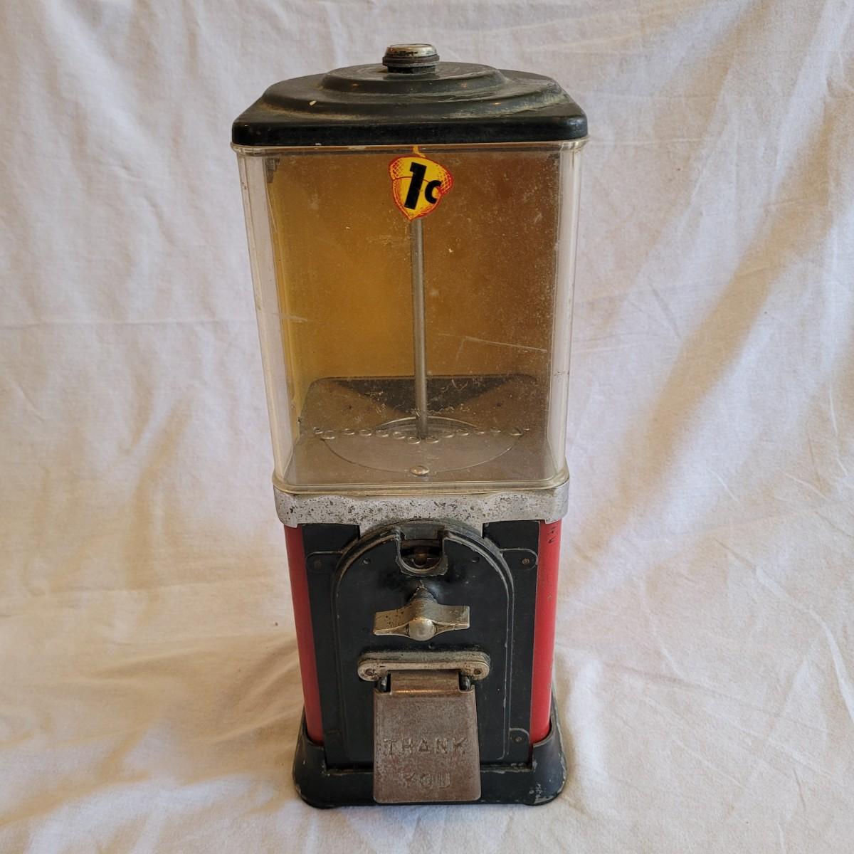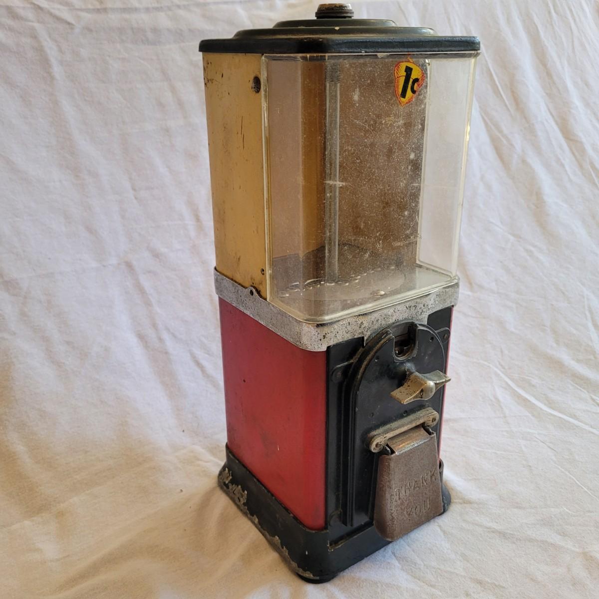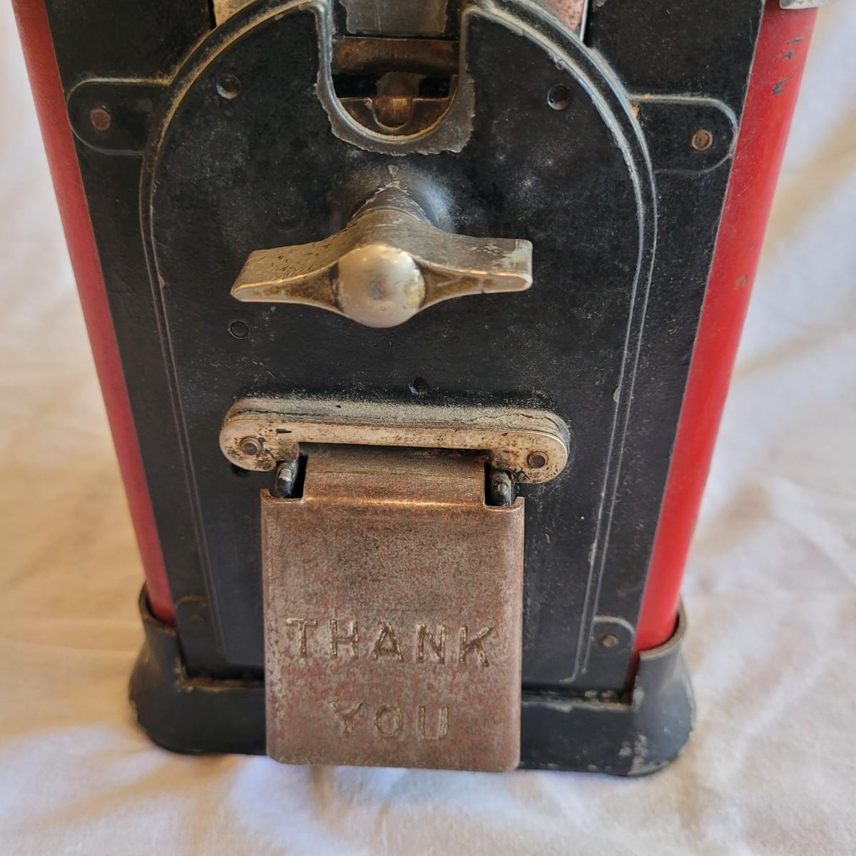 Vintage gumball vending machine, likely from the 1950s. It is a coin-operated machine that dispenses gumballs or small candies. It features a plastic globe to display the contents. The visible price on the machine is one cent, though some models may have been five cents. The body is made of metal with a red and black color scheme. Paint on metal shows some signs of age. "Thank You" is printed on the coin slot cover. Item measures 6" x 6" x 13"H. Includes key and spare washers.