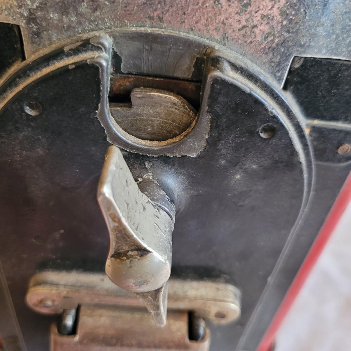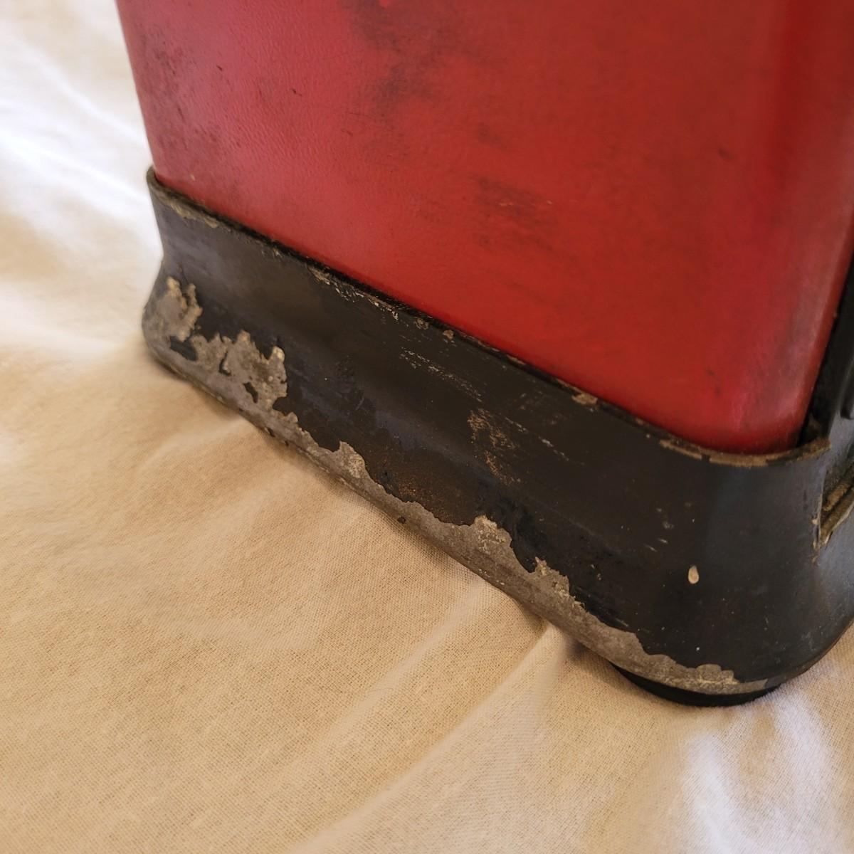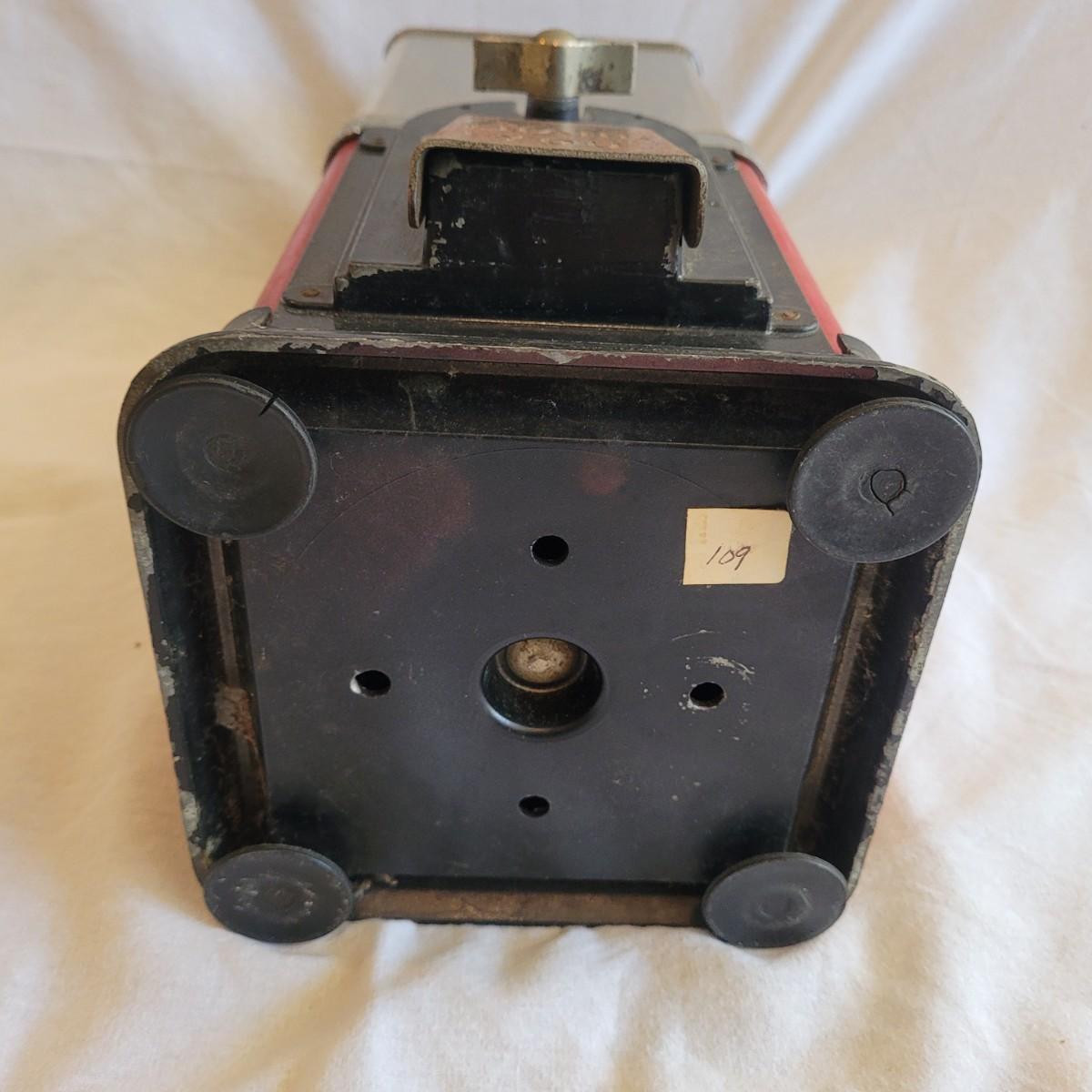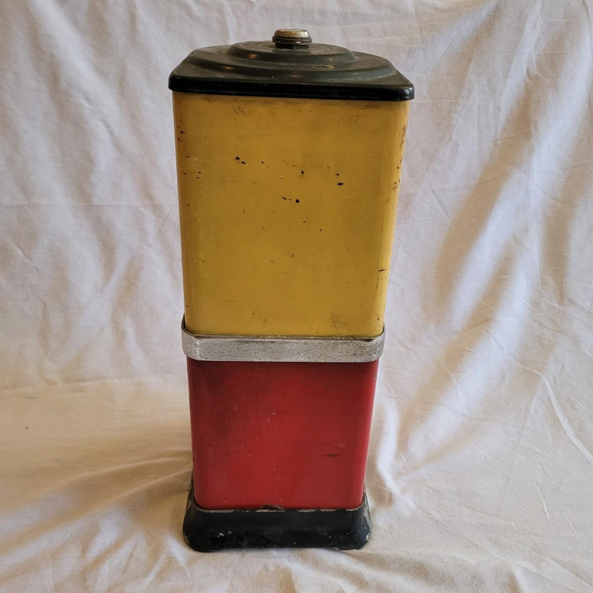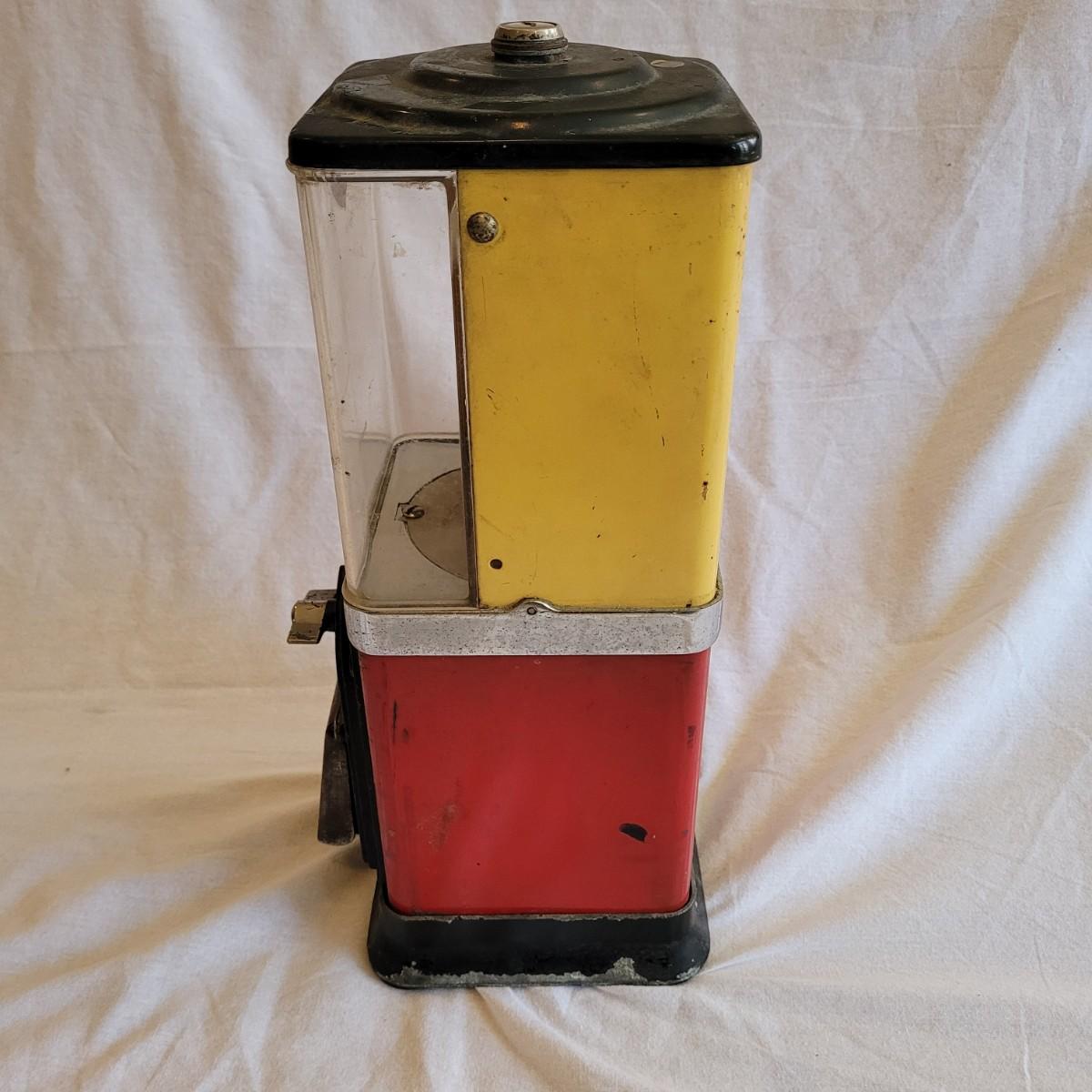Vintage gumball vending machine, likely from the 1950s. It is a coin-operated machine that dispenses gumballs or small candies. It features a plastic globe to display the contents. The visible price on the machine is one cent, though some models may have been five cents. The body is made of metal with a red and black color scheme. Paint on metal shows some signs of age. "Thank You" is printed on the coin slot cover. Item measures 6" x 6" x 13"H. Includes key and spare washers.