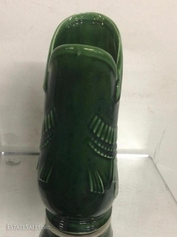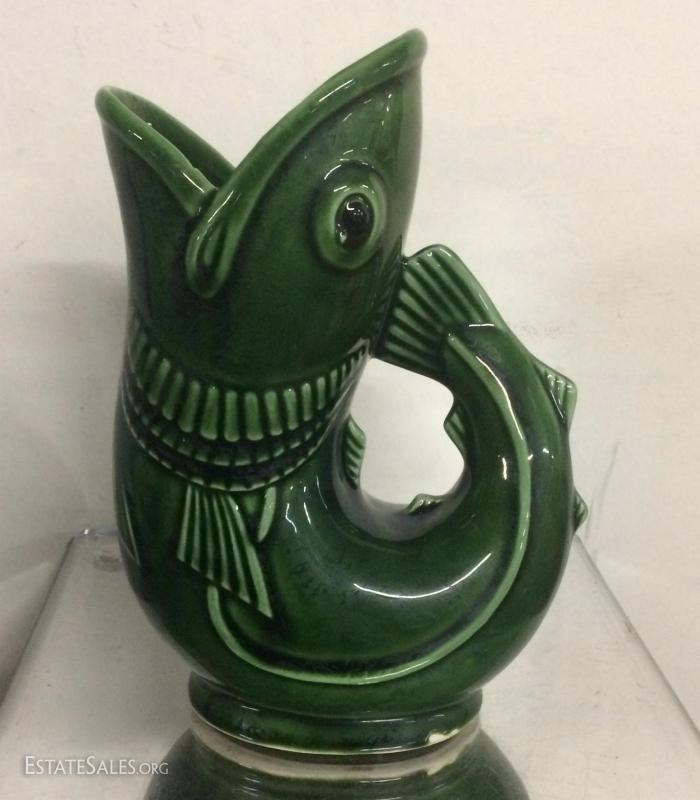 Vintage Gurgling Fish Pitcher-This green fish-shaped water jug gurgles when it pours. Gluggle jugs were first produced in the late 1800s in Staffordshire. Can also be used as decorative vase. Great collectible and conversation piece.