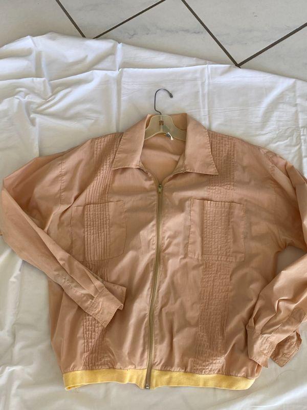 Vintage peach colored shirt from Haband. Retro zipper front long sleeve, great as a shirt or light jacket. Size XL. The waist band has faded to a different color. Good vintage condition.