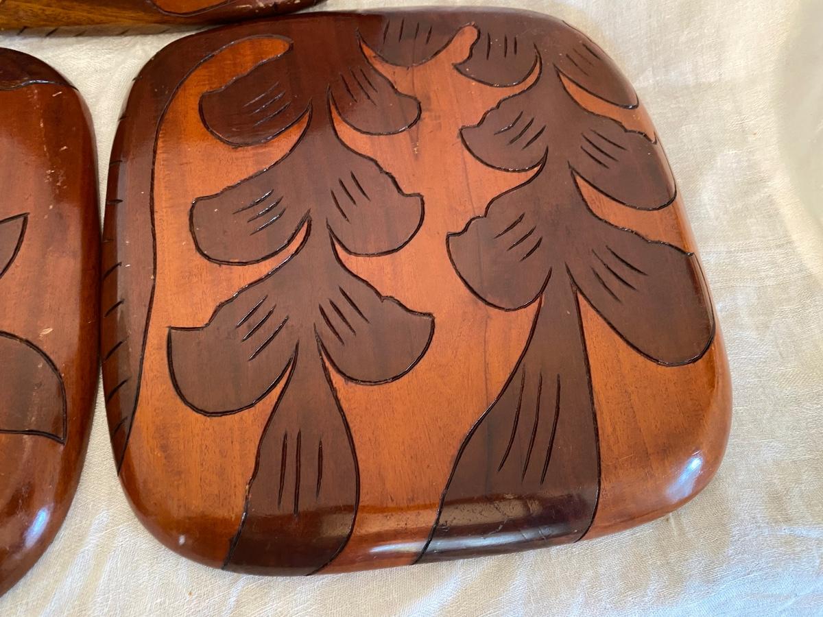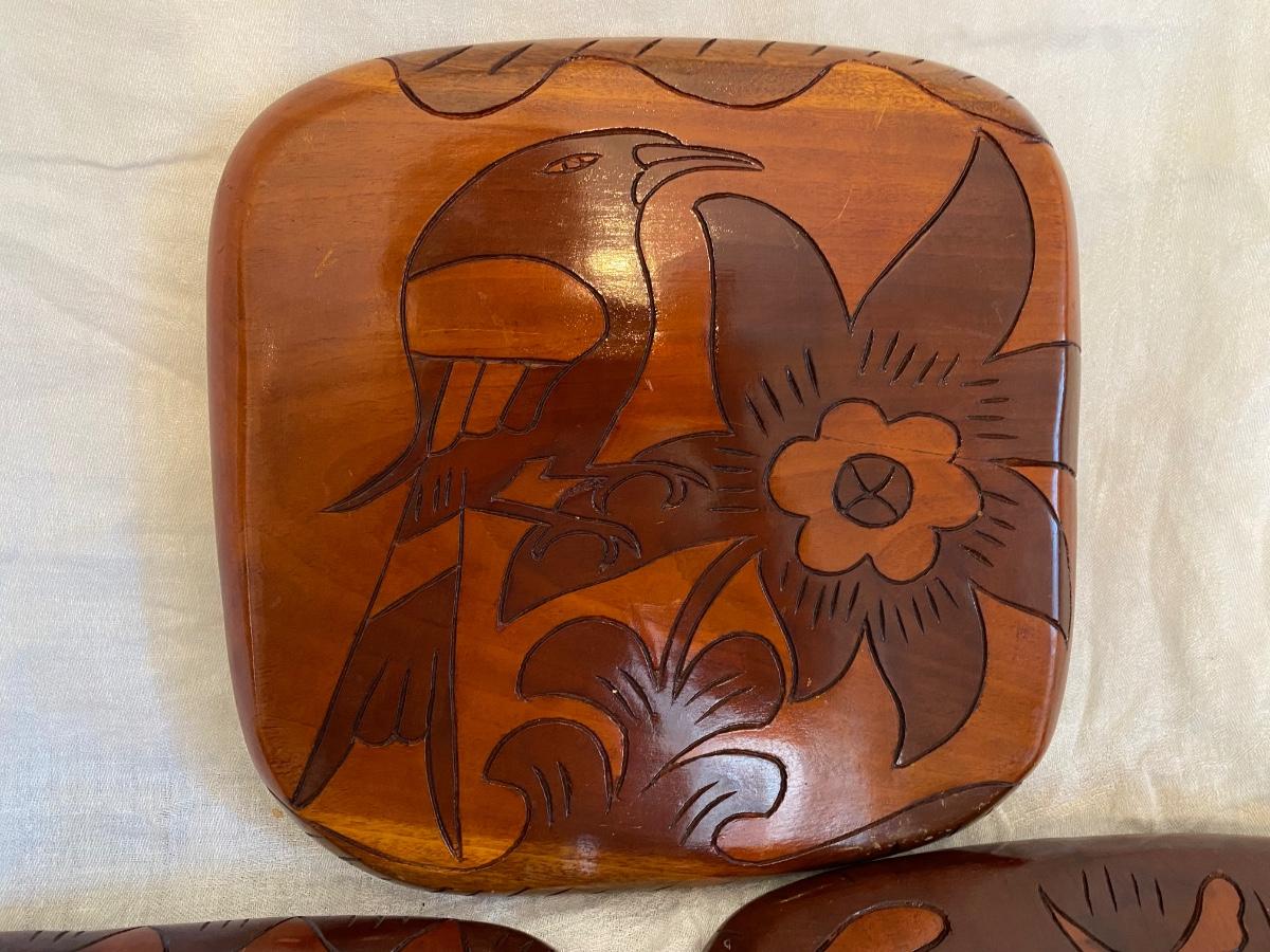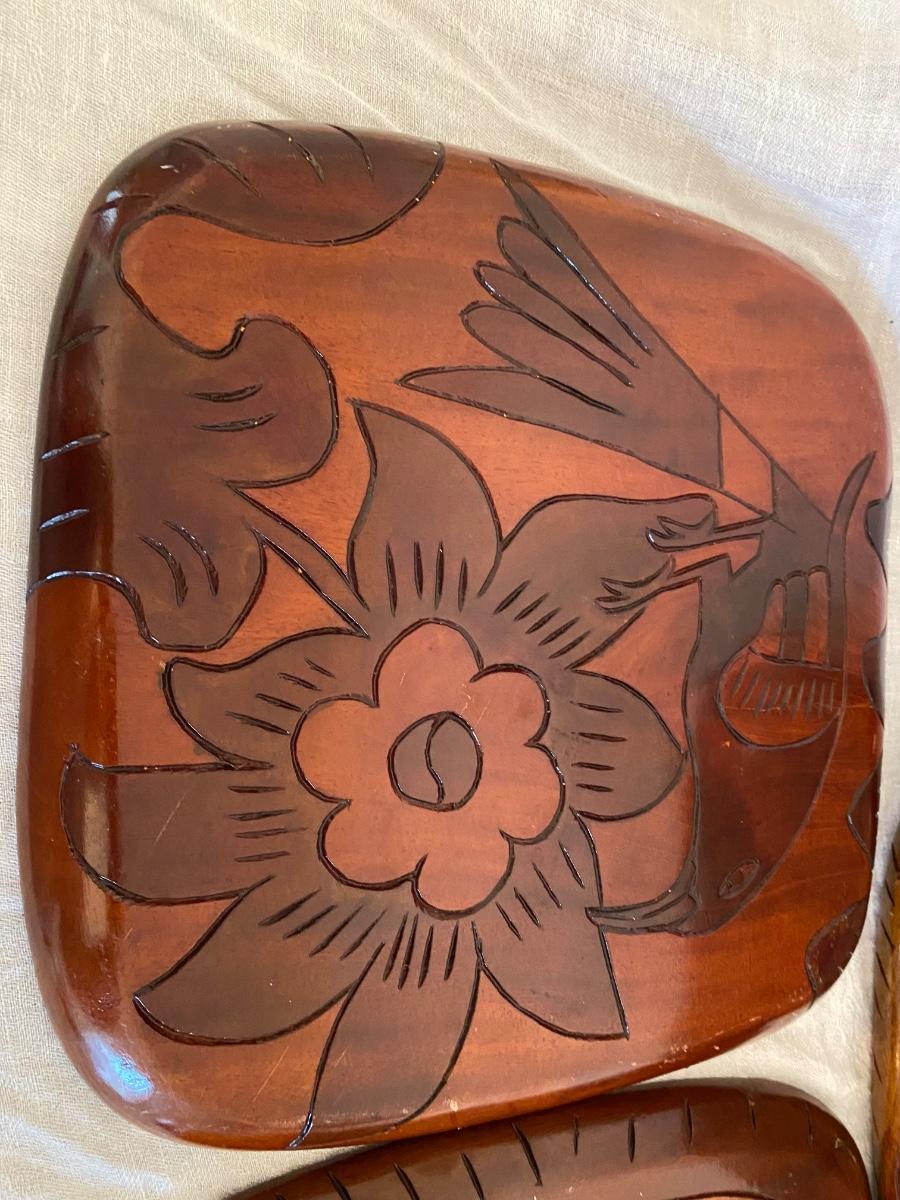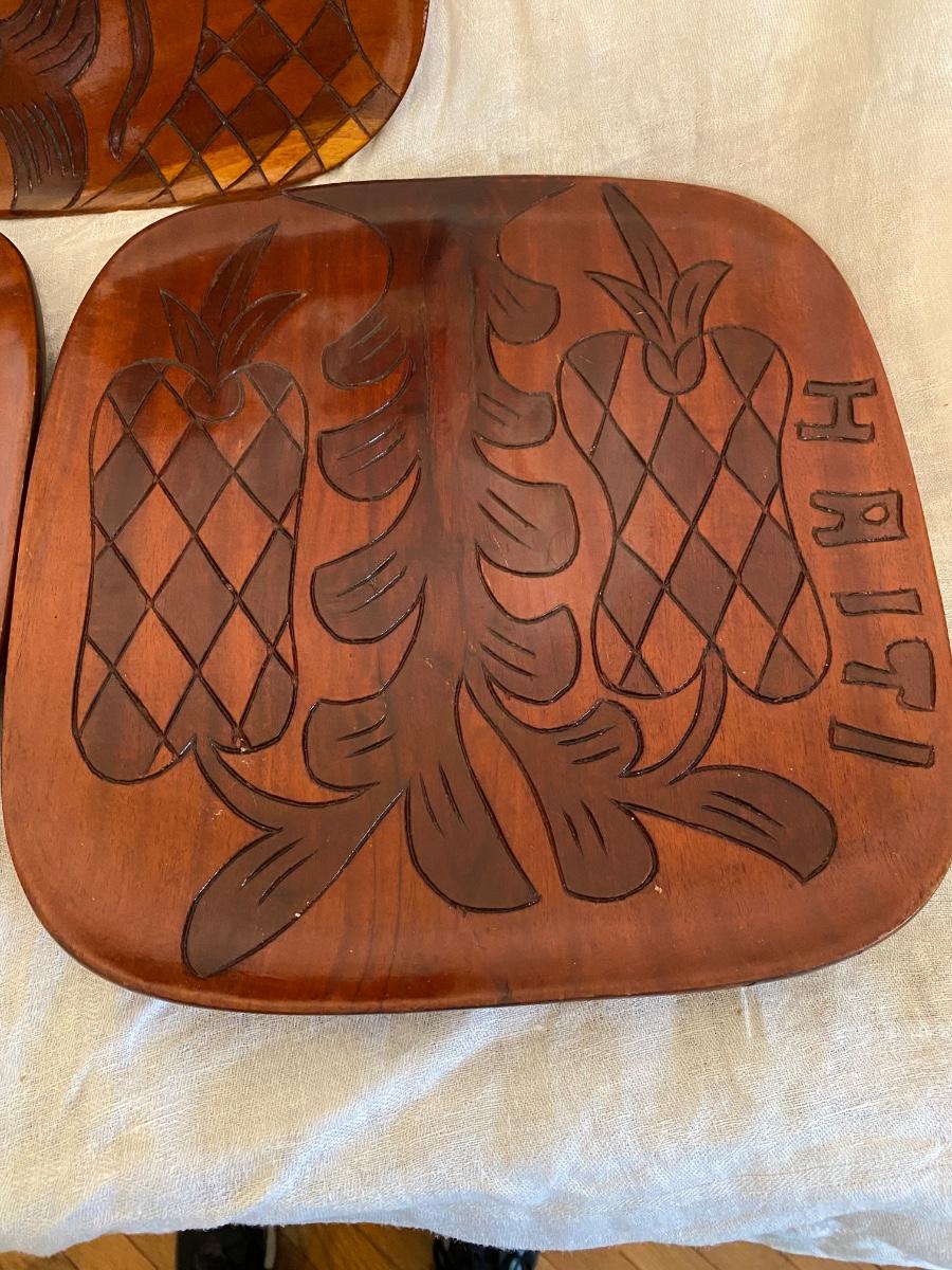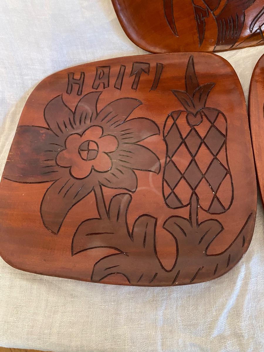 Vintage Haitian Folk Art Hand Carved Trays Wall Decor, handmade and originates from Haiti. CAnbe used for display or used as tray. Double sided images. Solide wood. Measures approx 11"x12", 1" thick. Set of 3. WAter marks on one tray, very faint.