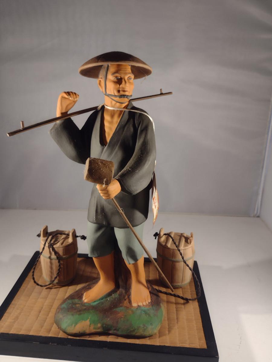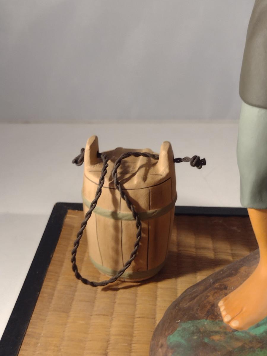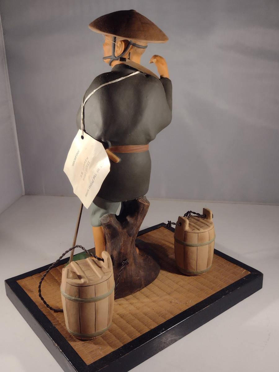 Vintage Hakata Urasaki Japanese Clay Figurine with Mat- Honey Bucket (#7). Item has damaged bucket- please see all pictures for condition.