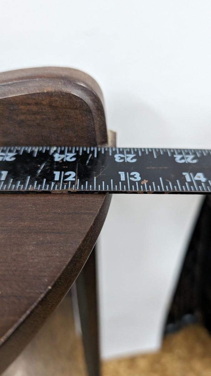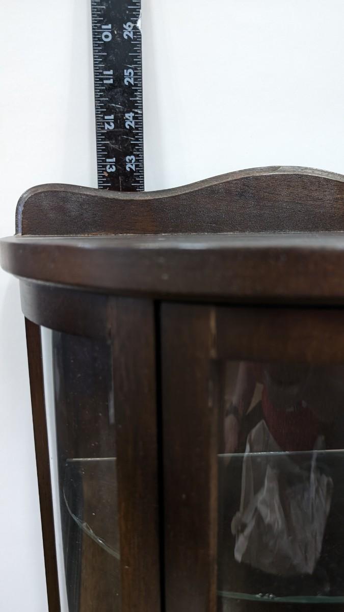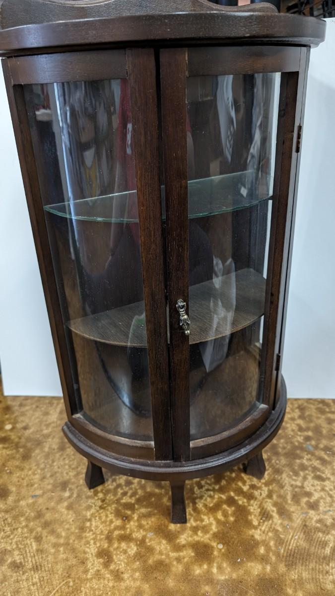 Vintage wooden and glass half circle miniature display curio cabinet with a wooden shelf and a glass shelf insert. Approximately 13" x 23" x 6.5"