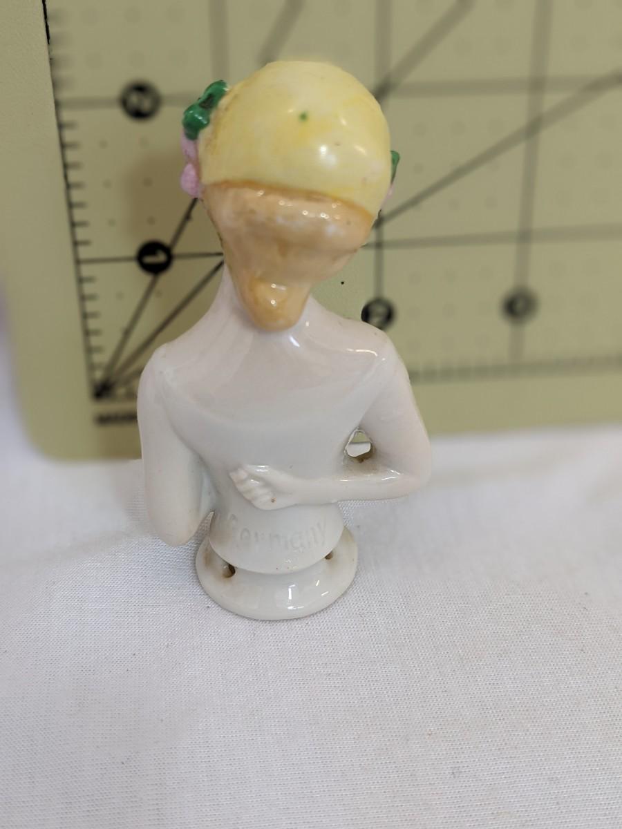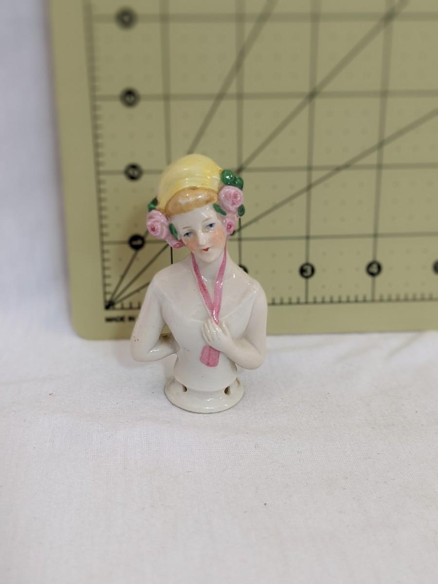 Vintage Half Doll Pin Cushion Floral Hat Arm Behind Back 5160 Germany Porcelain