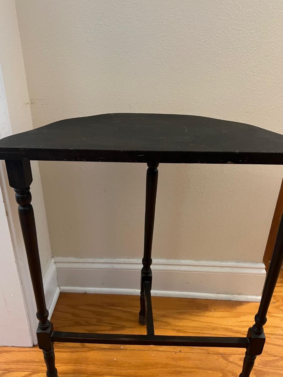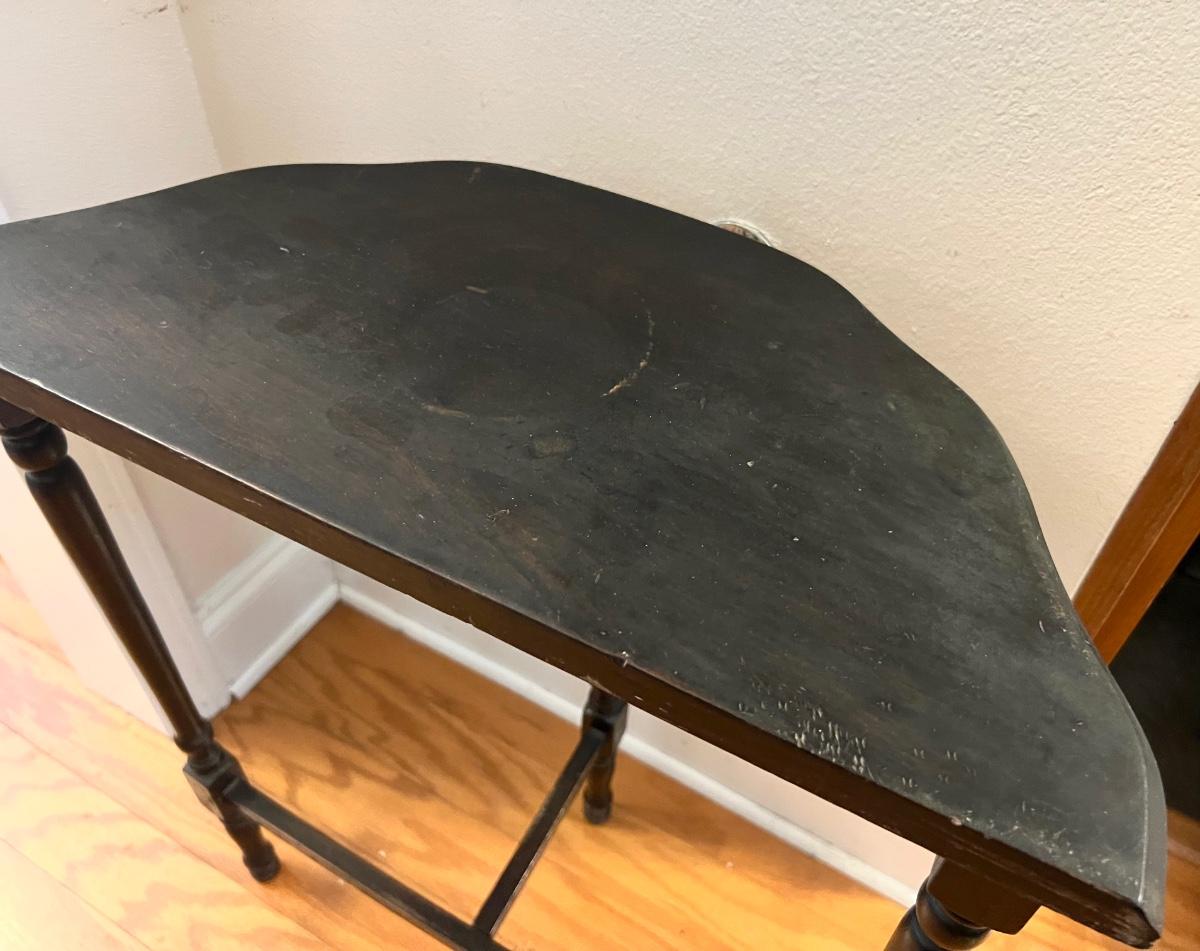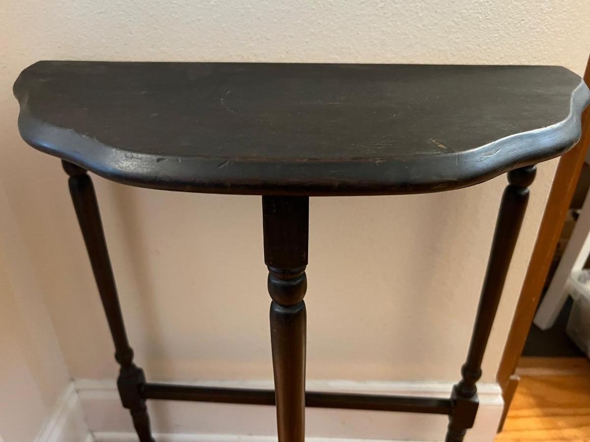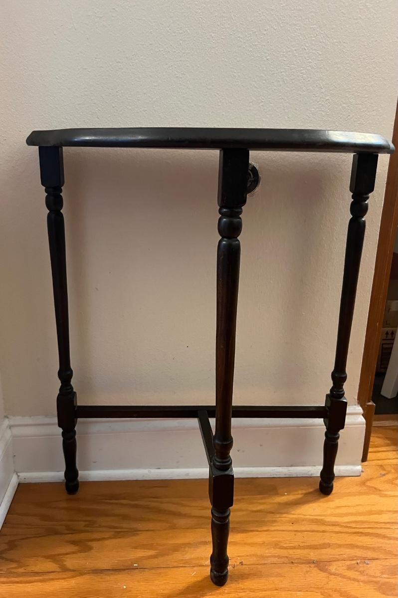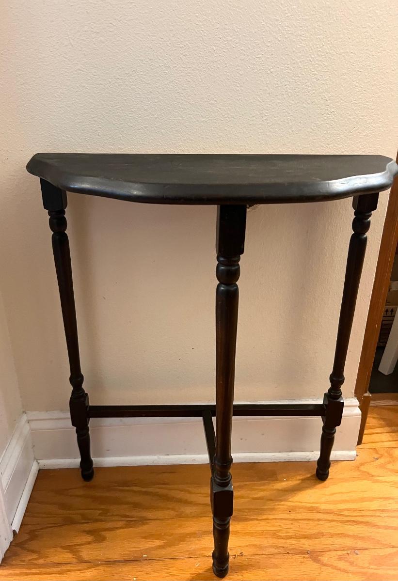 Grand Aunties Vintage Half Moon 3 Legged End Table. This table is old, does show some signs of use and a faint ring on the top. See pictures for condition. Measures 24 1/2 tall, 21 inches wide and 10 inches deep.