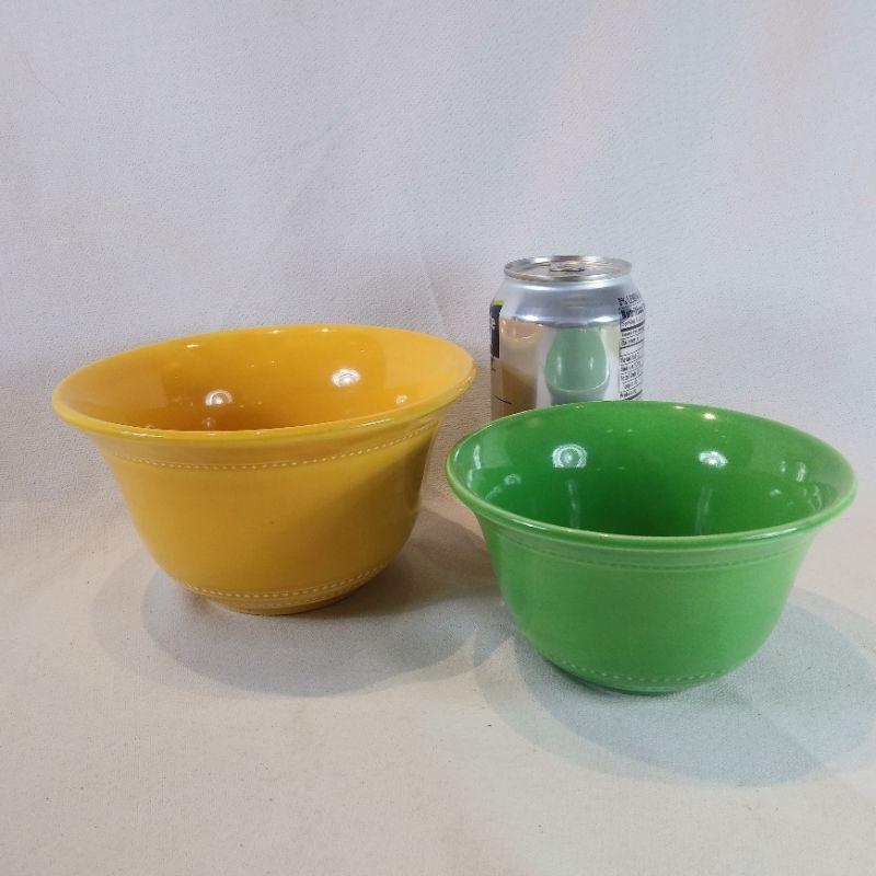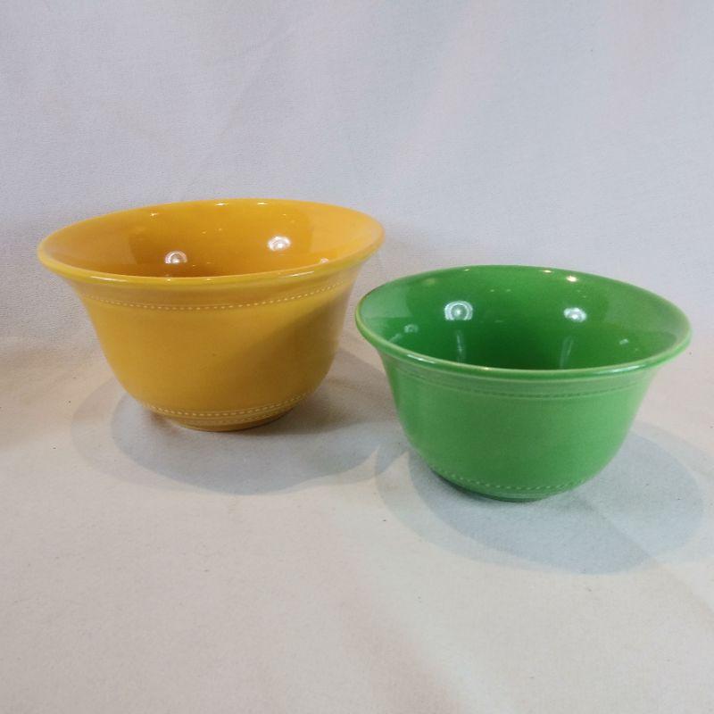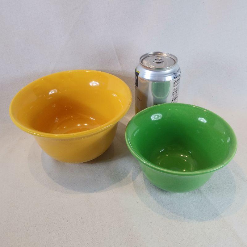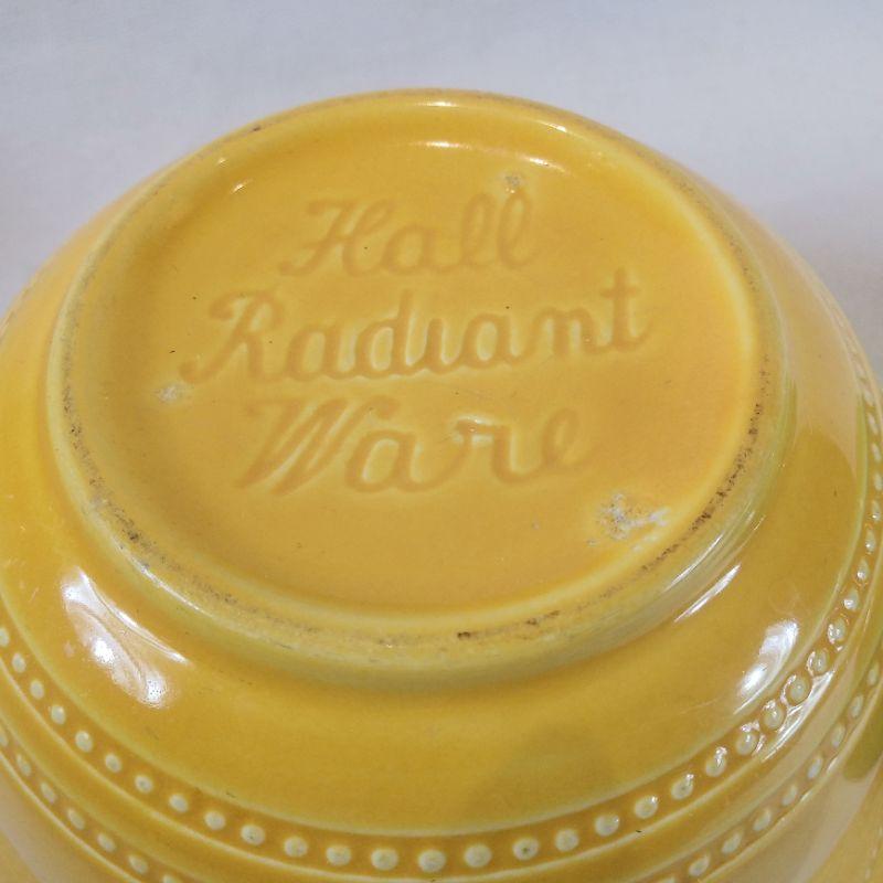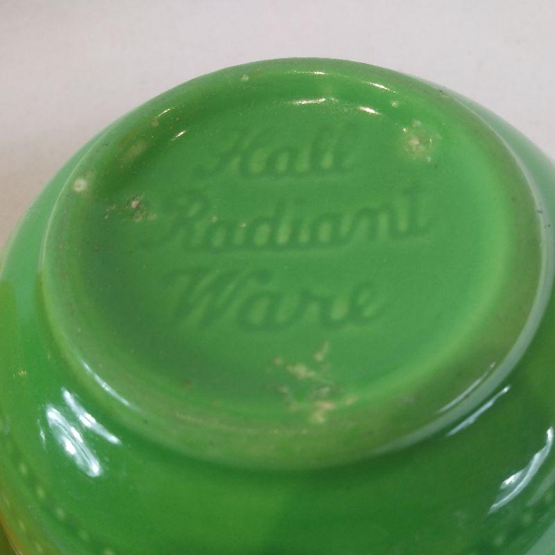 Hall Radiant Ware. Two rare small flared bowls that appear to be unused. The yellow is 6 1/2-inches in diameter X 3 3/4-inches tall. The green one is 5 1/2-inches in diameter X 3-inches tall. Very good condition.