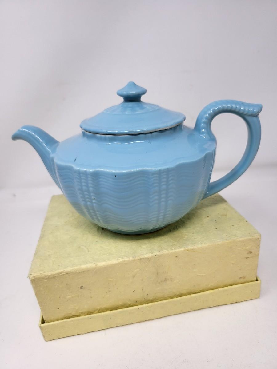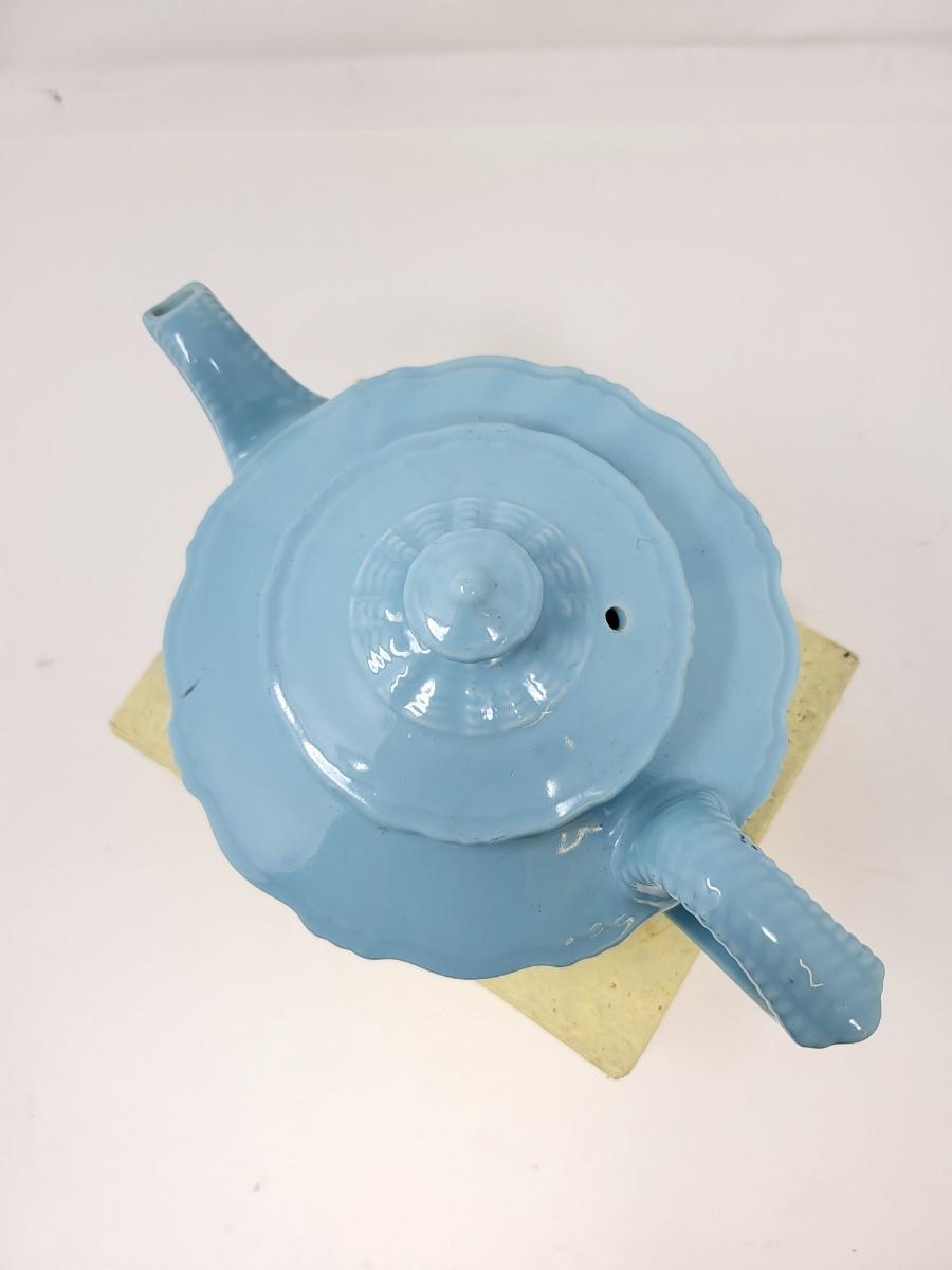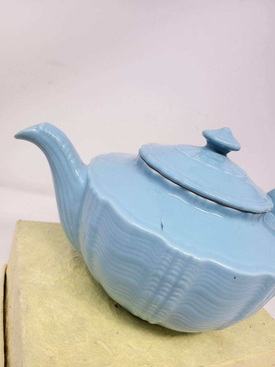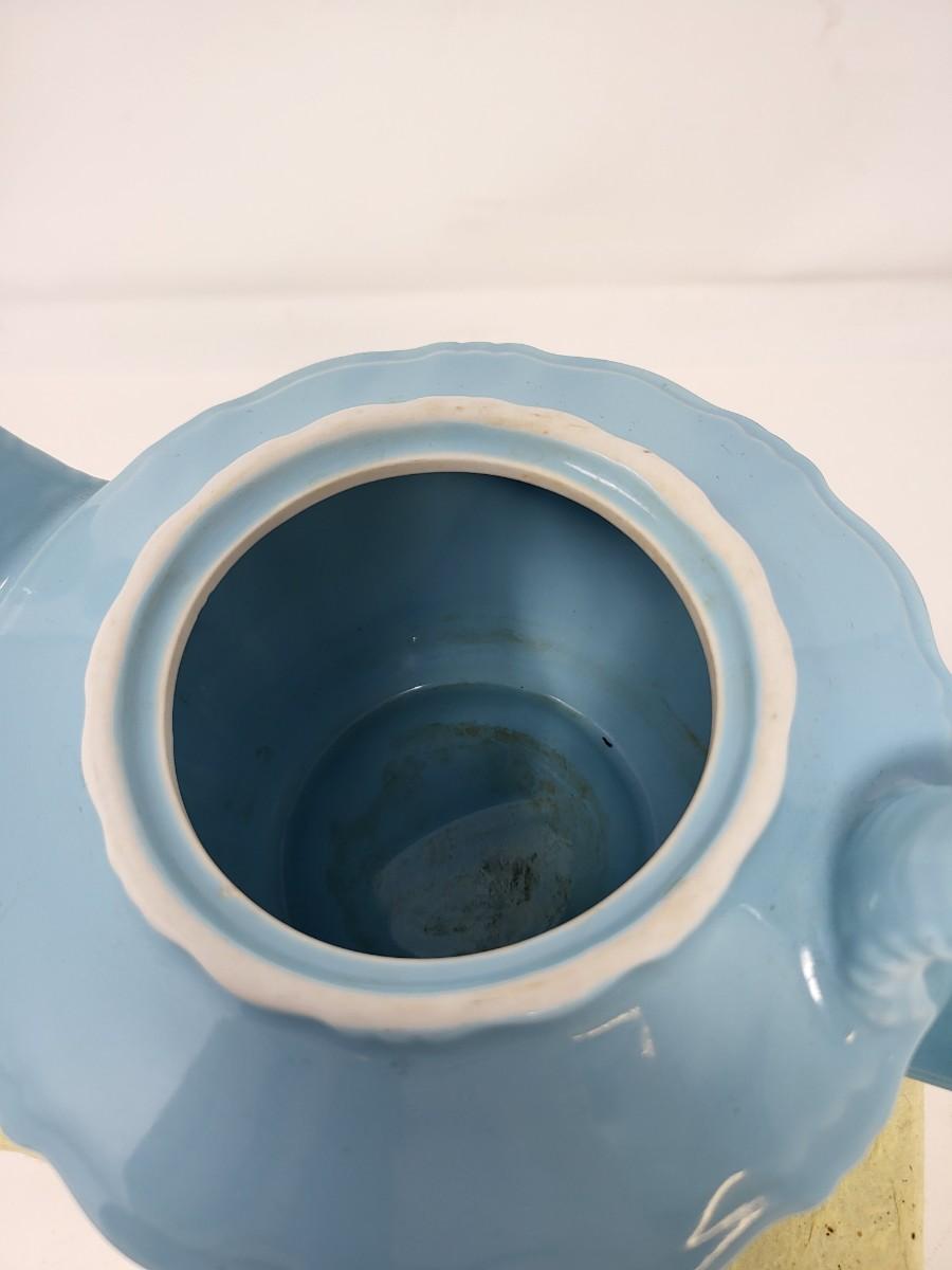 Hall pottery teapot. 10" long x 6.5" wide x 5" tall. Periwinkle blue. No chips or cracks.