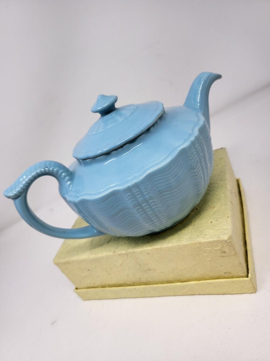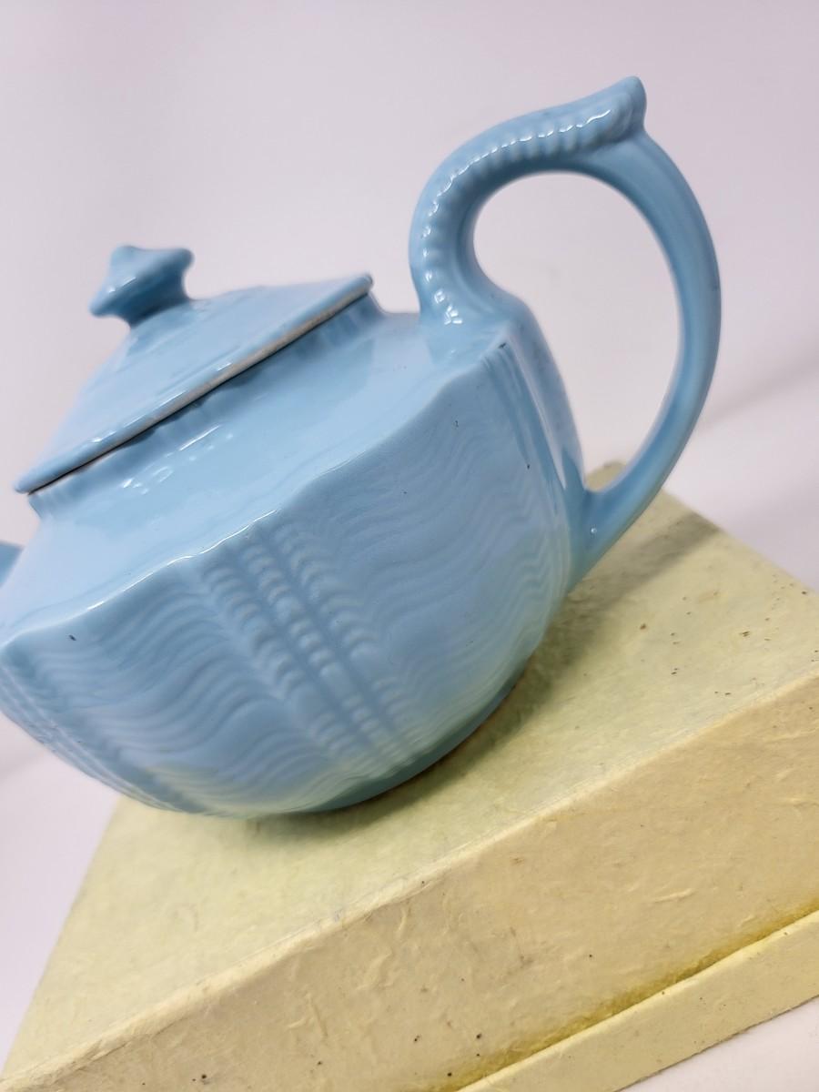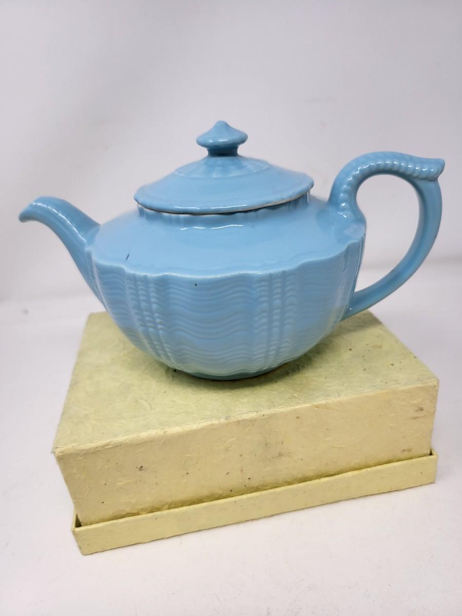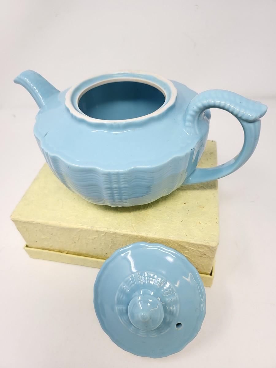Hall pottery teapot. 10" long x 6.5" wide x 5" tall. Periwinkle blue. No chips or cracks.