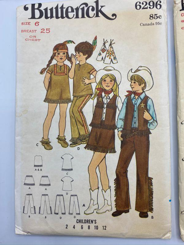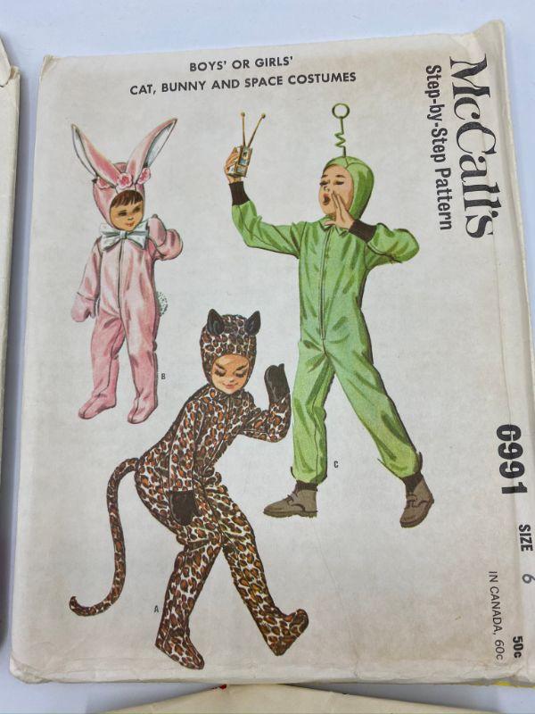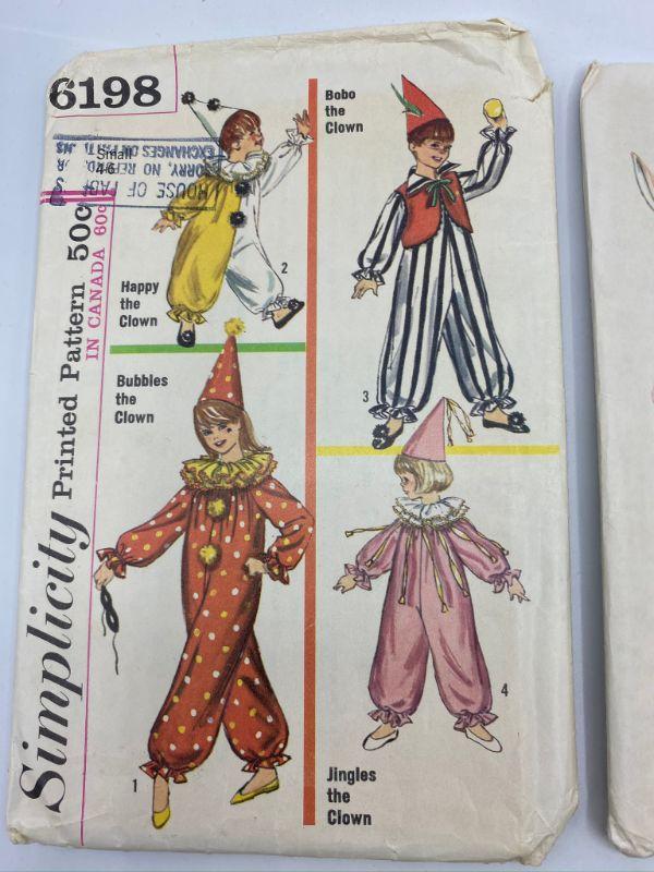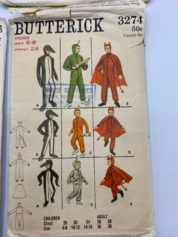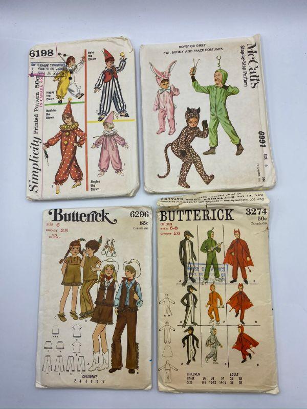 4 vintage Halloween costume patterns. Clowns, Cowboys & Indians, Animals, Devil, and Space Aliens. Previously owned, well taken care of. Some of the patterns may be used/cut. Previous owner took time to refold all of the pieces neatly included the cut pieces. Not sure if they are complete.