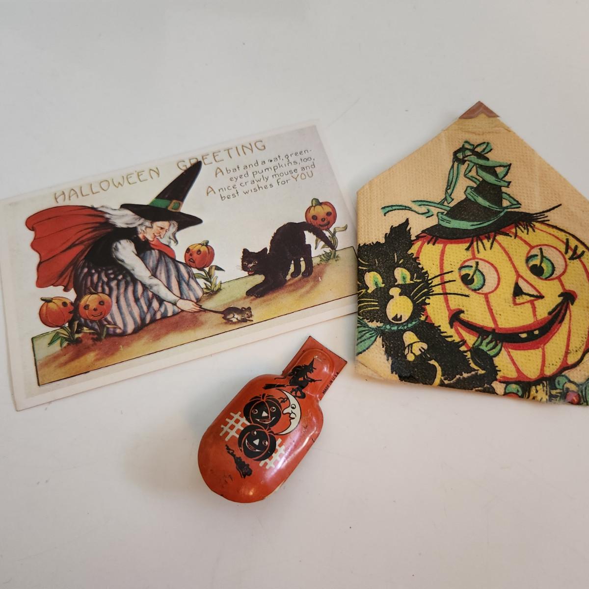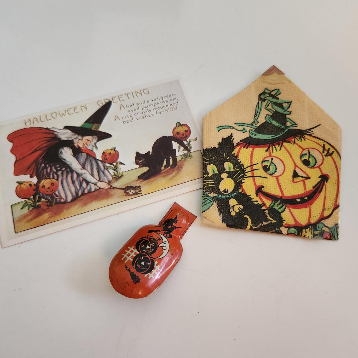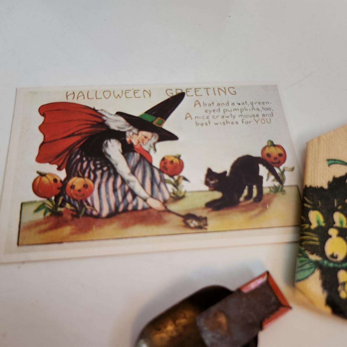 This auction lot is for Vintage Halloween Items. The clicker is the premo item in this grouping. It still works and has some very fun graphics. The napkin fell out of a scrap book but has some age. The post card is a recent reproduction of an old postcard.