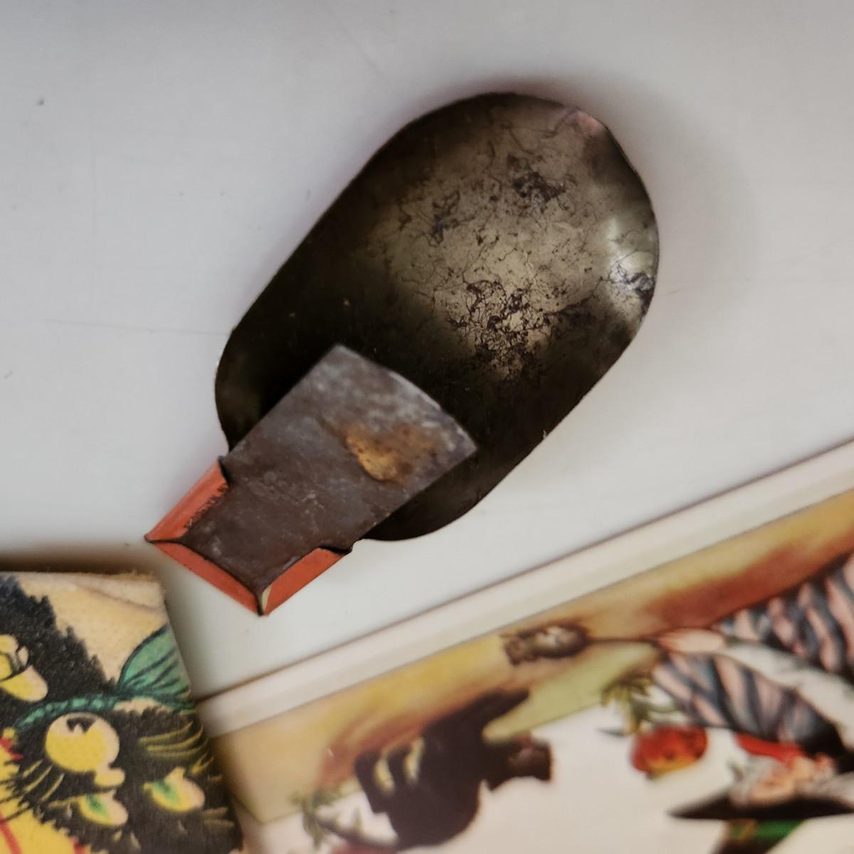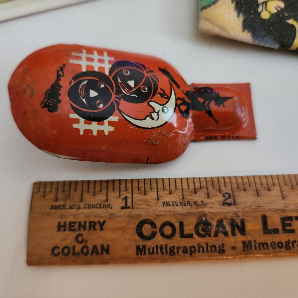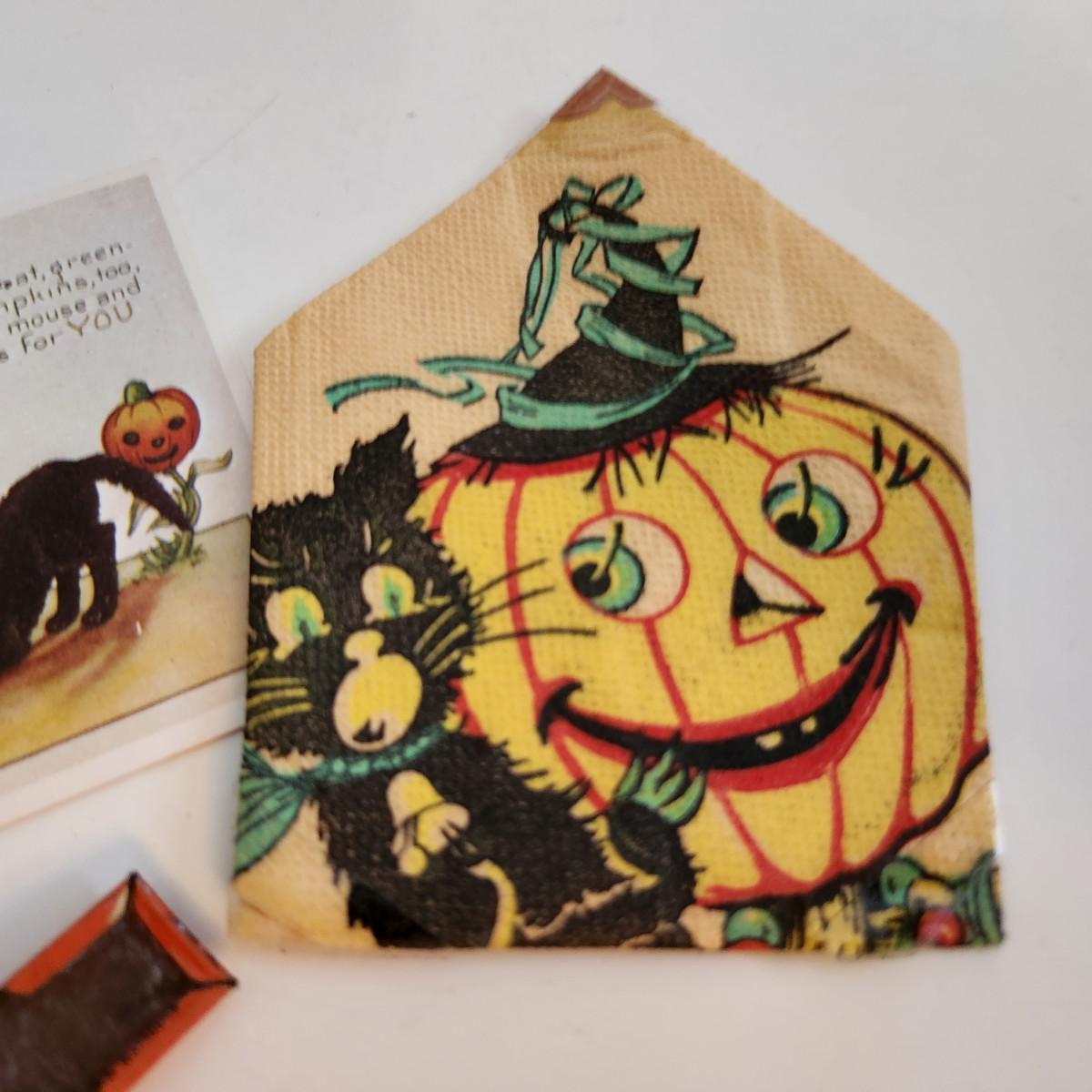 This auction lot is for Vintage Halloween Items. The clicker is the premo item in this grouping. It still works and has some very fun graphics. The napkin fell out of a scrap book but has some age. The post card is a recent reproduction of an old postcard.