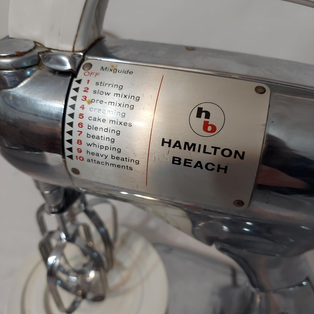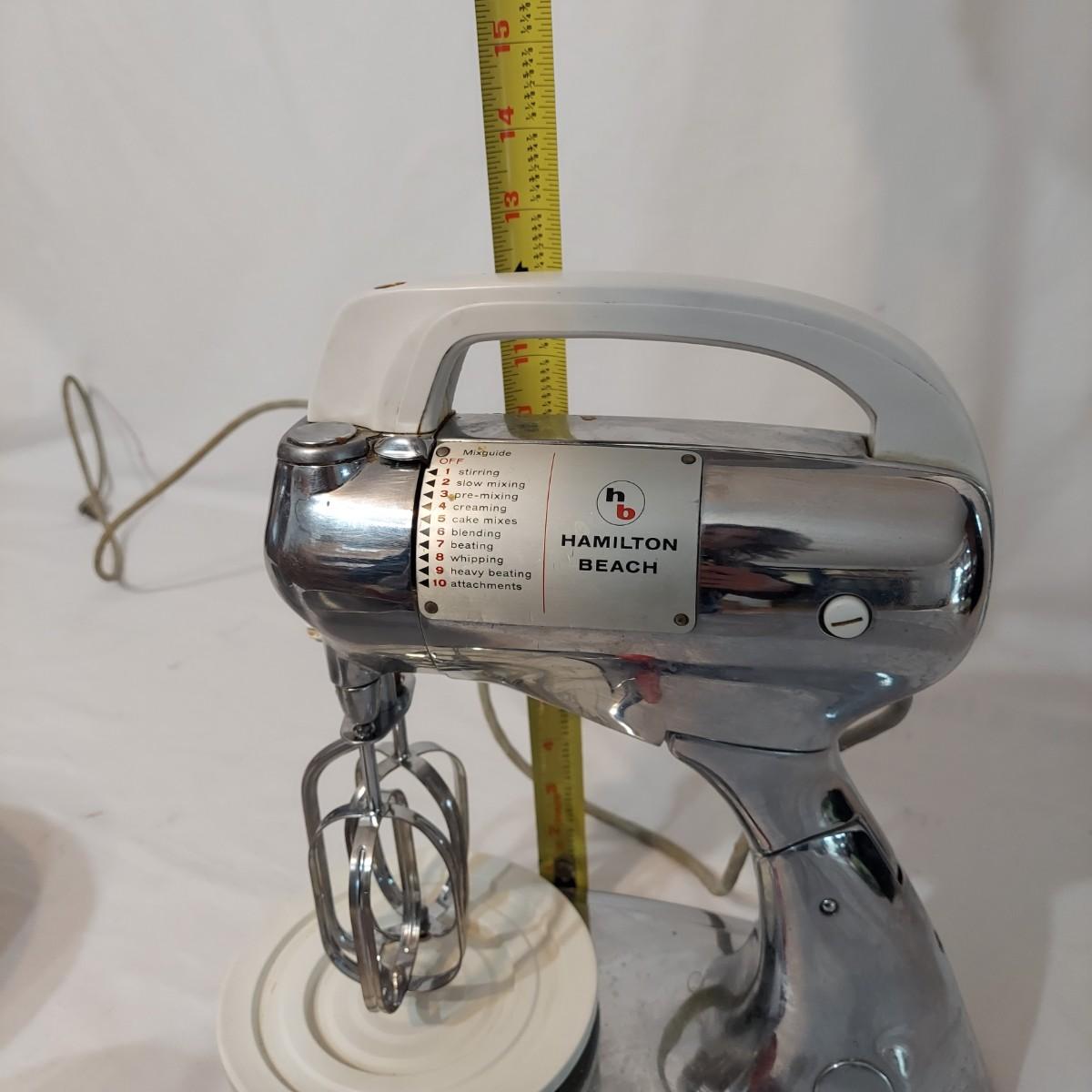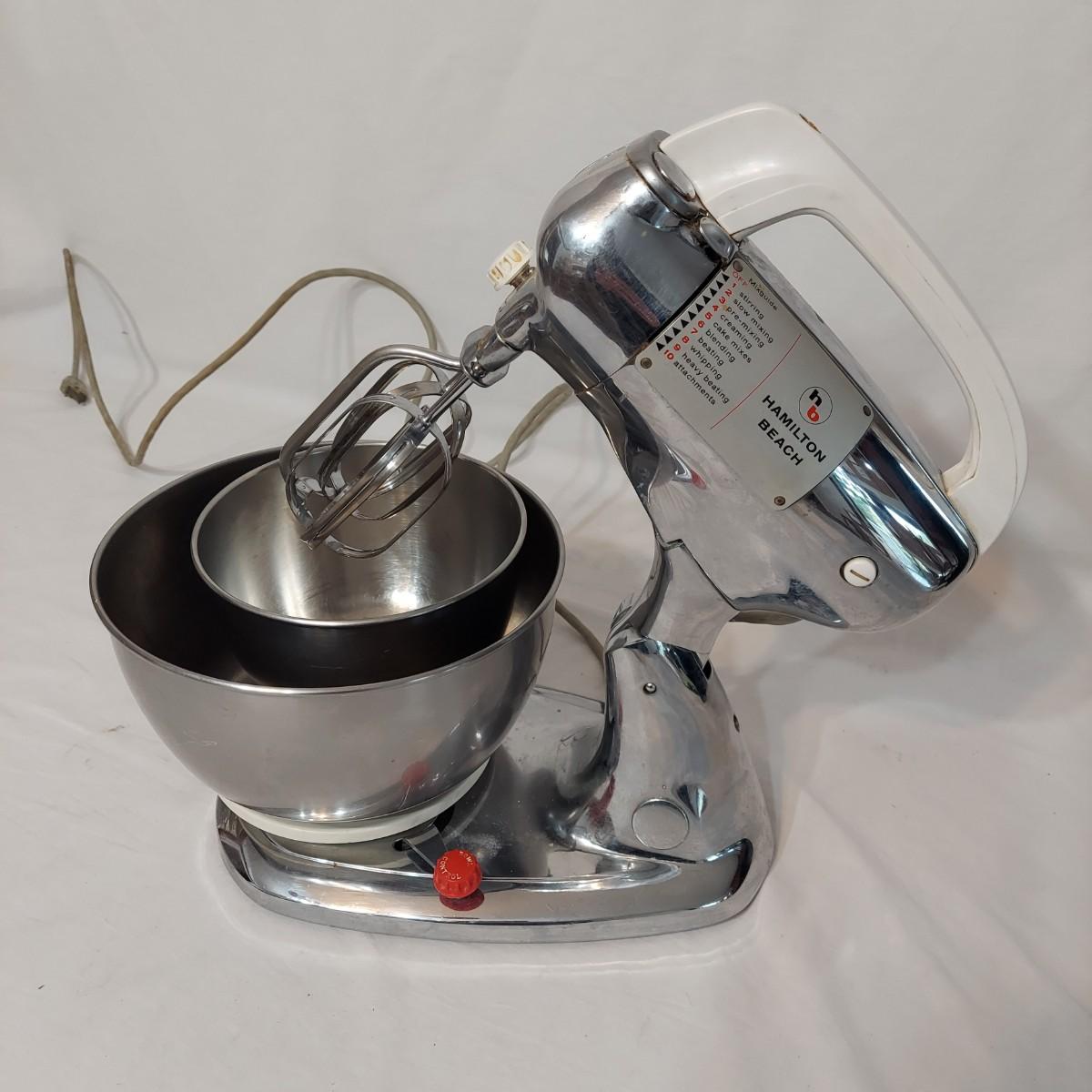 Vintage Hamilton Beach 10 speed stand mixer with two stainless steel bowls. The larger bowl is 8.5"D. The smaller is 6"D. The mixer stands 12"H. This item was plugged in and powered on. Please see photos for details. Local Pickup Only