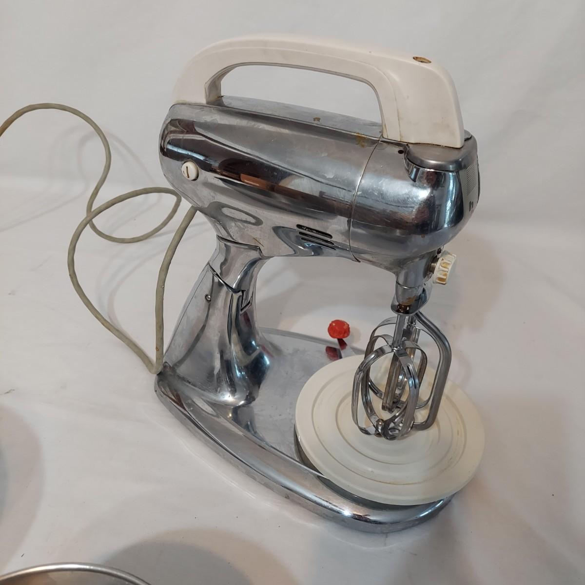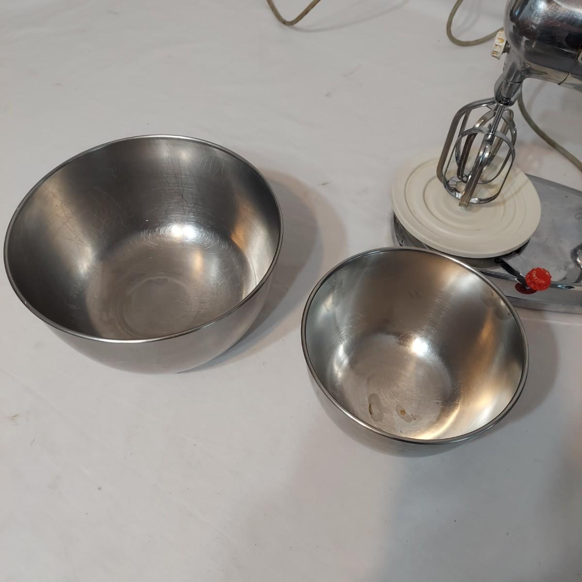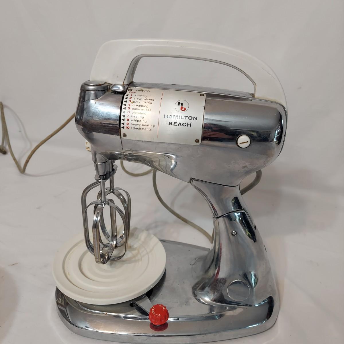 Vintage Hamilton Beach 10 speed stand mixer with two stainless steel bowls. The larger bowl is 8.5"D. The smaller is 6"D. The mixer stands 12"H. This item was plugged in and powered on. Please see photos for details. Local Pickup Only