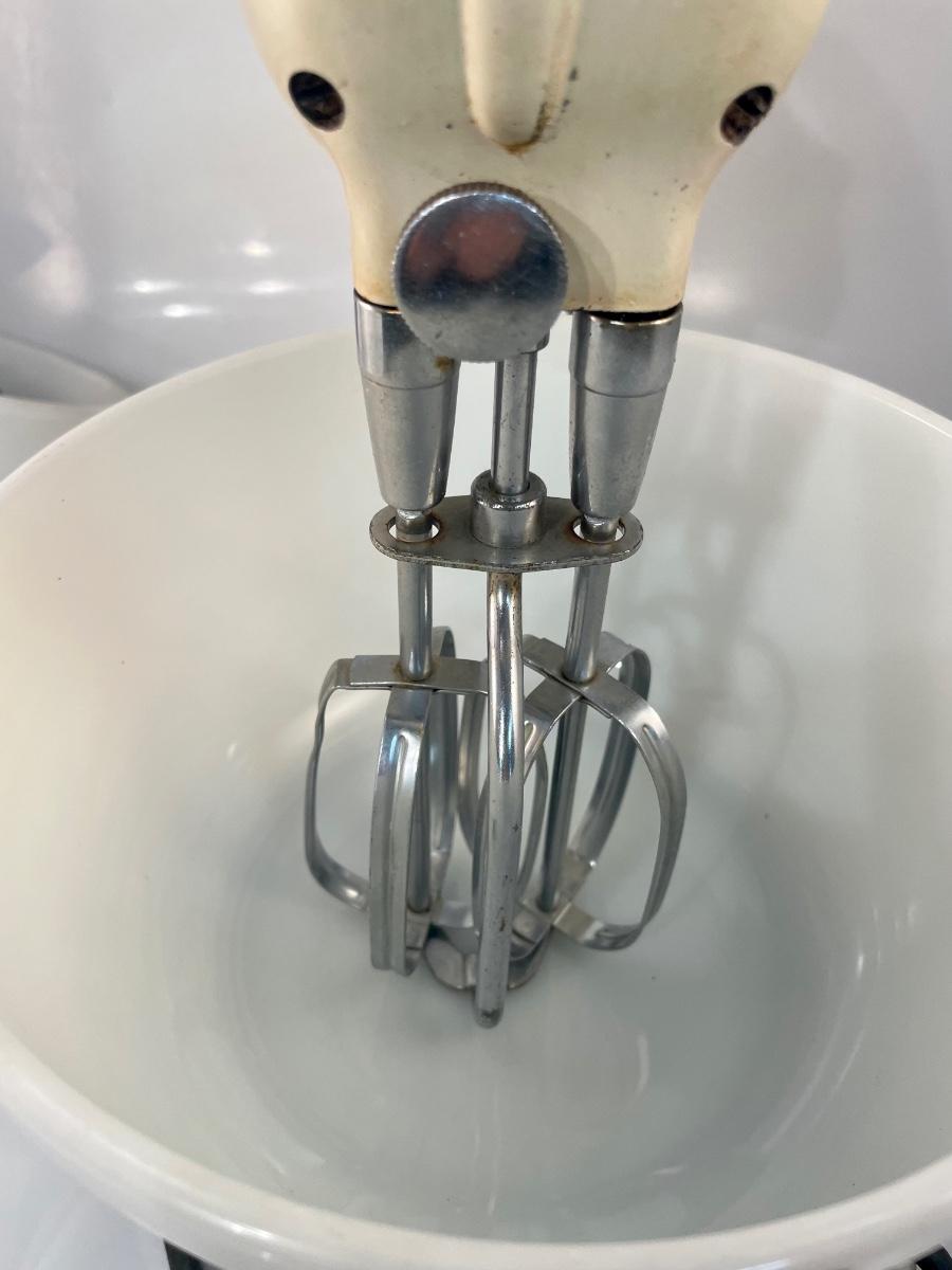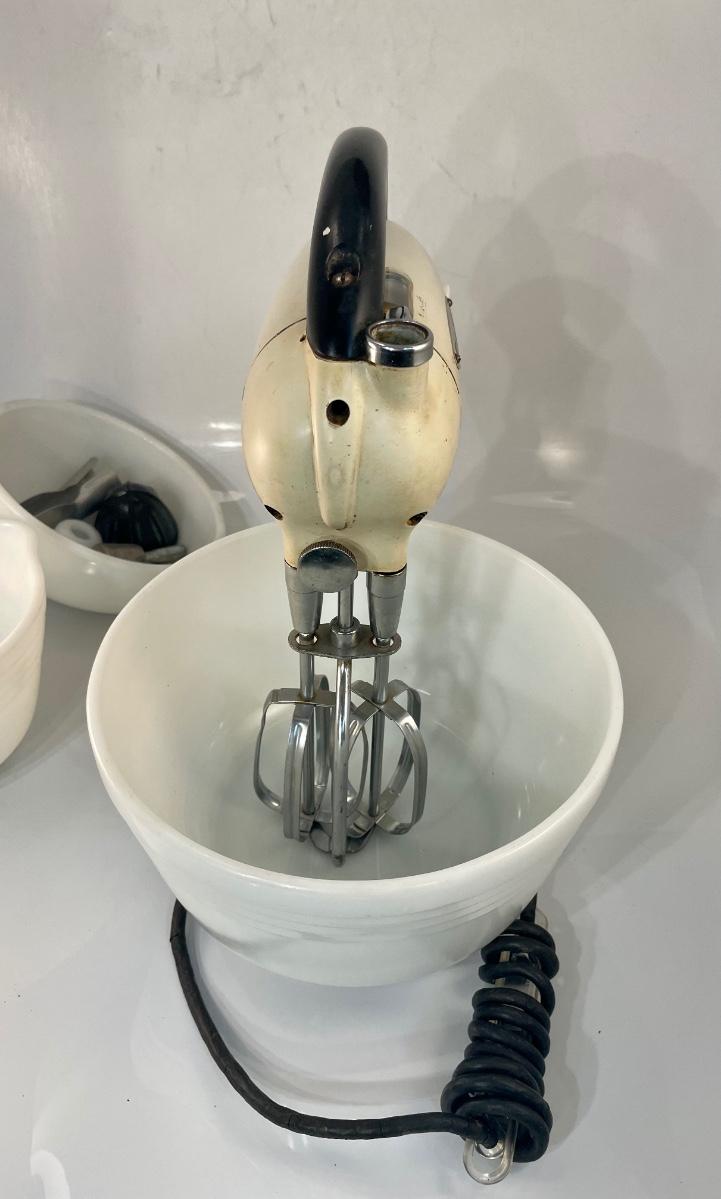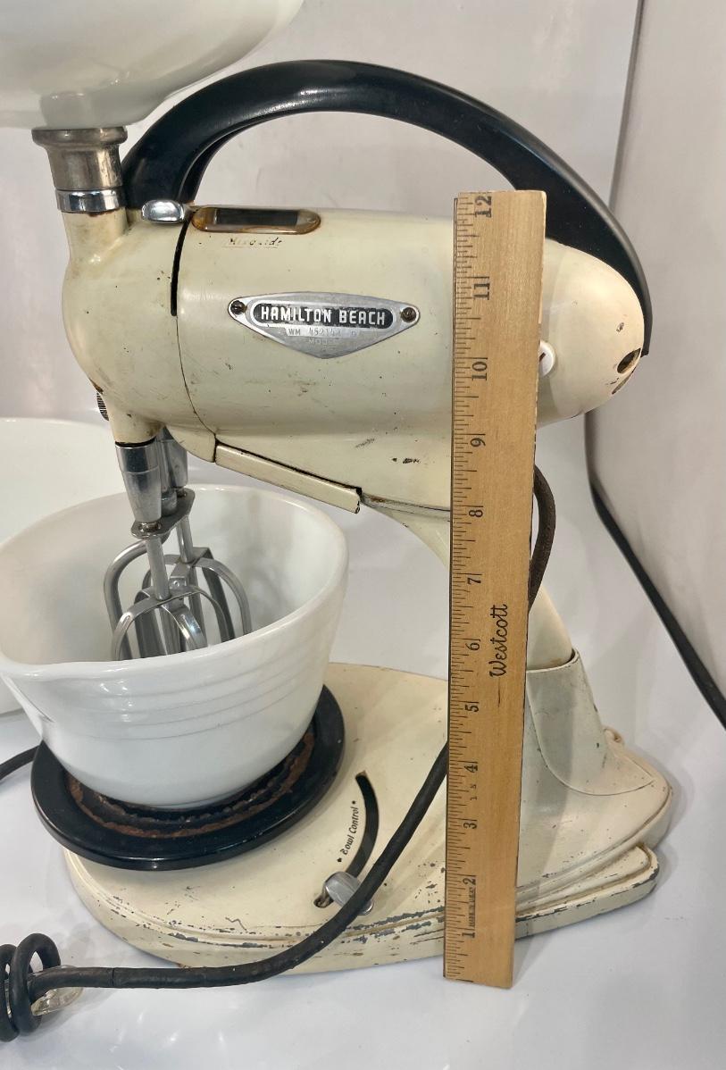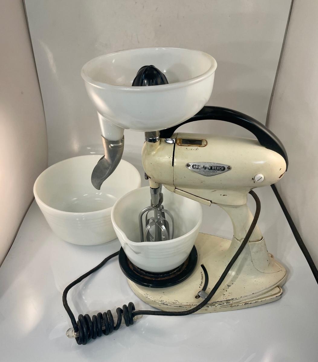 Vintage Hamilton Beach Stand Mixer Model G. Includes 2 milk glass bowles, a milk glass juicer bowl and accessories, and detachable beaters. Can be removed from base and used as a hand mixer. Tested, work great.