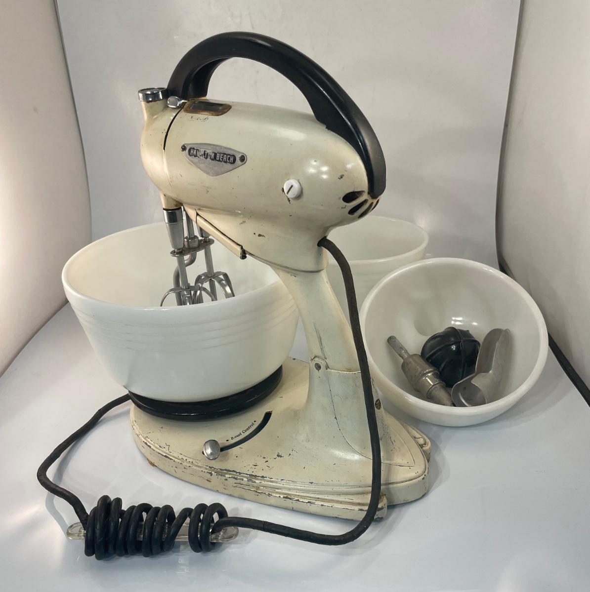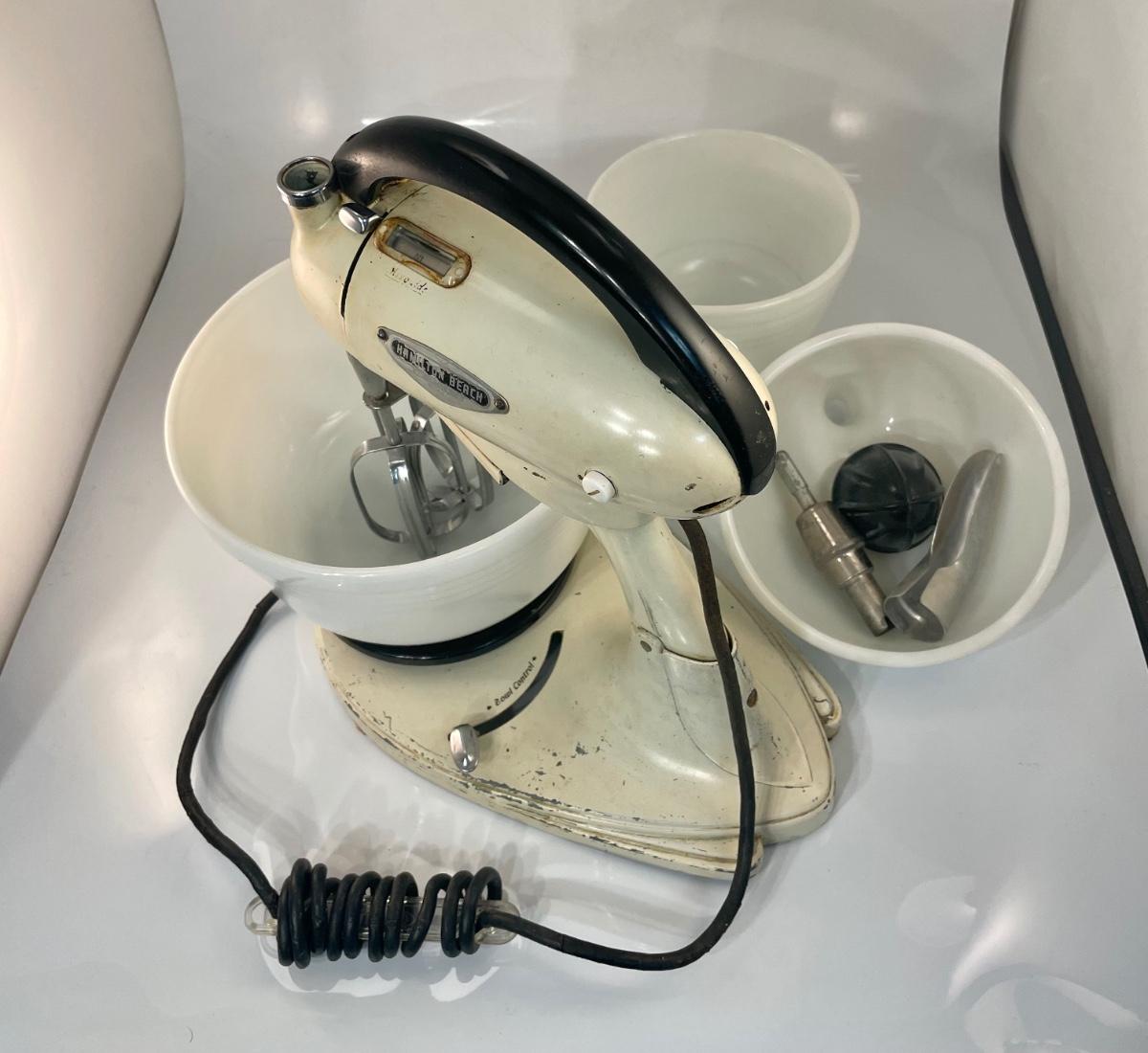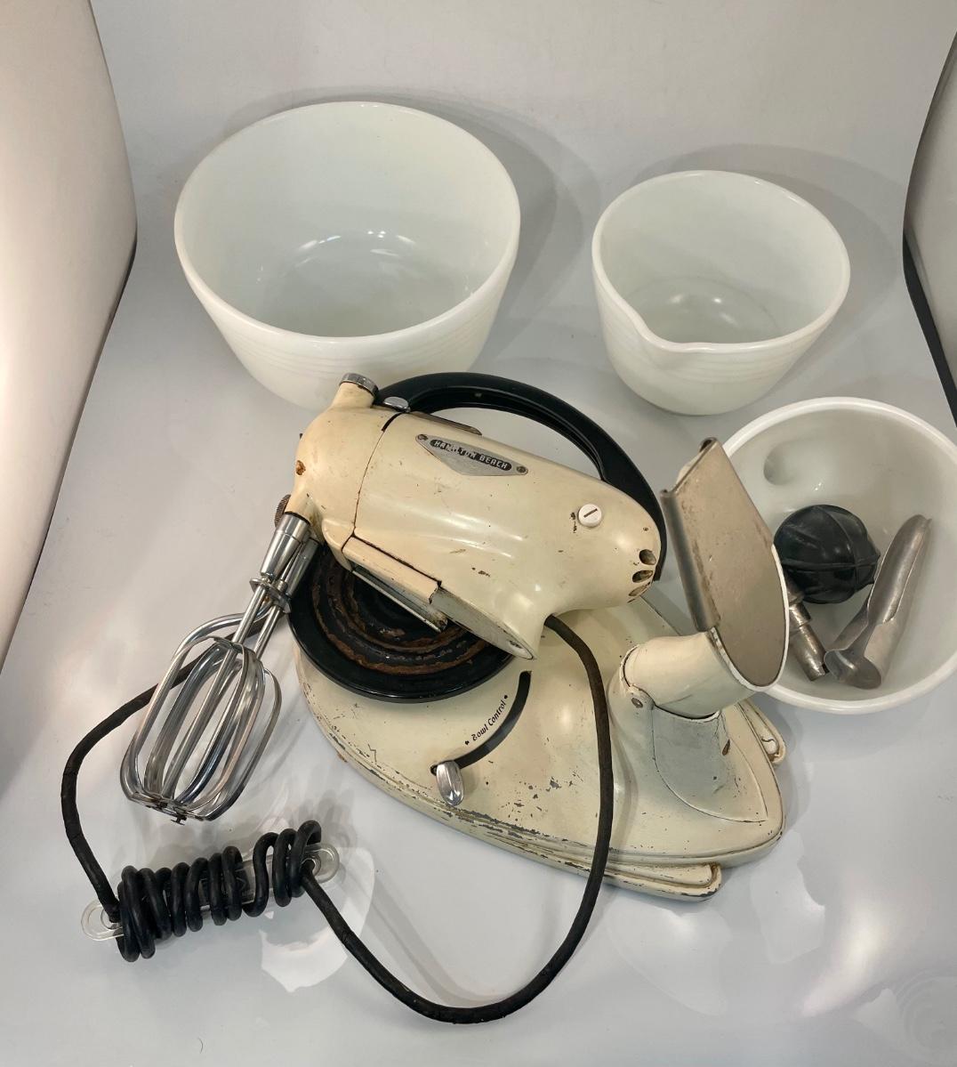 Vintage Hamilton Beach Stand Mixer Model G. Includes 2 milk glass bowles, a milk glass juicer bowl and accessories, and detachable beaters. Can be removed from base and used as a hand mixer. Tested, work great.