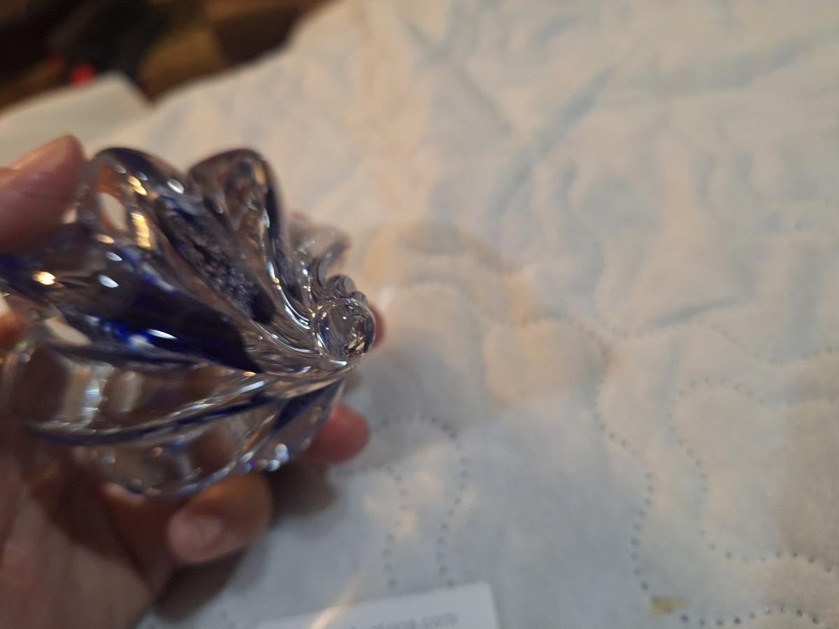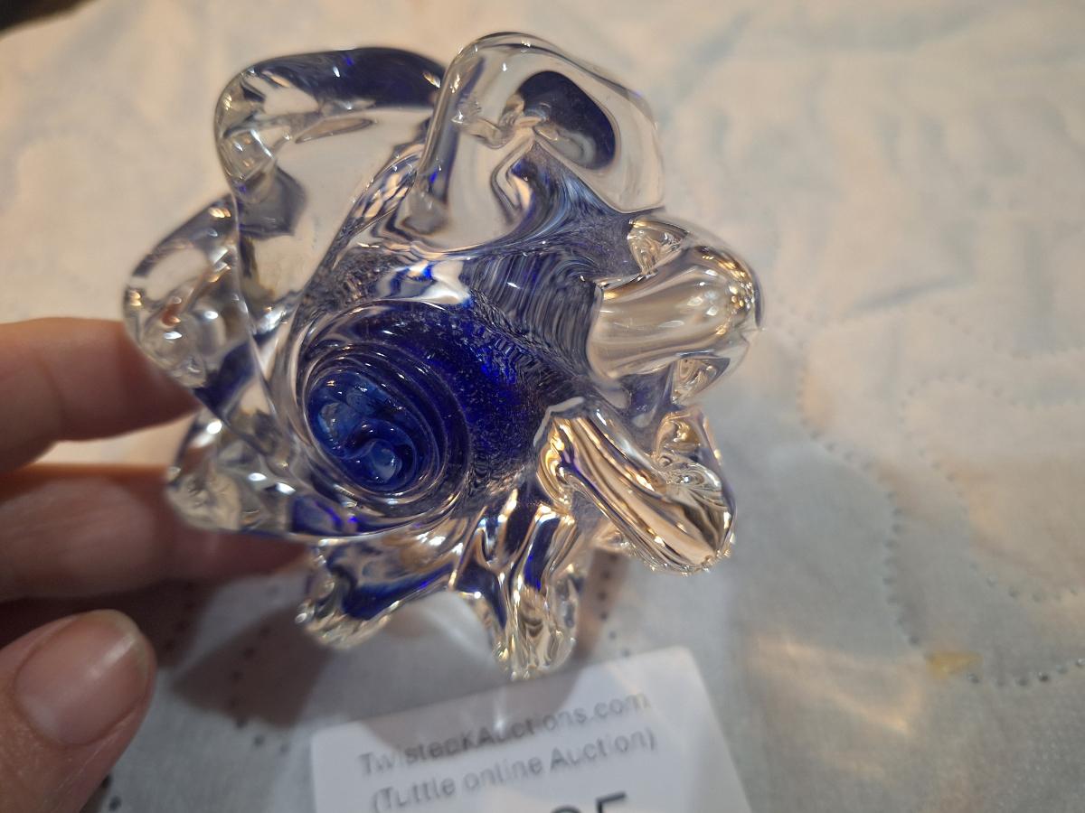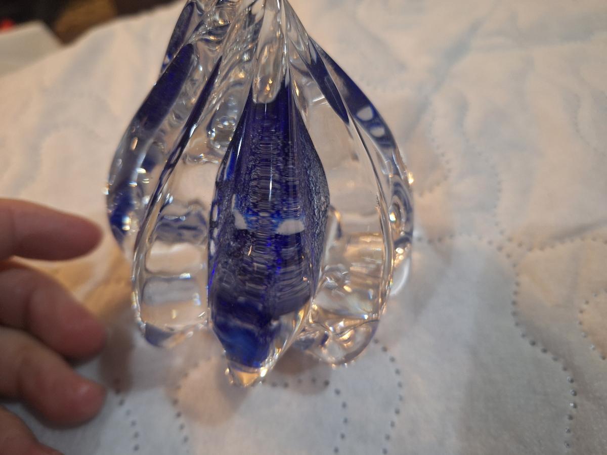 vintage hand blown shell shaped glass paperweight with blue center