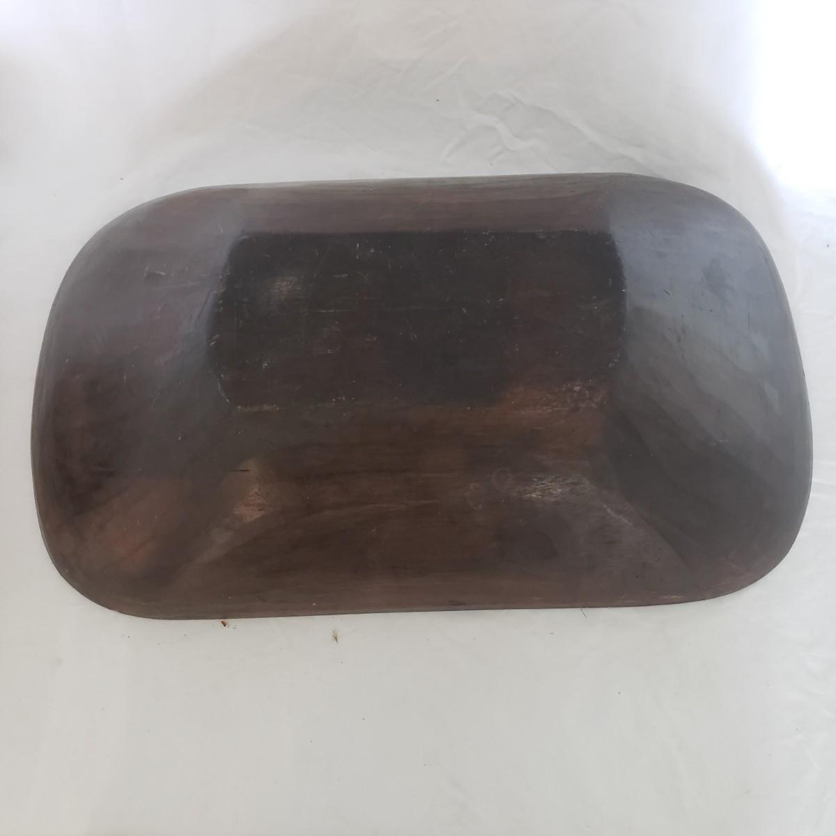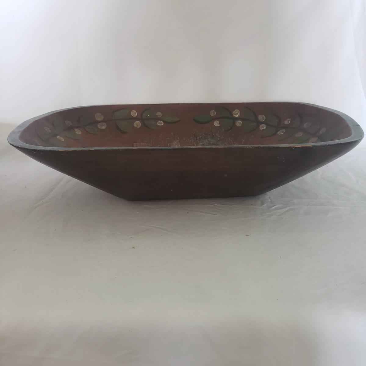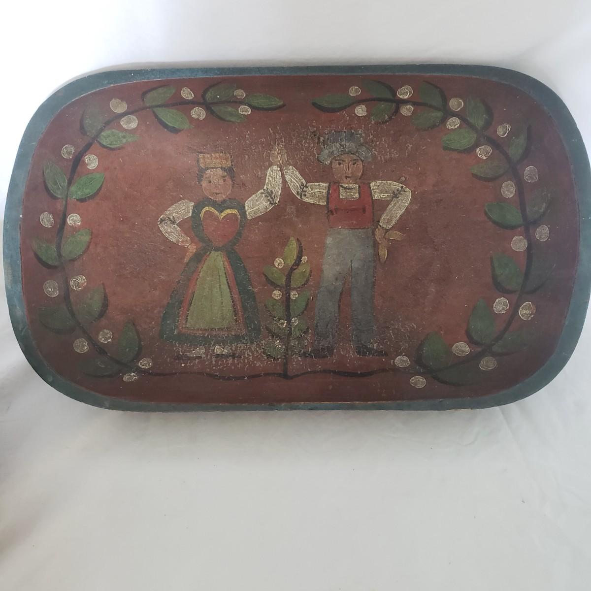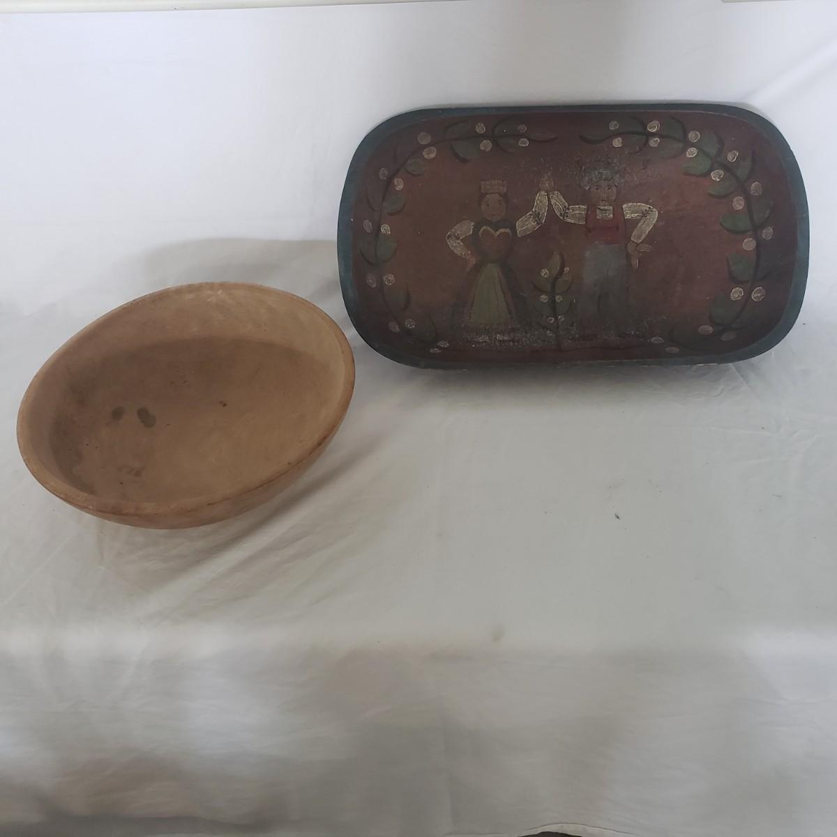 This lot features two wooden bowls. The larger bowl has a painted inside of an European couple. The bowl measures 20" x 12" x 5" H. The paint is chipping in some areas, see pictures. The Munising stamped bowl measures 13" x 4" H. This bowl has seen some love and has marks inside the bowl, see pictures.