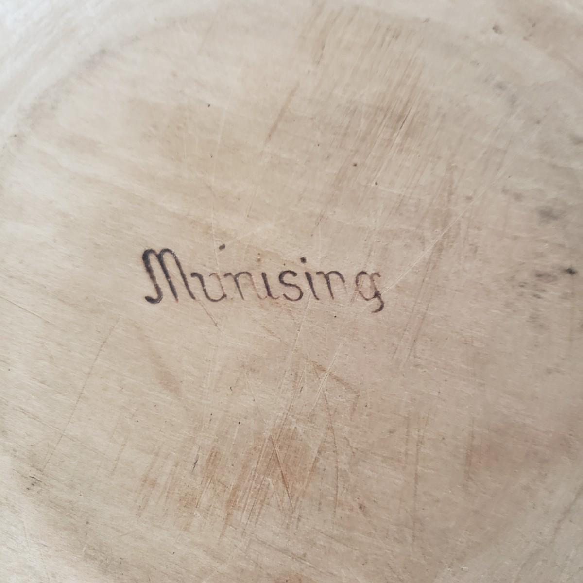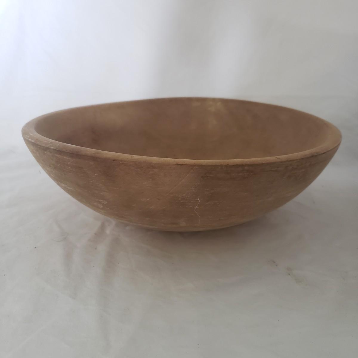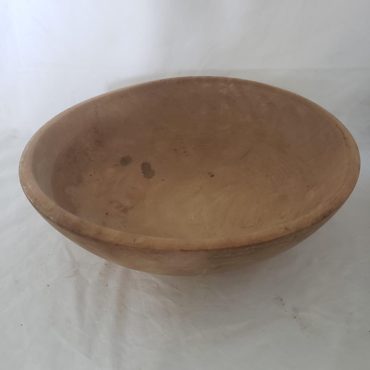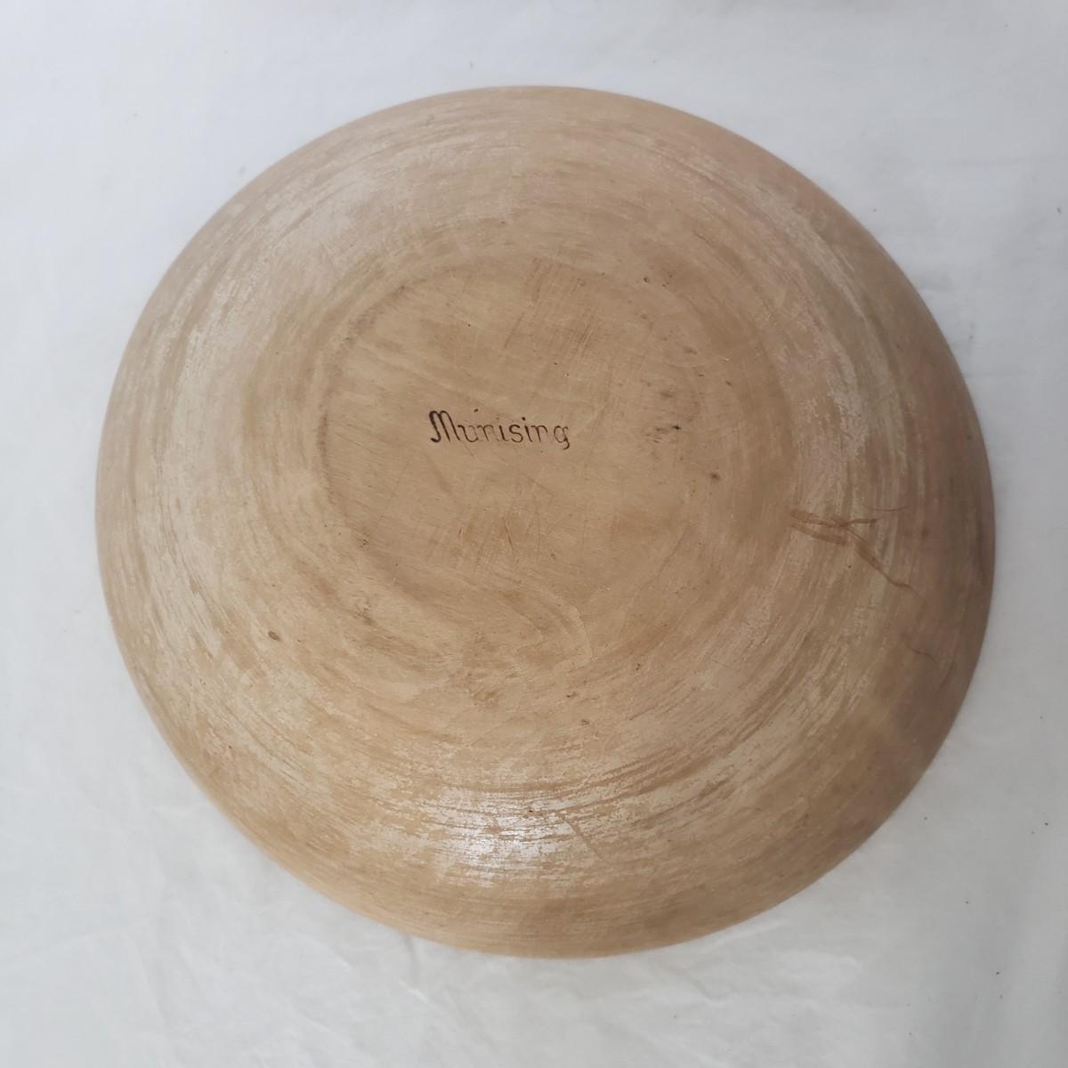 This lot features two wooden bowls. The larger bowl has a painted inside of an European couple. The bowl measures 20" x 12" x 5" H. The paint is chipping in some areas, see pictures. The Munising stamped bowl measures 13" x 4" H. This bowl has seen some love and has marks inside the bowl, see pictures.