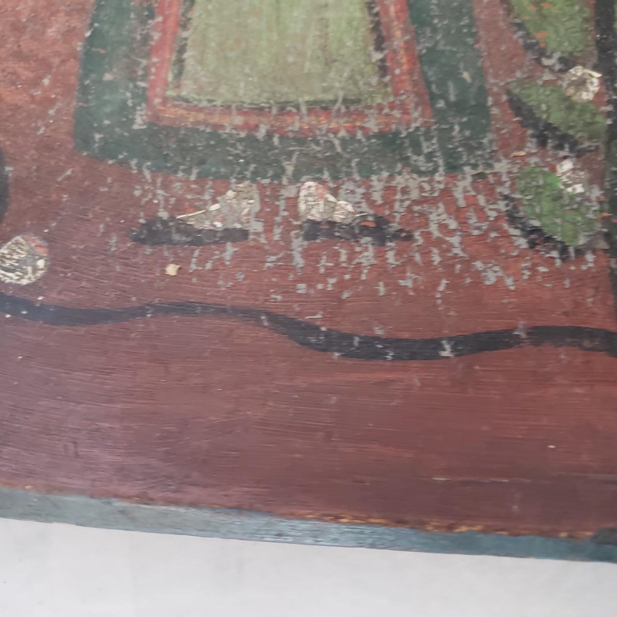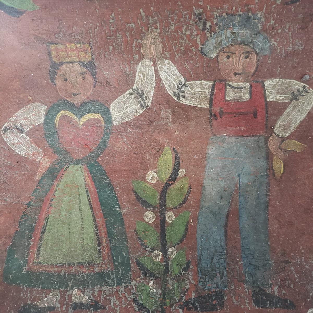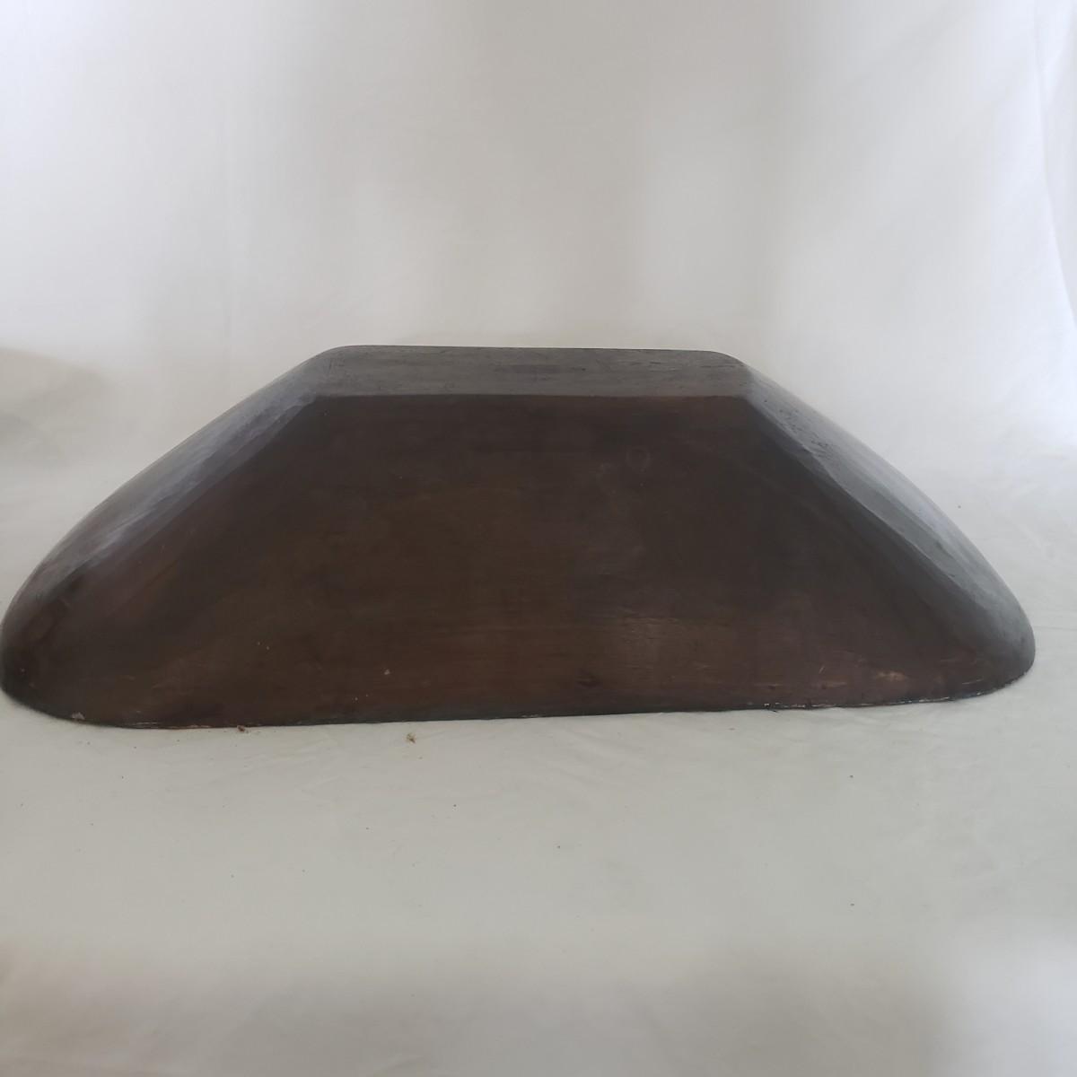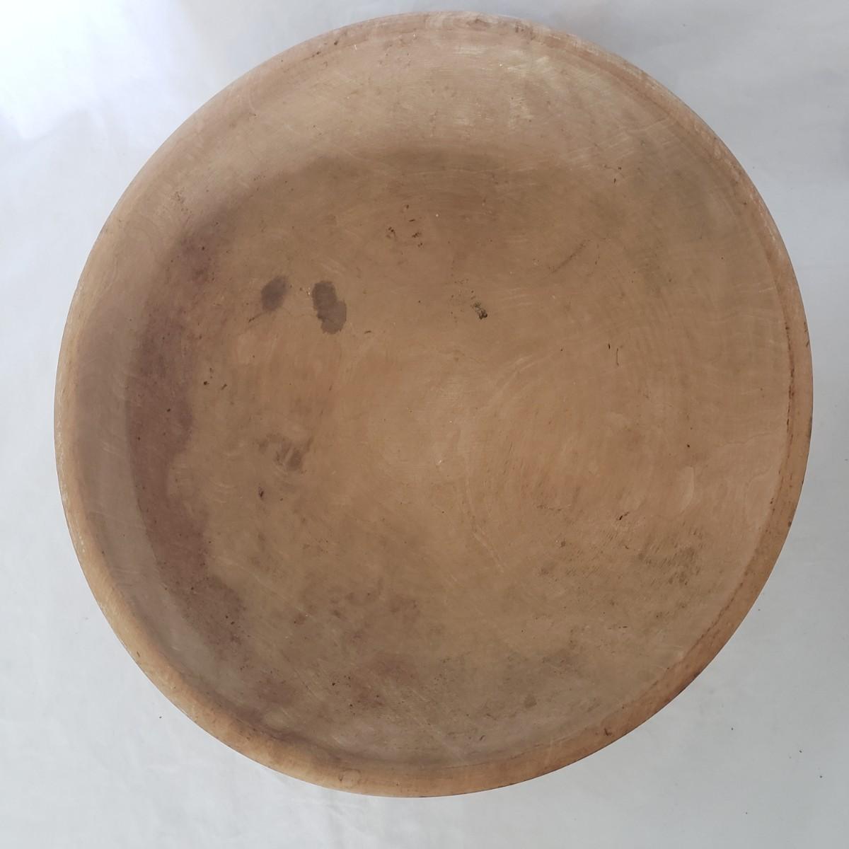 This lot features two wooden bowls. The larger bowl has a painted inside of an European couple. The bowl measures 20" x 12" x 5" H. The paint is chipping in some areas, see pictures. The Munising stamped bowl measures 13" x 4" H. This bowl has seen some love and has marks inside the bowl, see pictures.