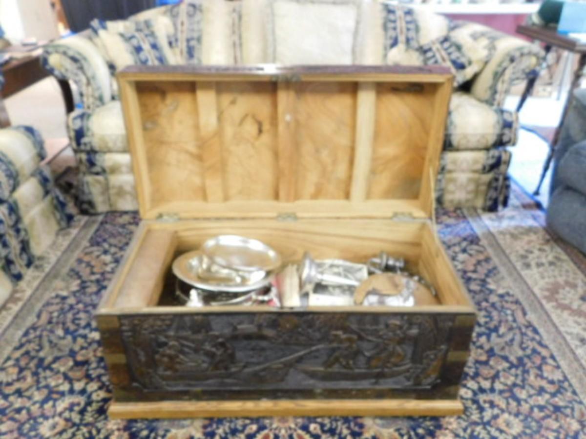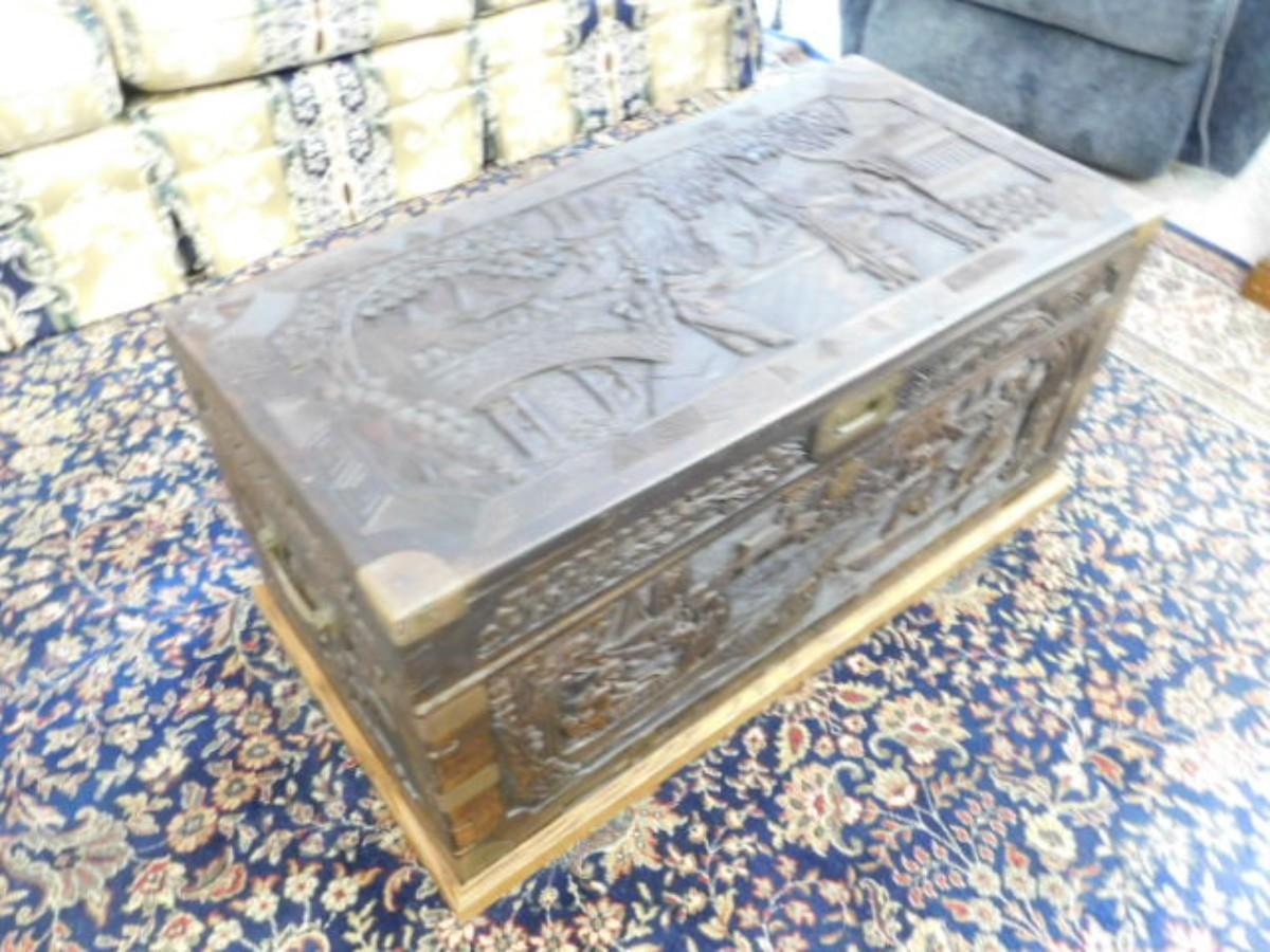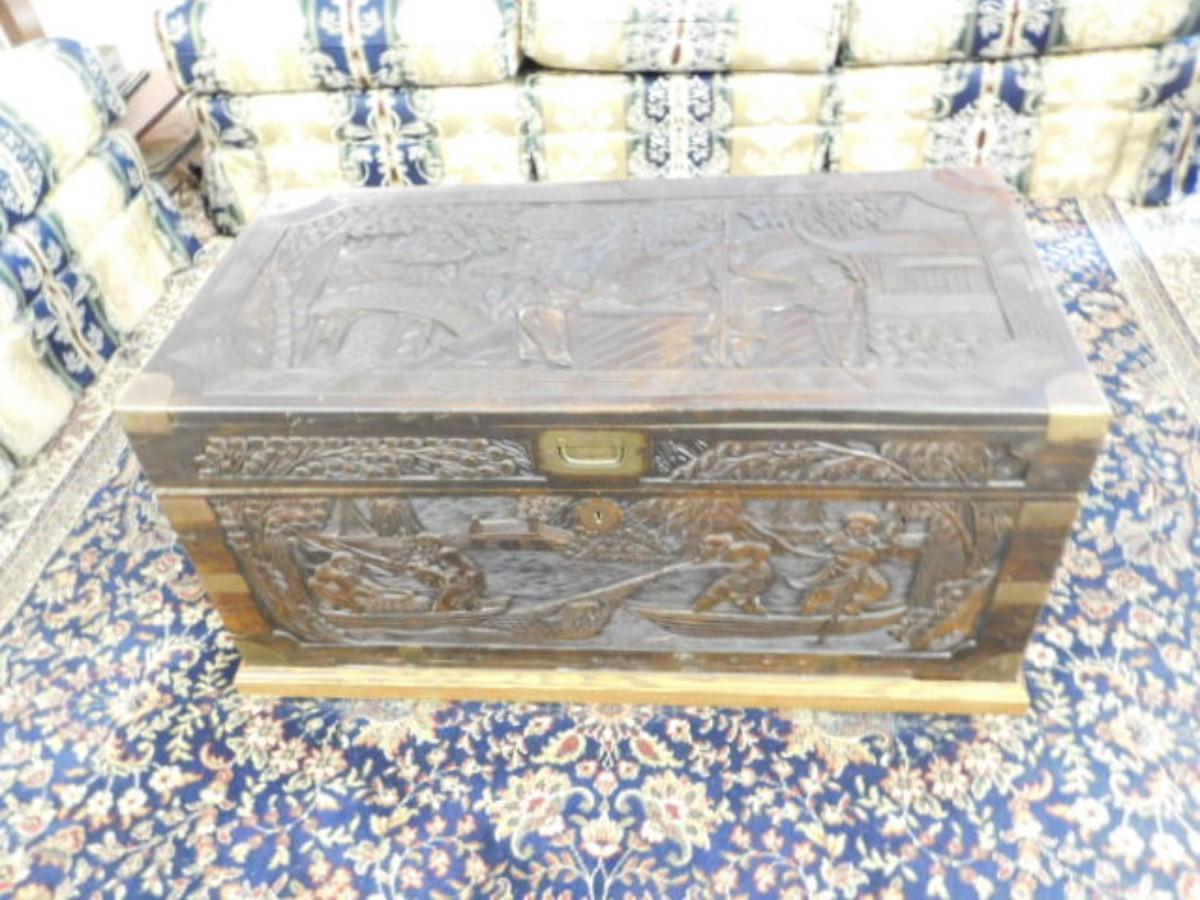 Vintage Hand Carved Camphor Wood Trunk with Brass Fixtures and Accents
