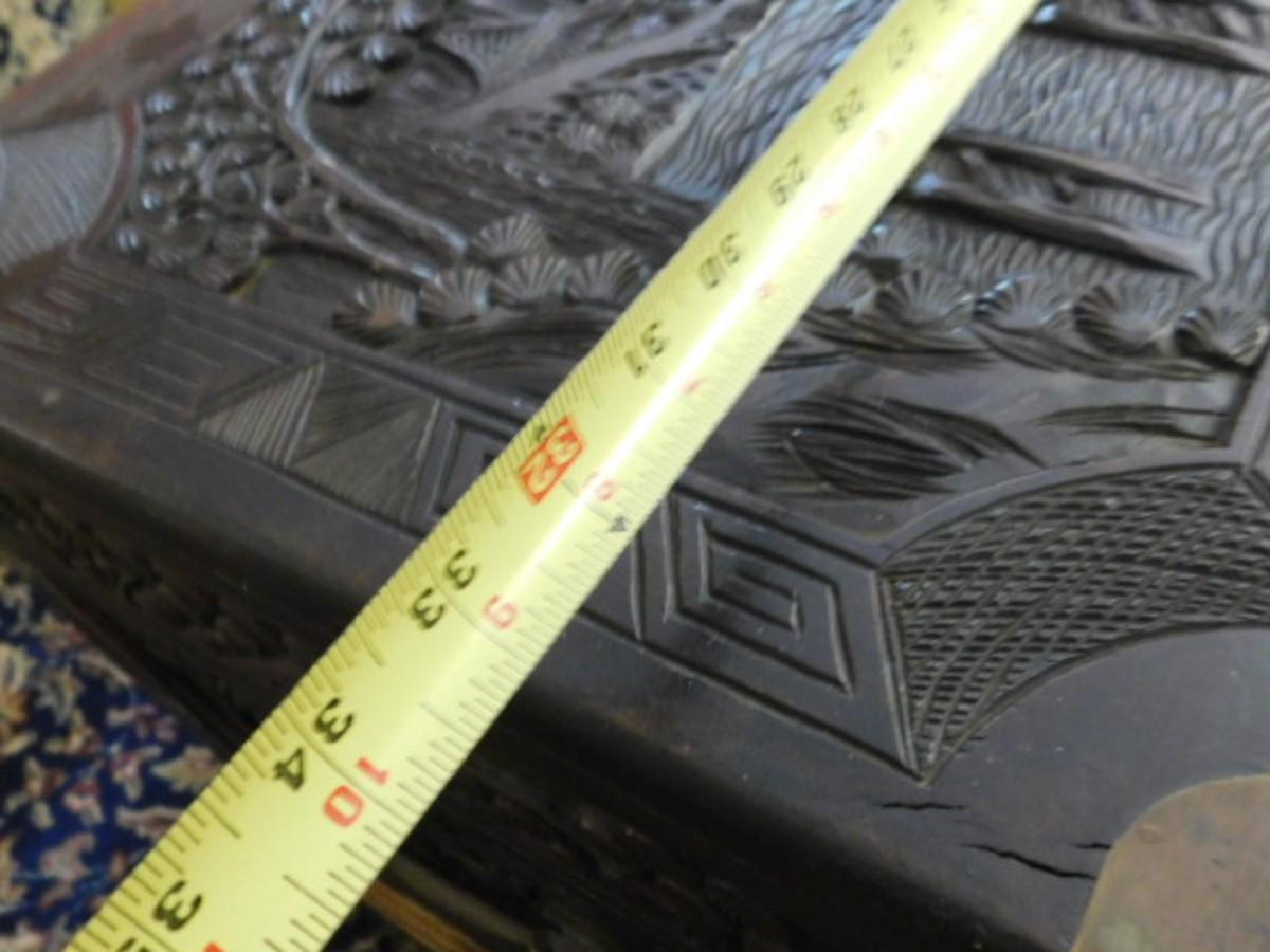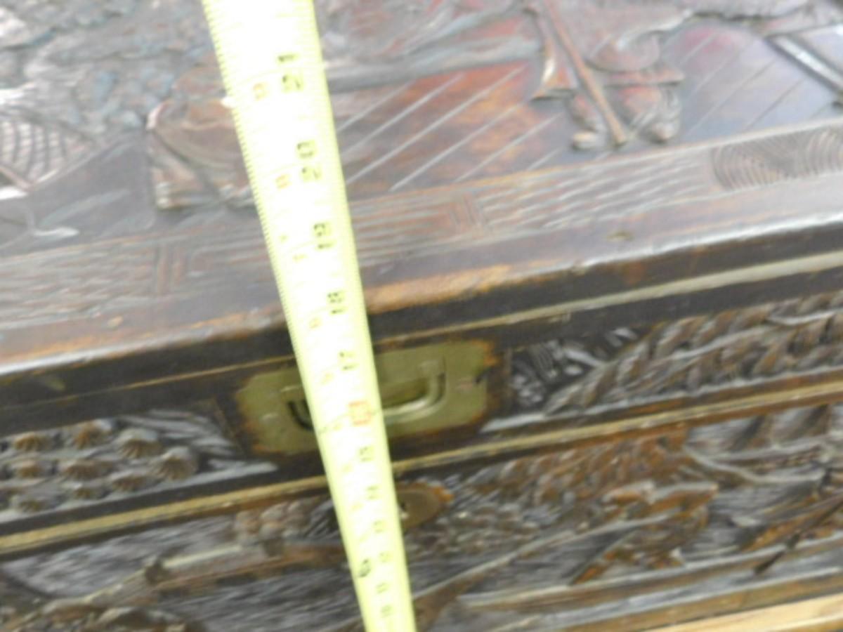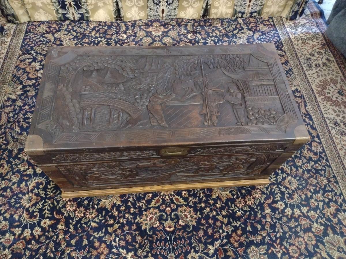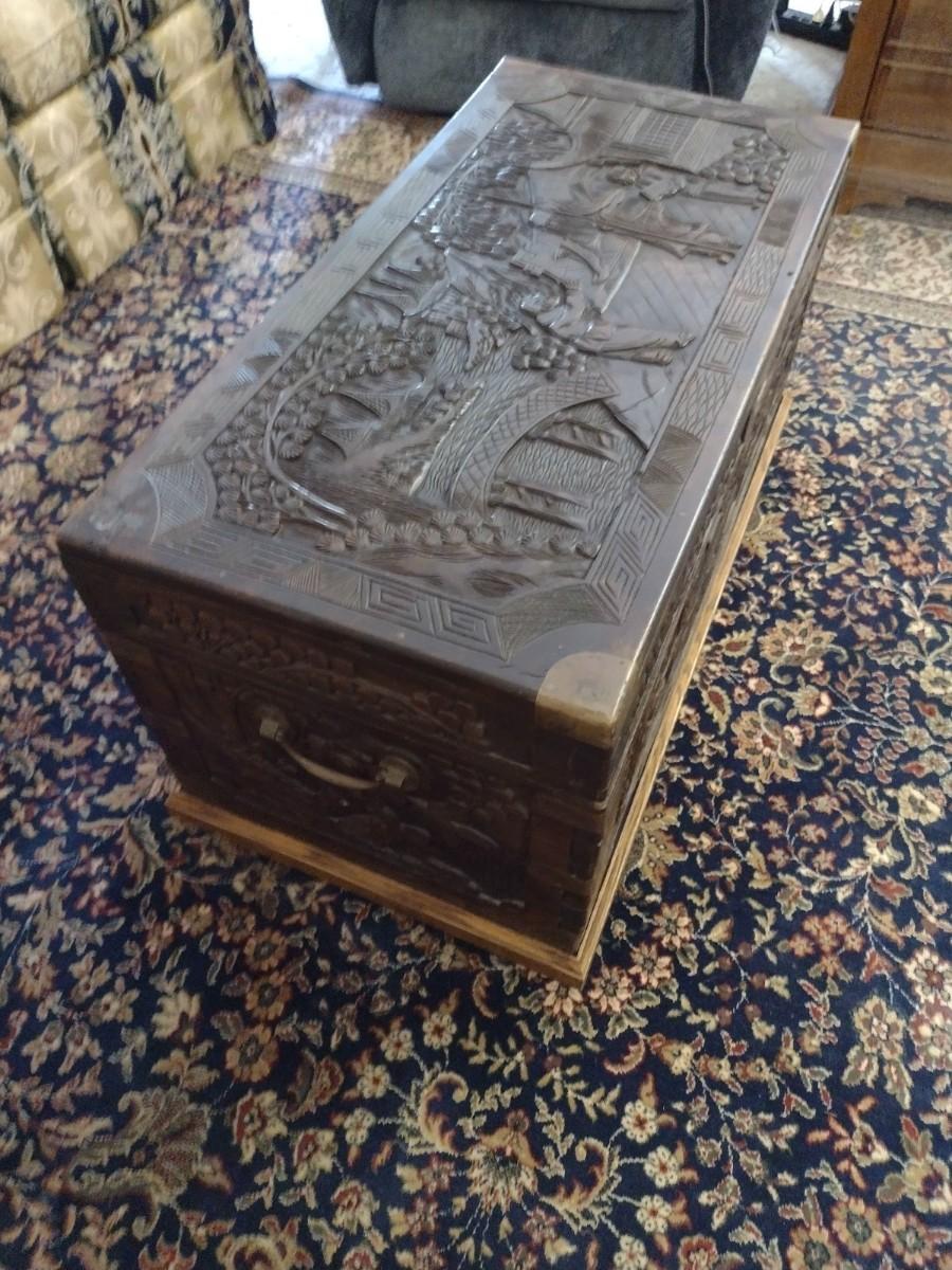Vintage Hand Carved Camphor Wood Trunk with Brass Fixtures and Accents