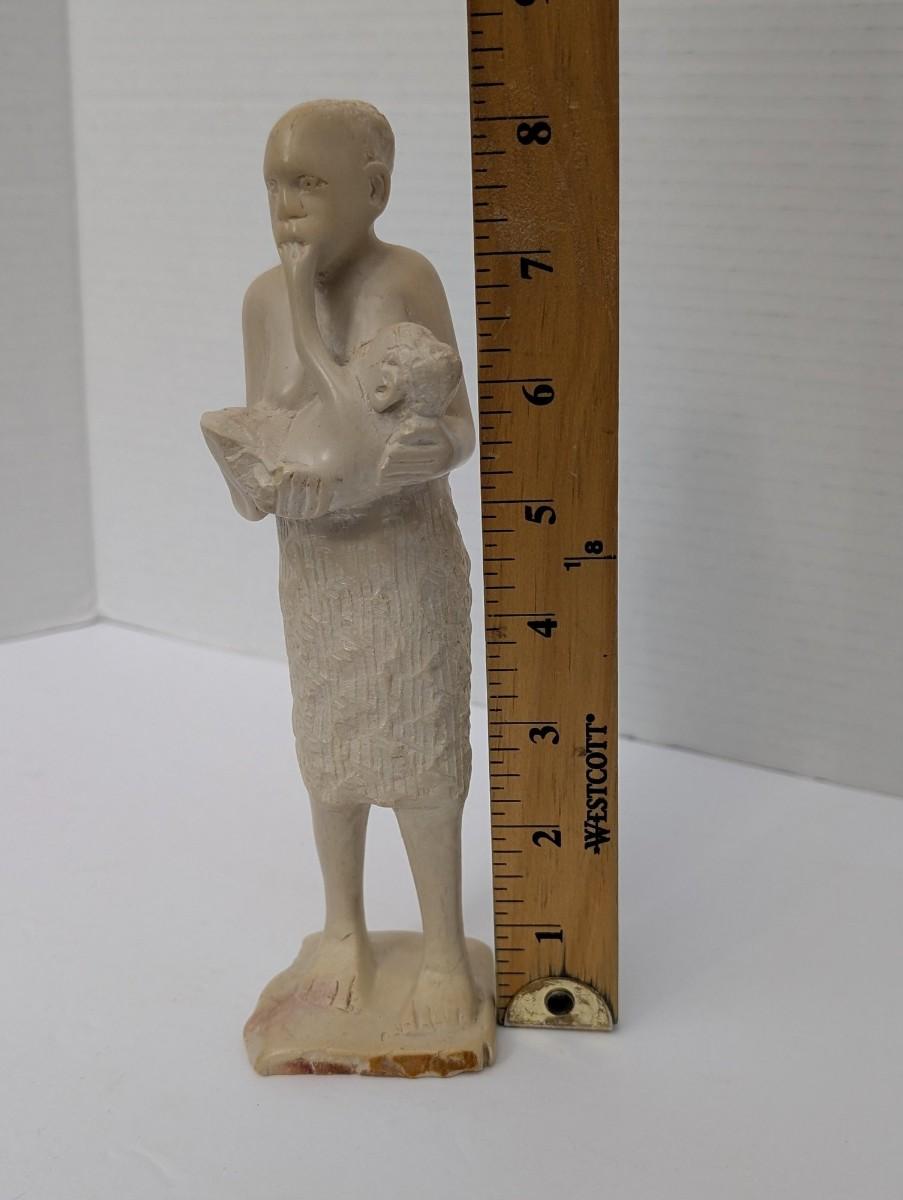 This vintage hand carved figurine depicts a woman in a simple wrap skirt holding a child in her arms, crafted with expressive detail and a rustic folk art style. The natural tone of the wood or stone-like material highlights the handmade character, making it both symbolic and decorative. A meaningful collectible for those who appreciate artisan carvings, cultural art, or representations of motherhood and family.