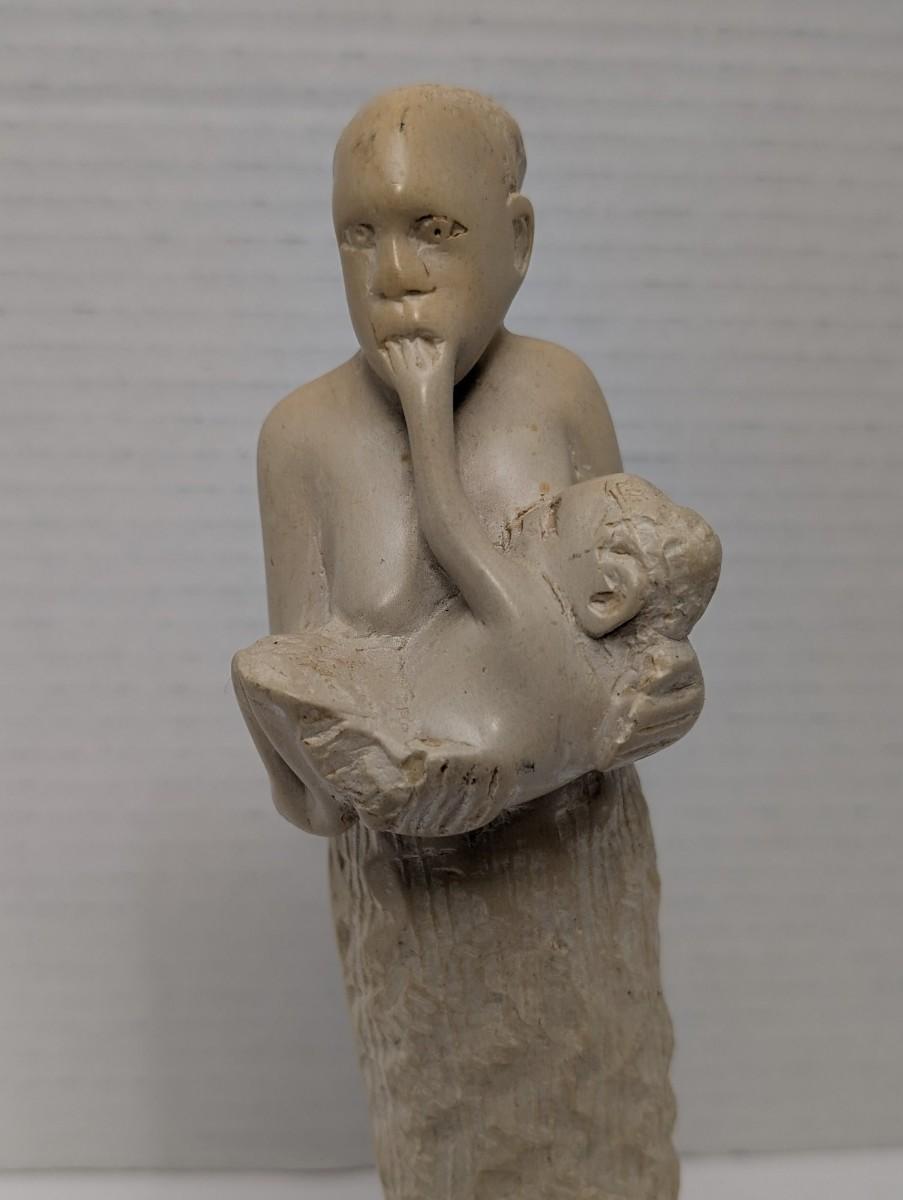 This vintage hand carved figurine depicts a woman in a simple wrap skirt holding a child in her arms, crafted with expressive detail and a rustic folk art style. The natural tone of the wood or stone-like material highlights the handmade character, making it both symbolic and decorative. A meaningful collectible for those who appreciate artisan carvings, cultural art, or representations of motherhood and family.