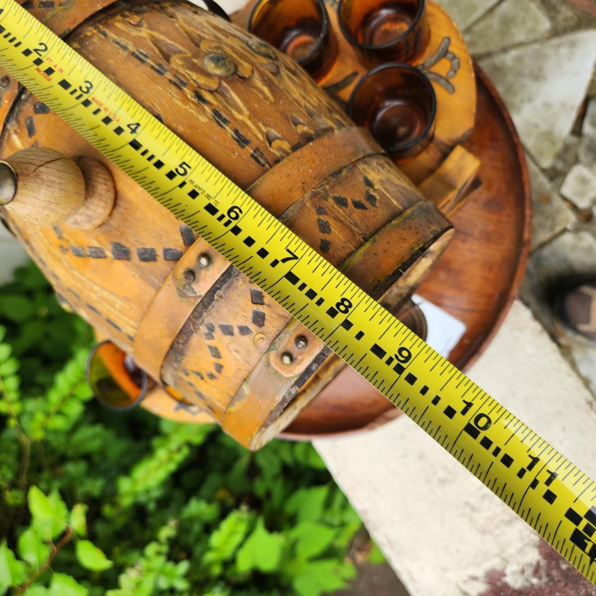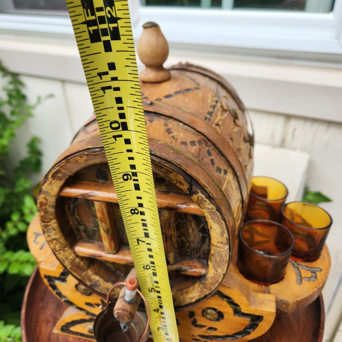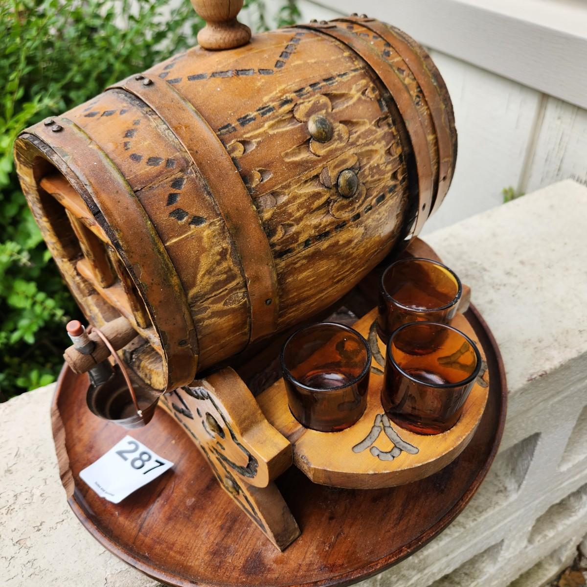 Vintage  Hand Carved Wine Barrel w Shot Glasses  Bar Decor