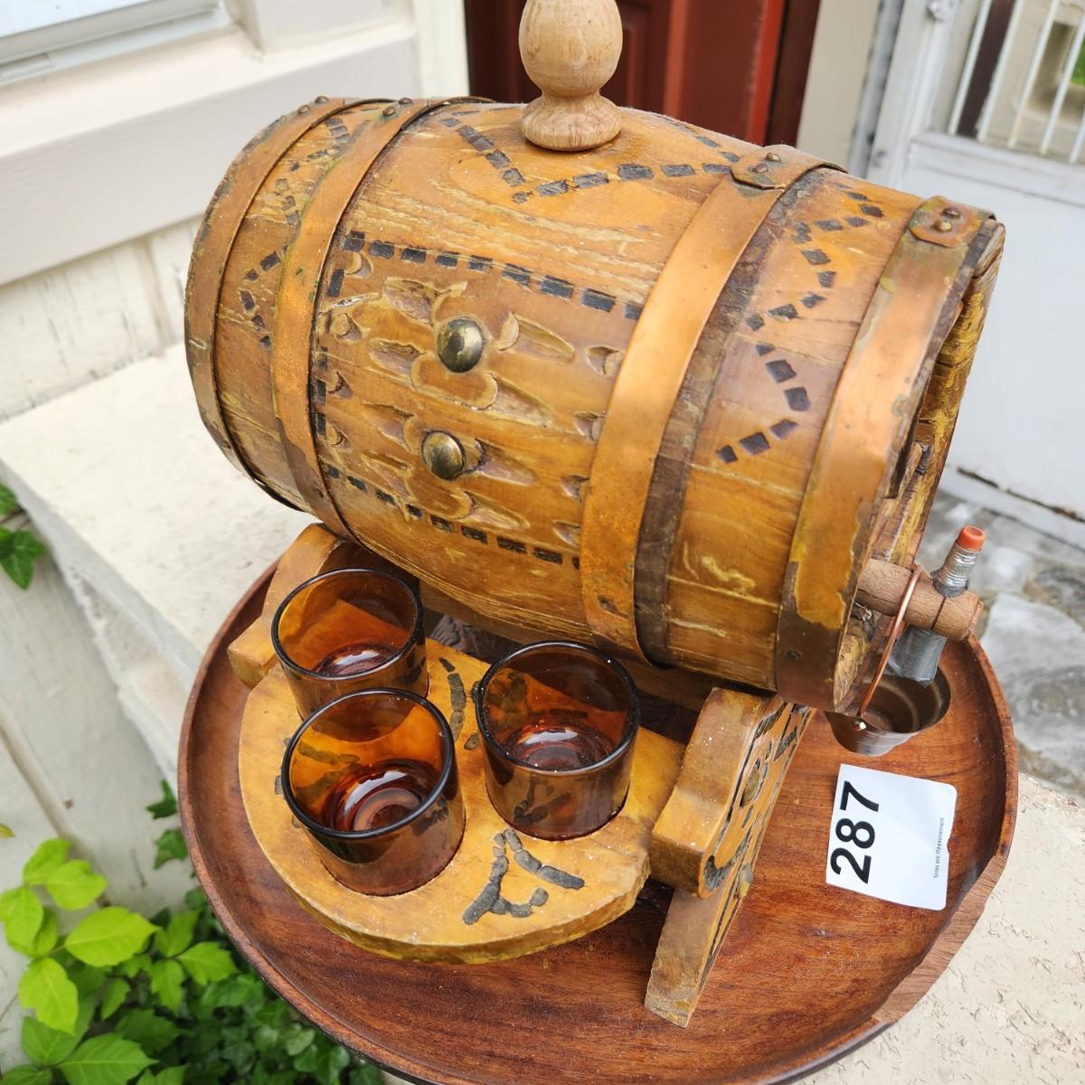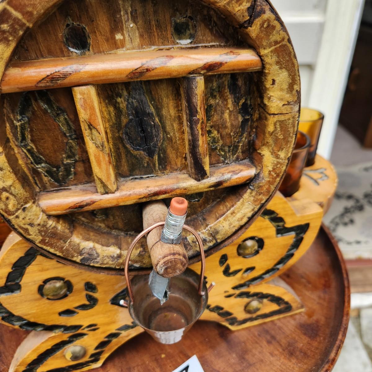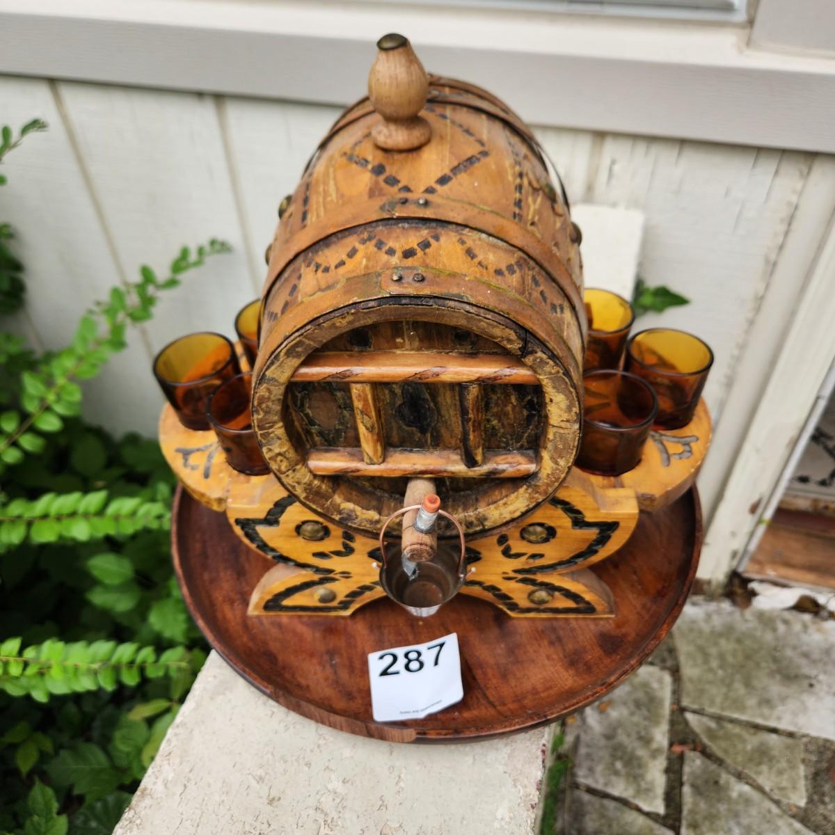 Vintage  Hand Carved Wine Barrel w Shot Glasses  Bar Decor