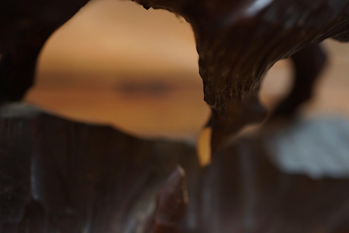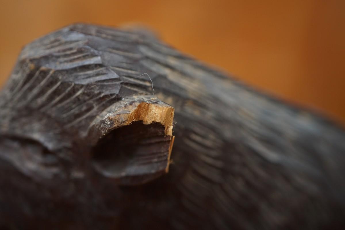 chips on the ears. repair to break in the back leg. missing part of the bottom of the othe r rear leg