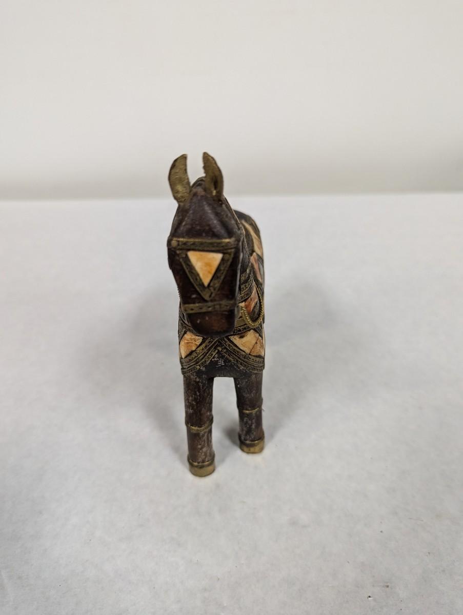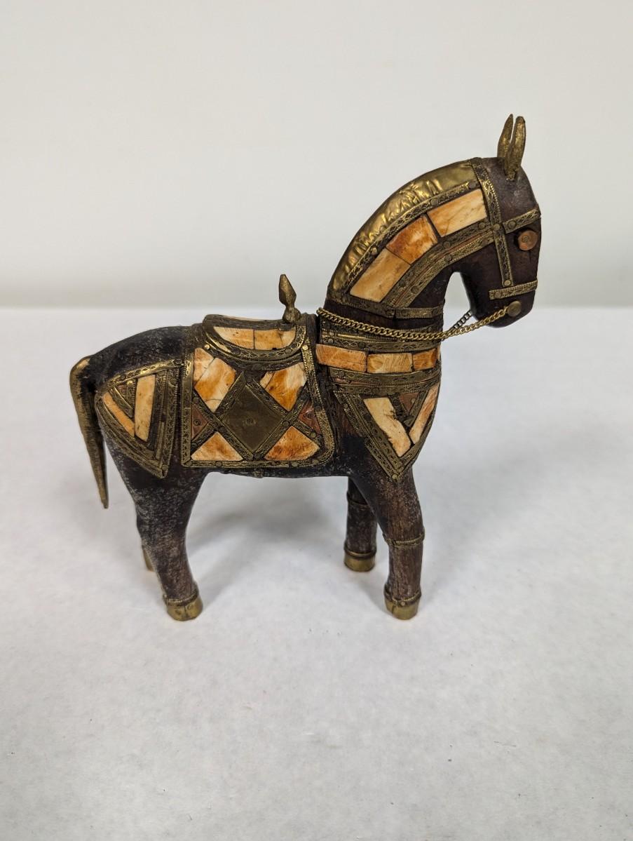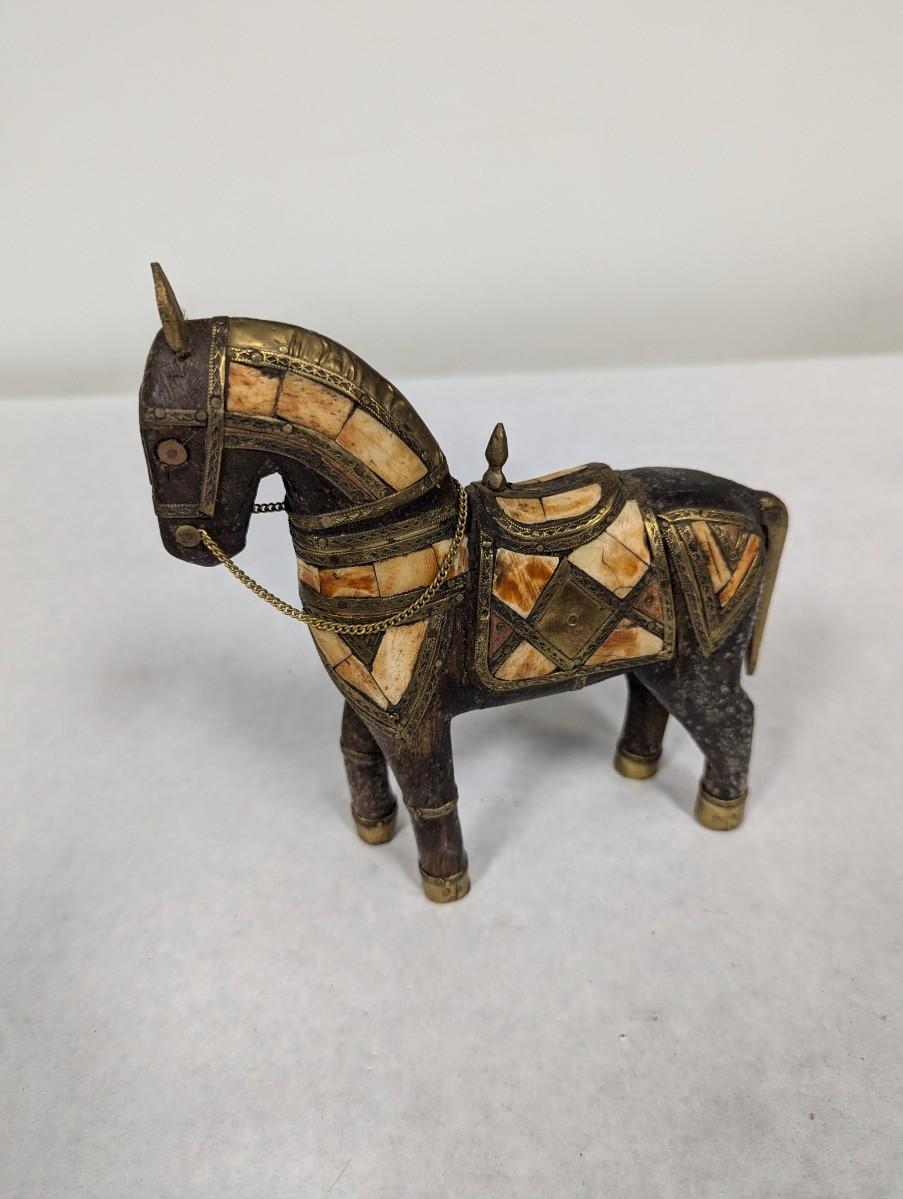 Vintage Hand Carved Wood Brass & Stone Inlay Horse