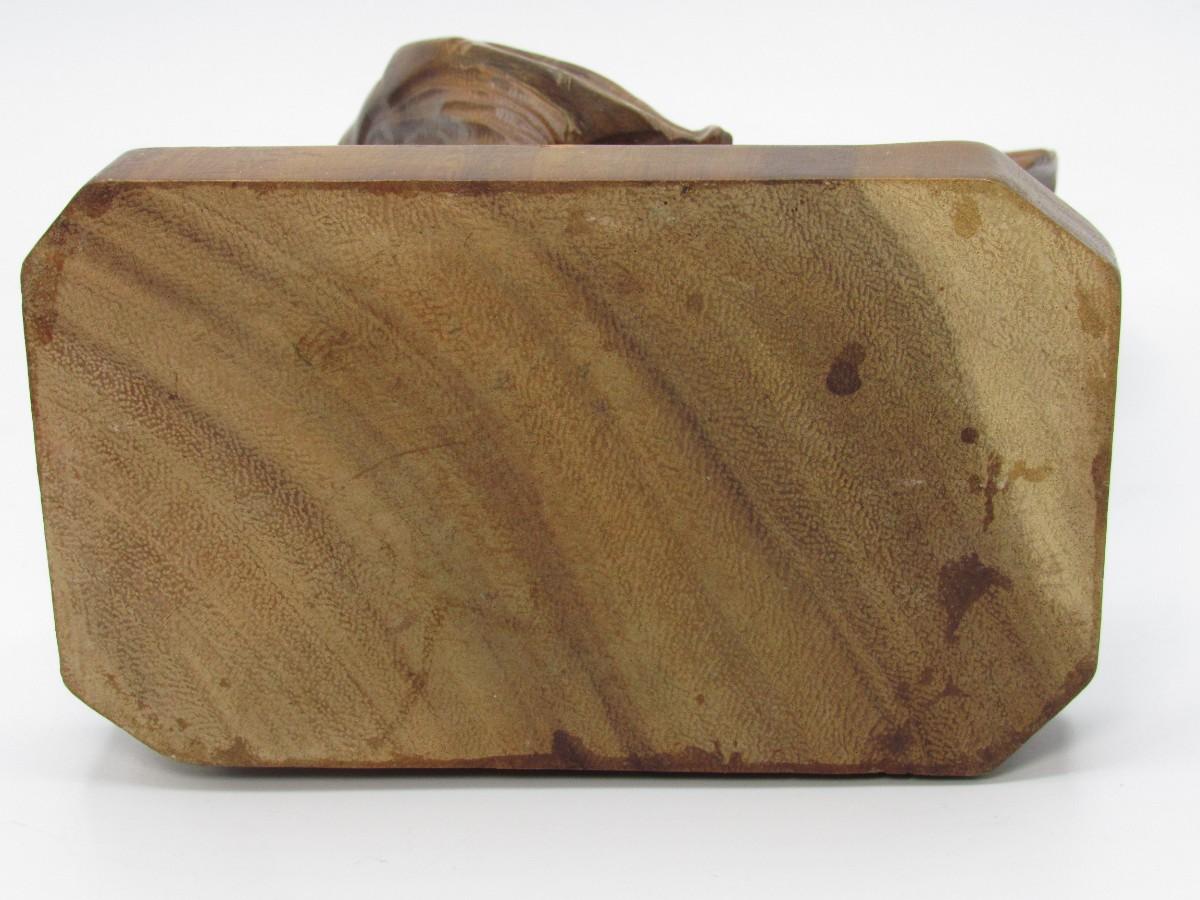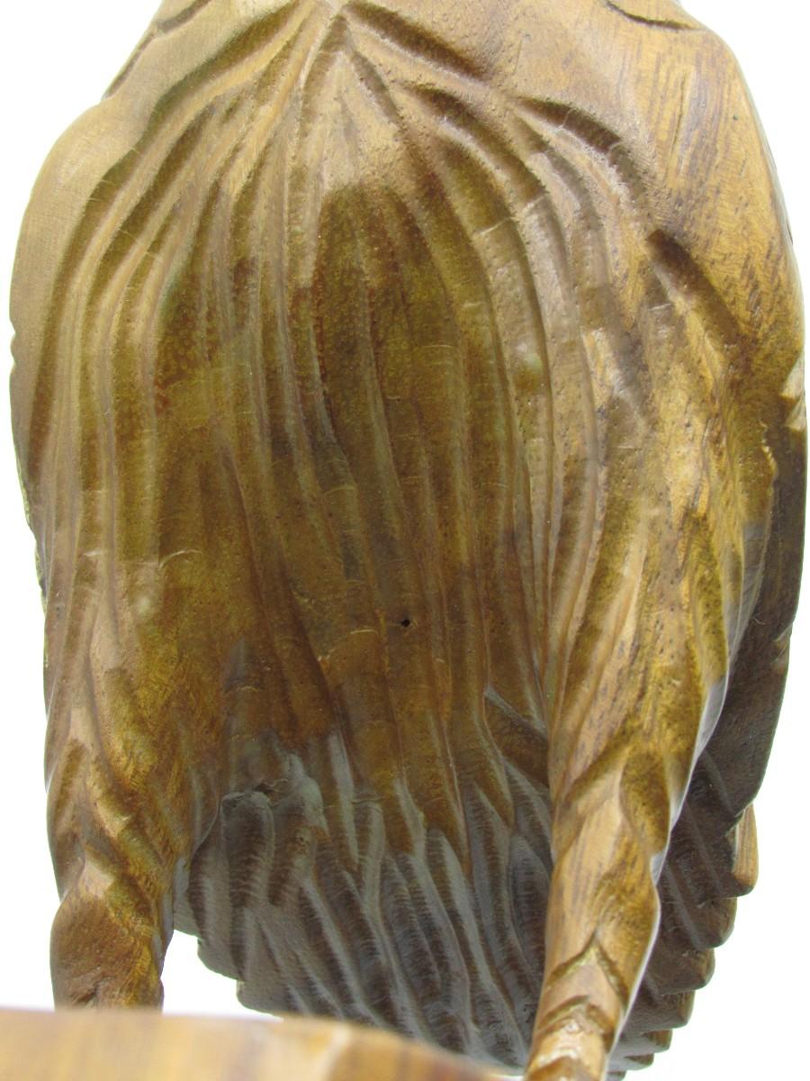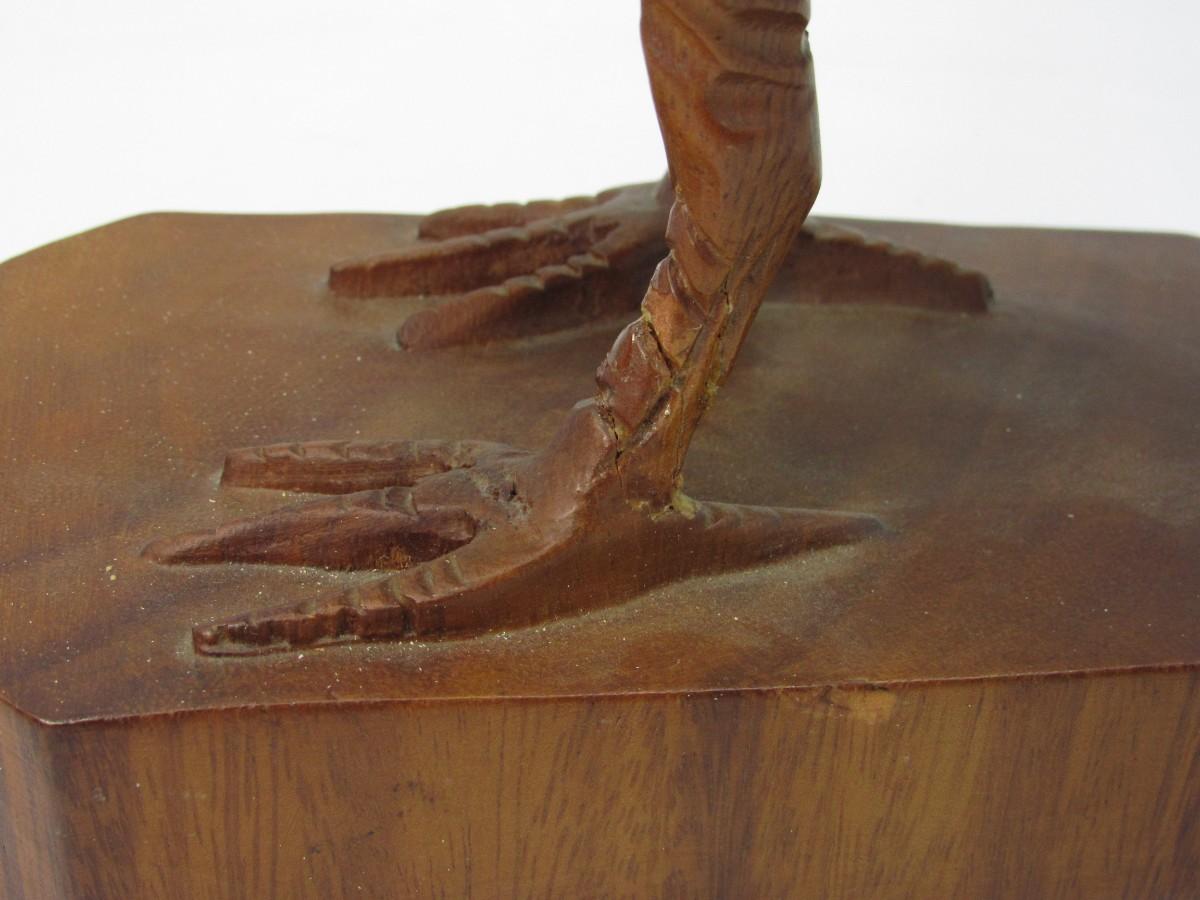 Looks to be made from walnut, sits on a base of more than 1" thickness. Stans approx. 11" tall. The tip of the beak is cracked off, but there is no other visible damage and is in good displayable condition. Check pictures for more details and sizing.