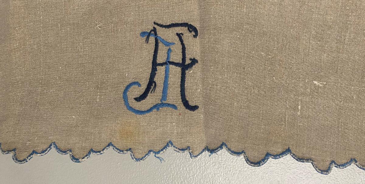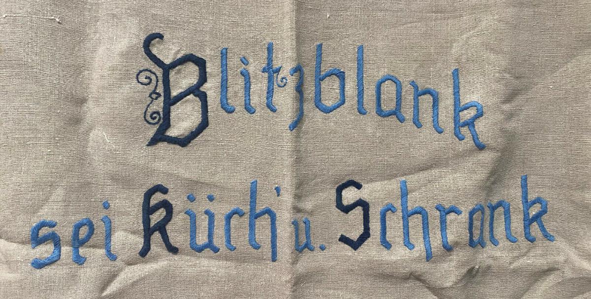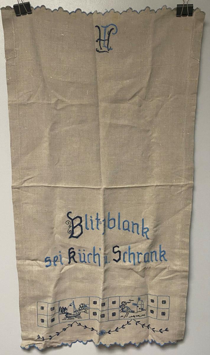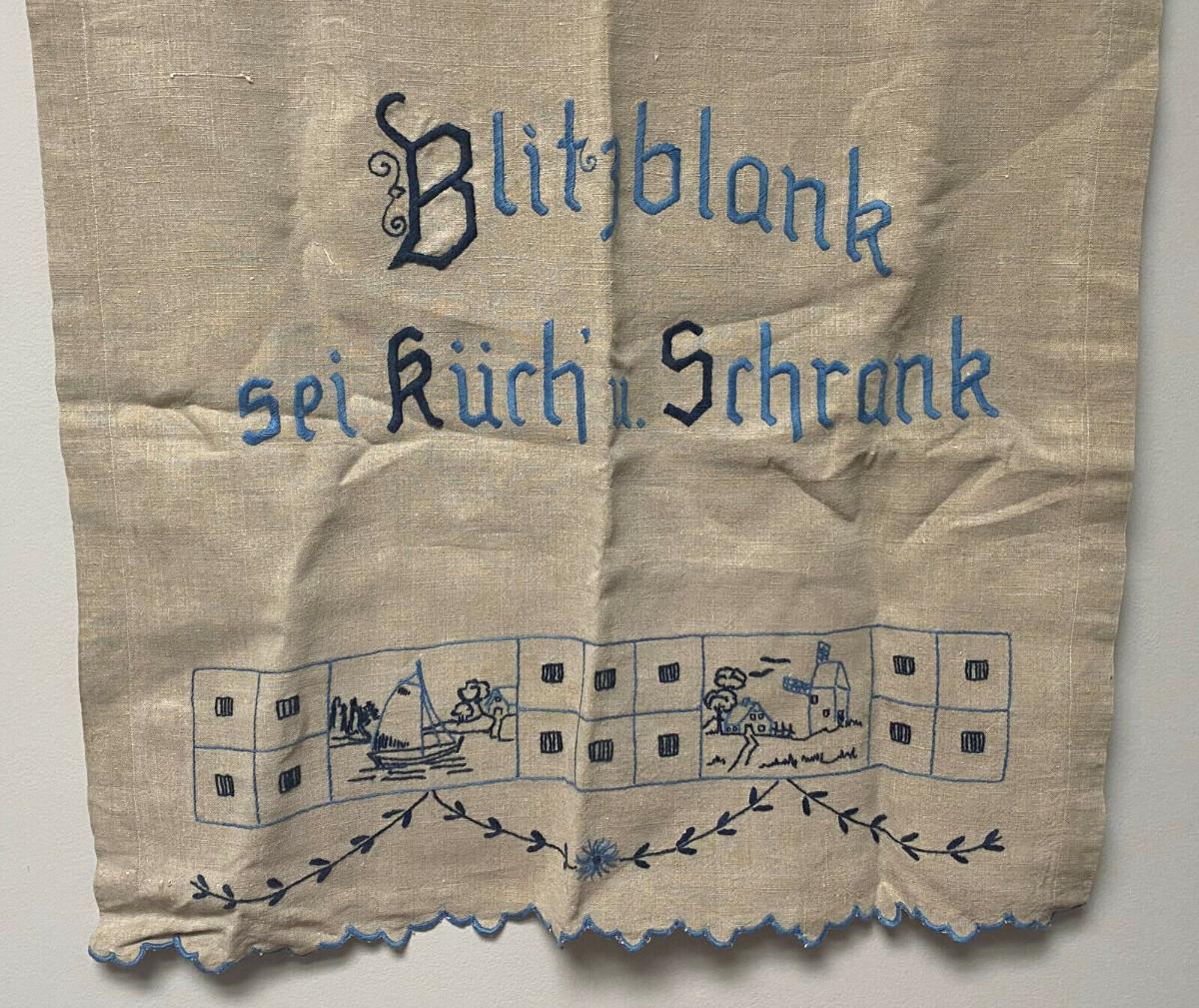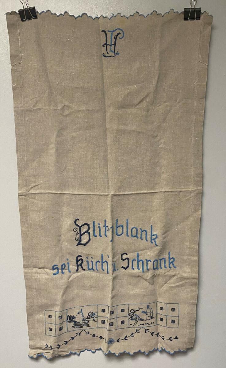 Here is a hand embroidered linen tablecloth from an estate of German descendants. Certainly vintage and possibly antique...Note German lettering...Excellent condition. Scalloped edges...Blitzblank sei Kuch und Schrank which I believe translates to 'The kitchen and cupboard are sparkling clean' in English...This end table cover measures approx. 45 x 25"...Monogrammed.