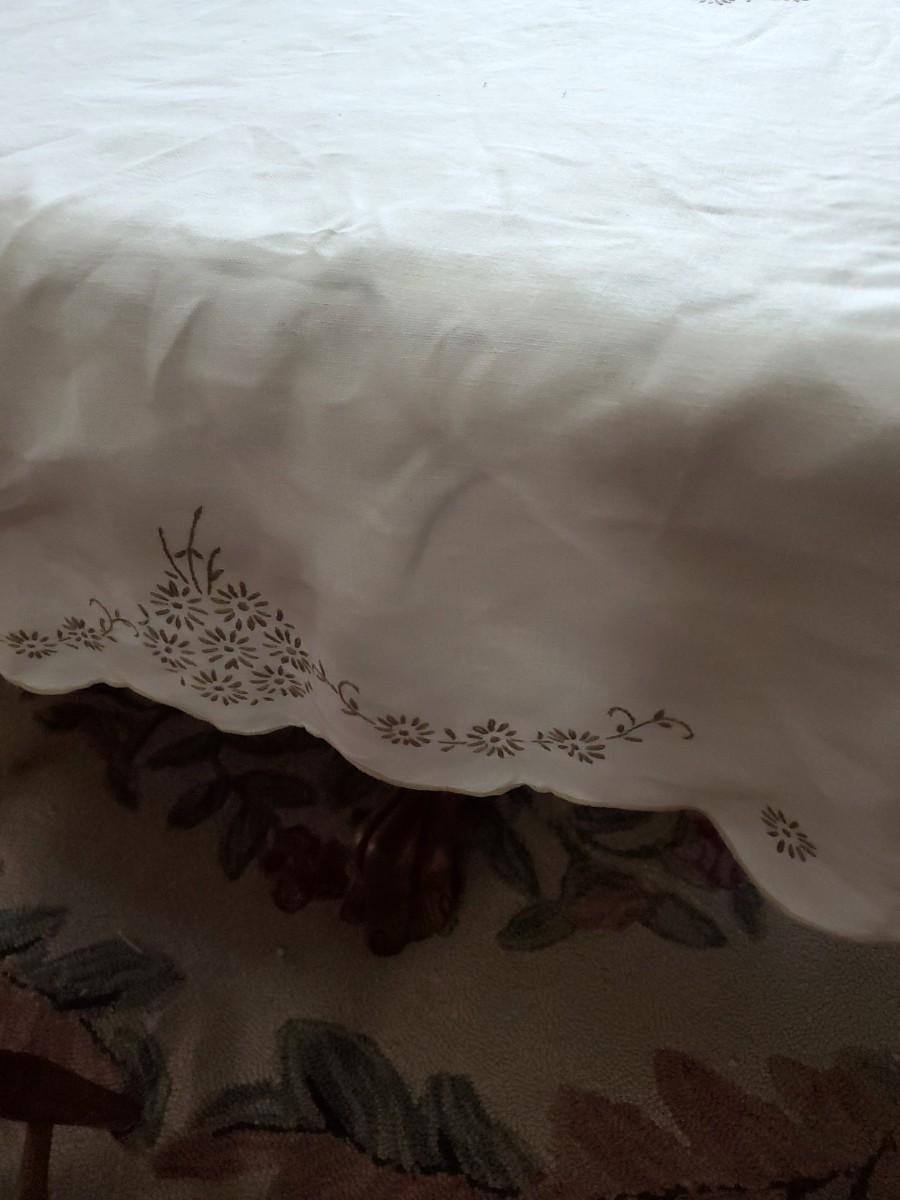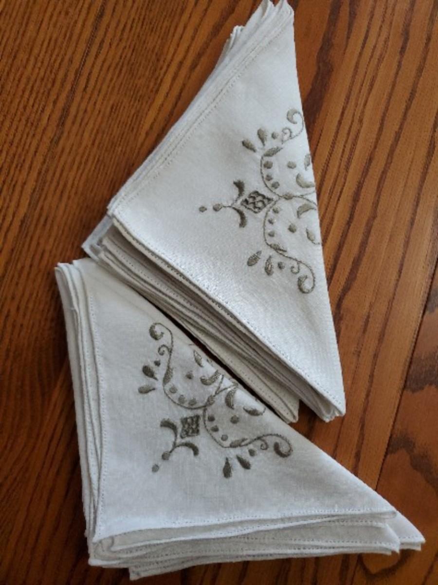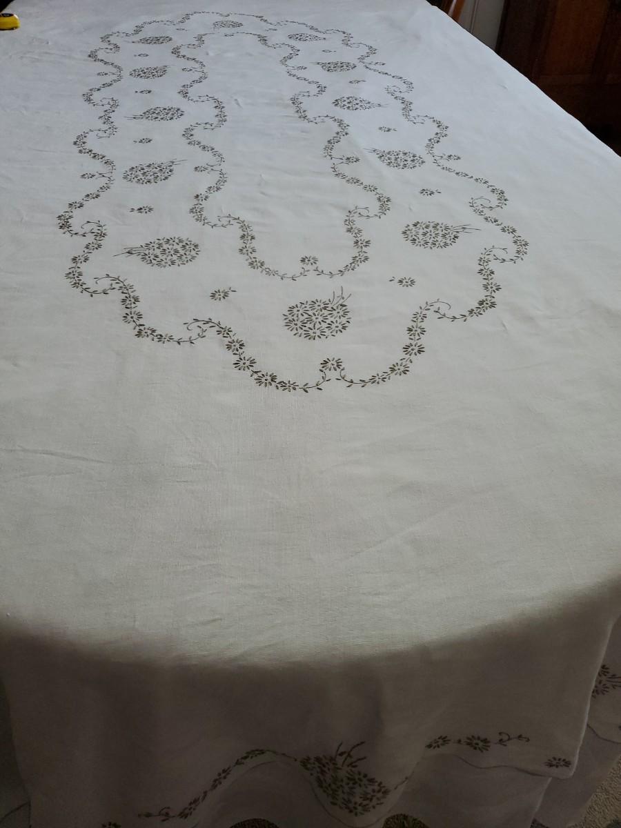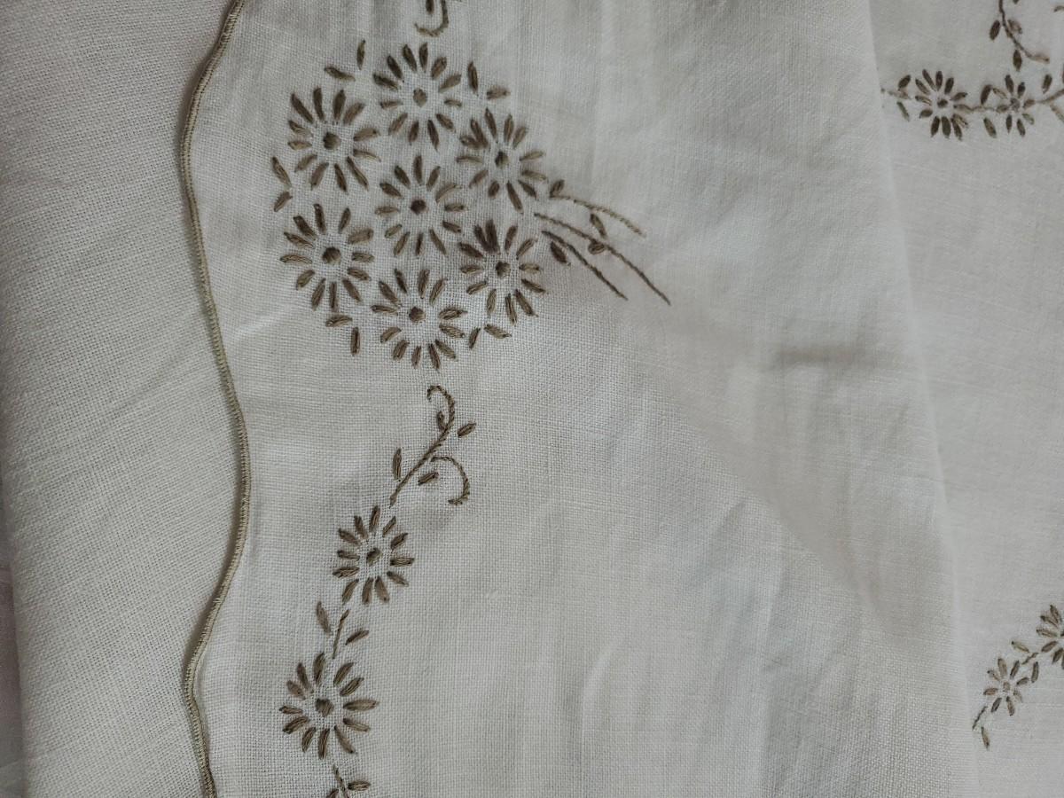 Off White Linen Napkins with hand embroidered motif on all 12. Tablecloth is also hand stitched with embroidered flowers and scallop edges. Tablecloth measures about 64"x98". Some of the decorations may be machine applied like the scolloped edging on the tablecloth.