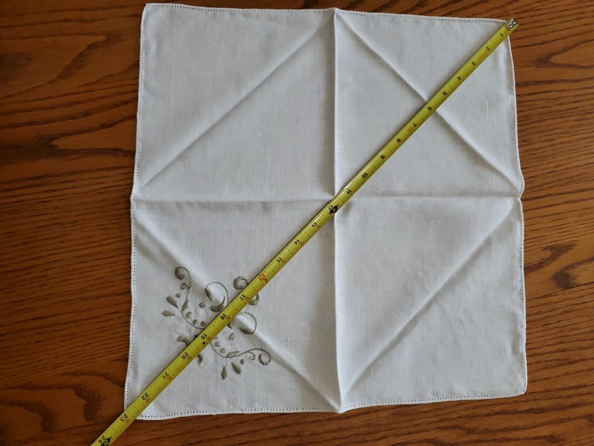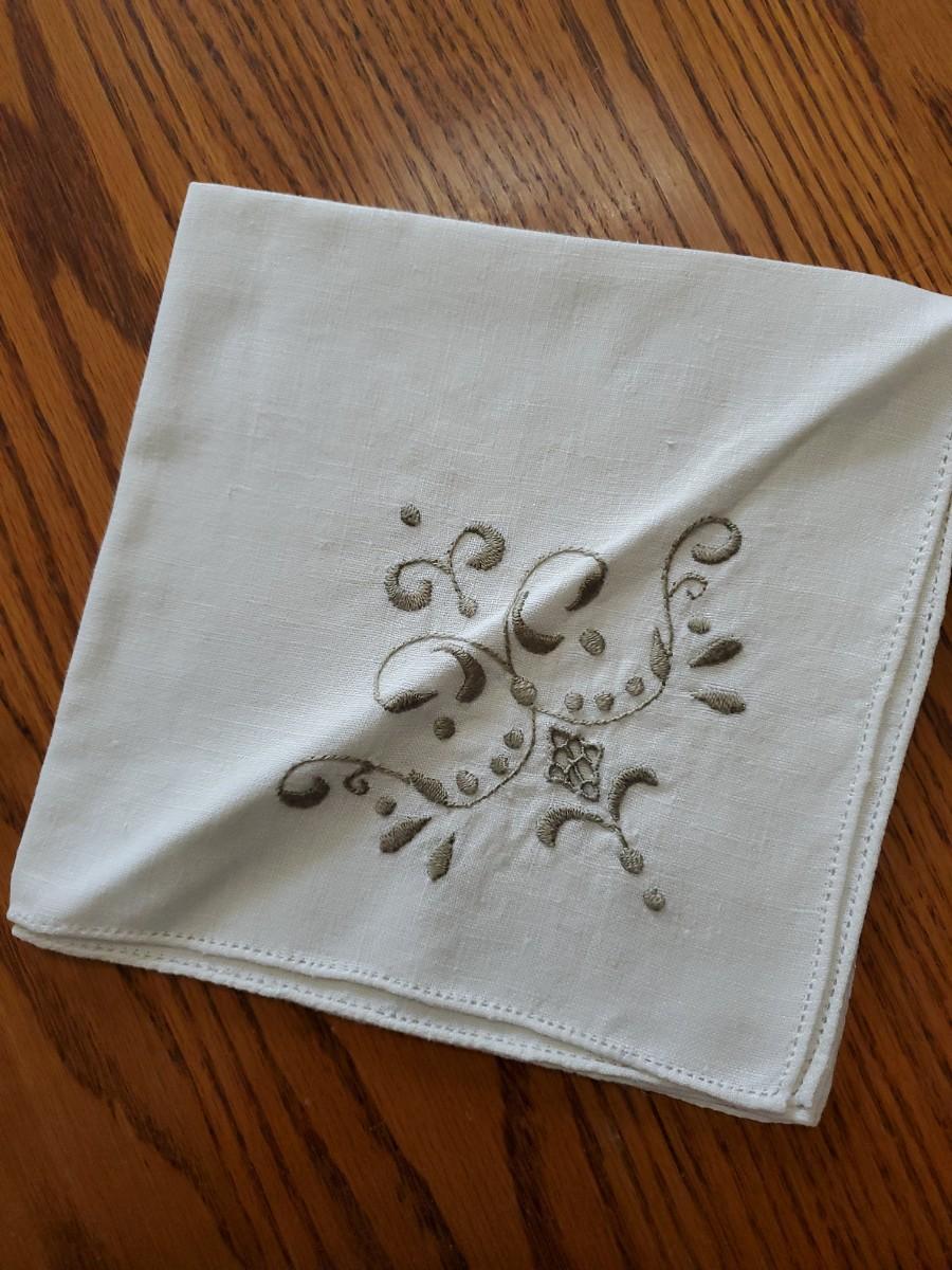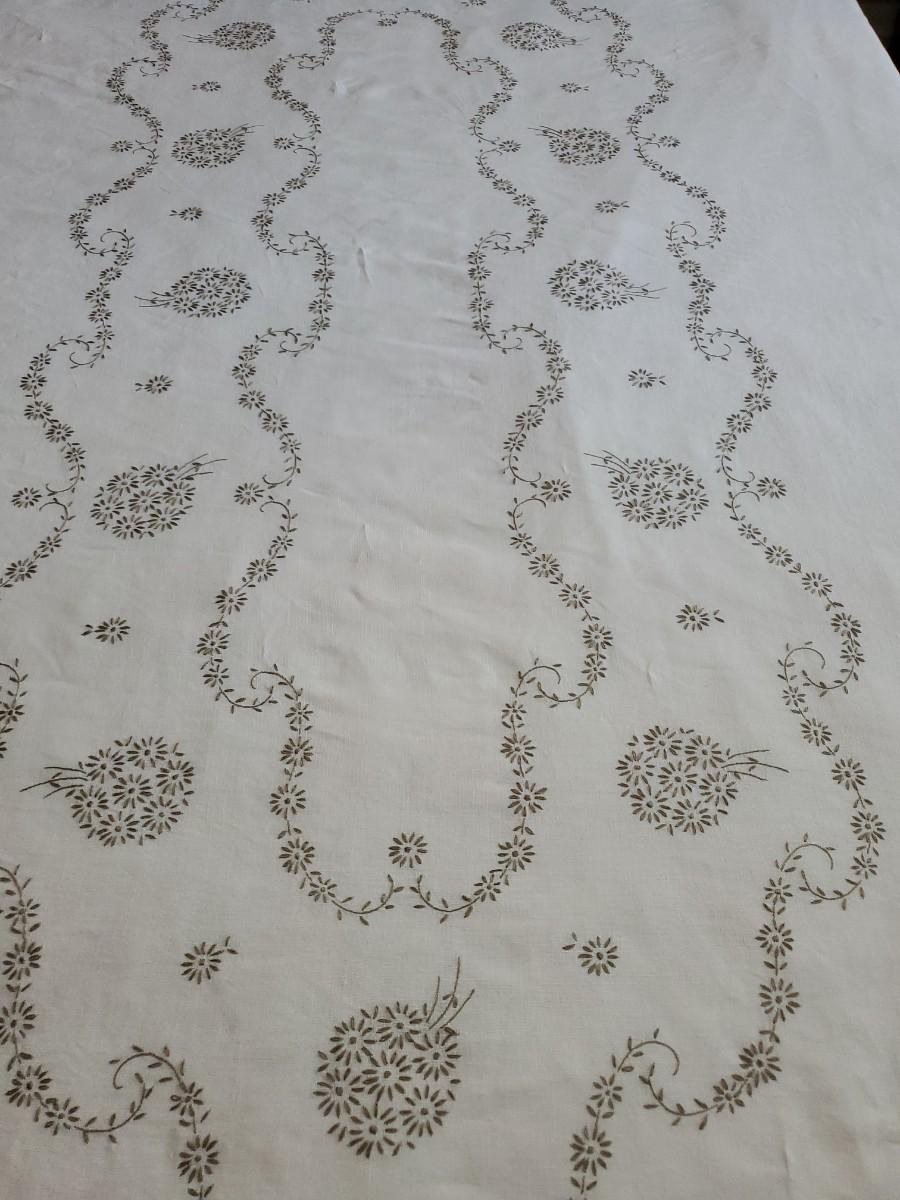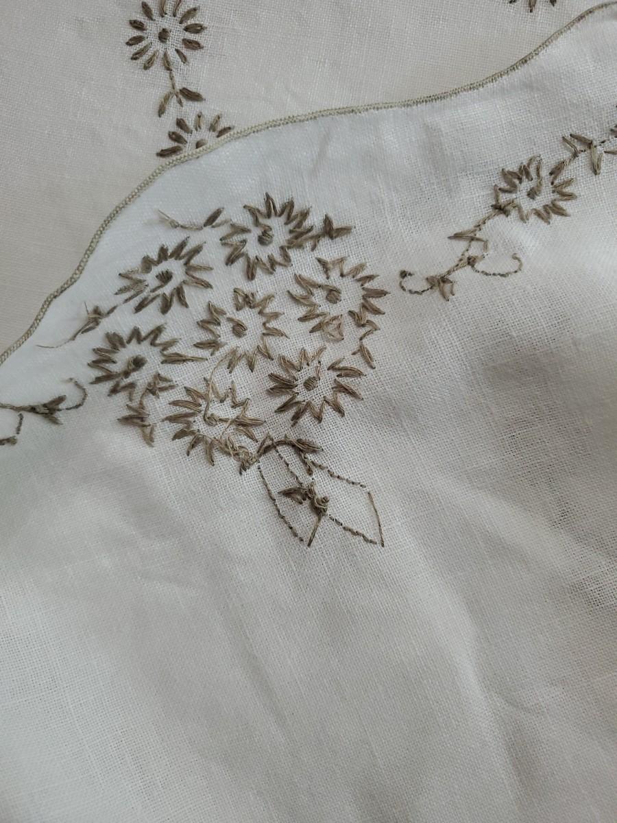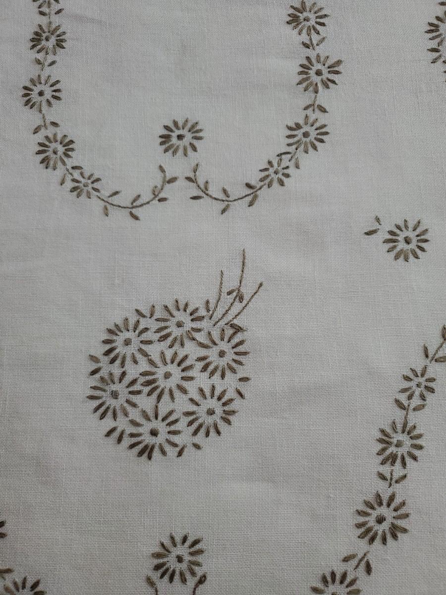 Off White Linen Napkins with hand embroidered motif on all 12. Tablecloth is also hand stitched with embroidered flowers and scallop edges. Tablecloth measures about 64"x98". Some of the decorations may be machine applied like the scolloped edging on the tablecloth.