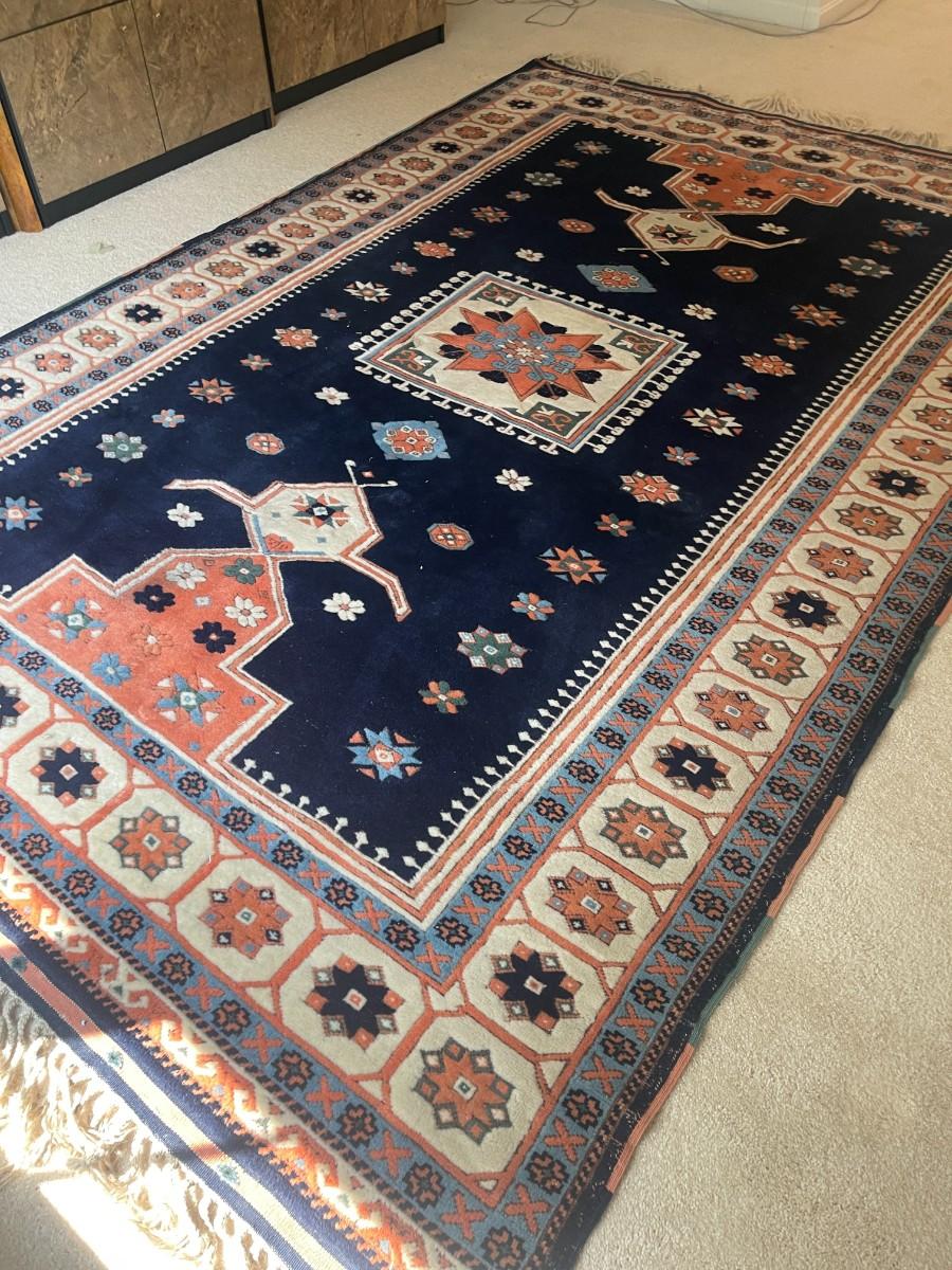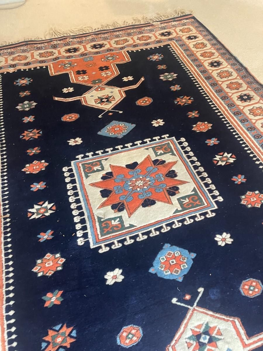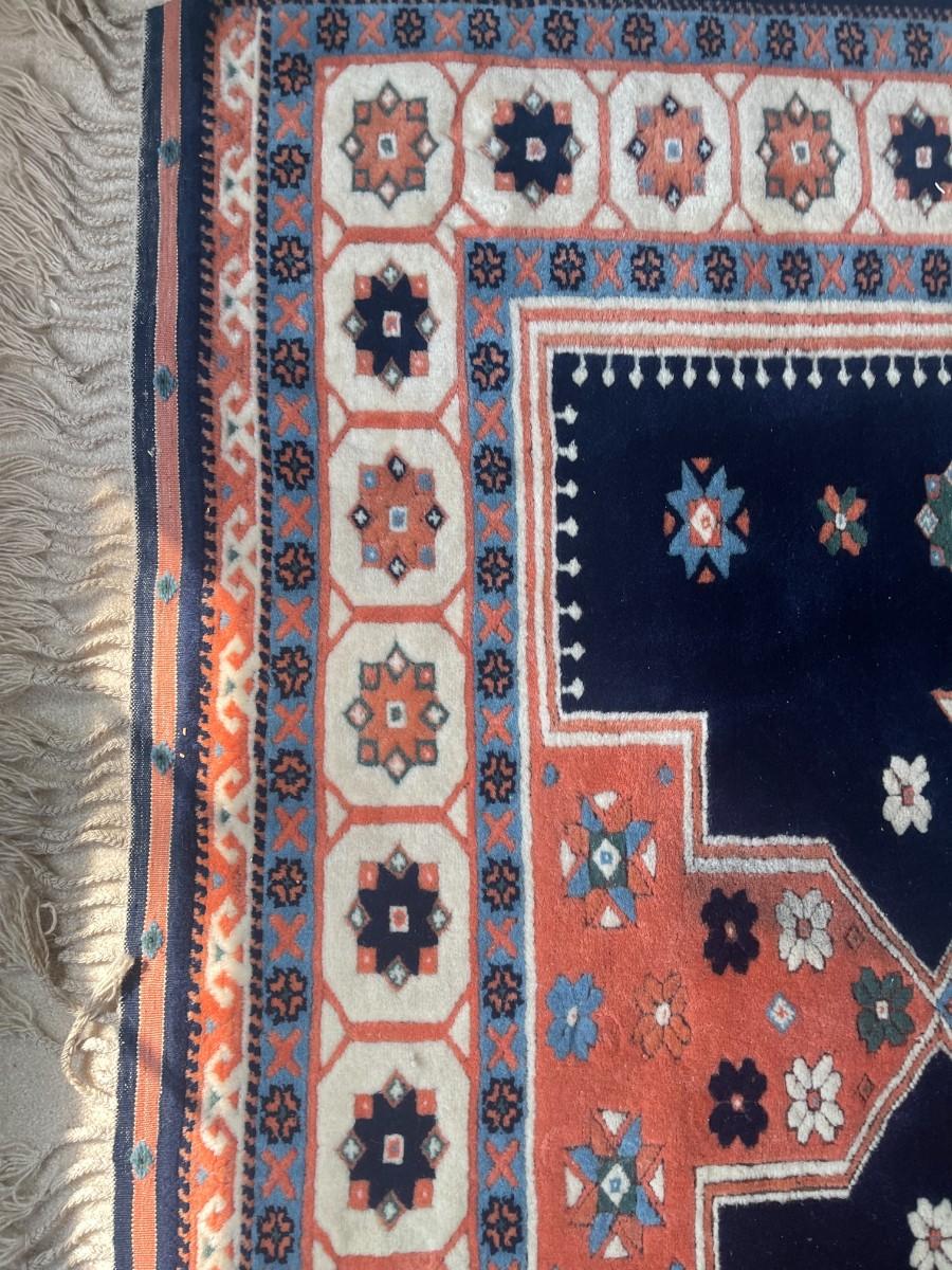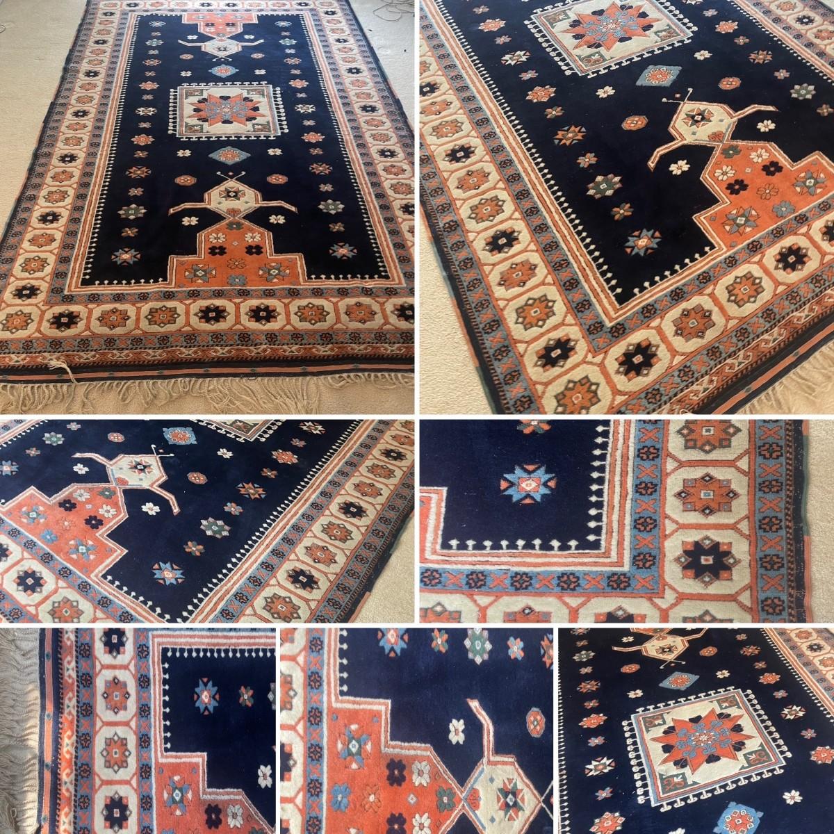 Hand knotted wool rug is approximtely 6' x 9'. It's in excellent condition for its age showing little signs of wear. The rug is wool on a wool foundation. # 1421