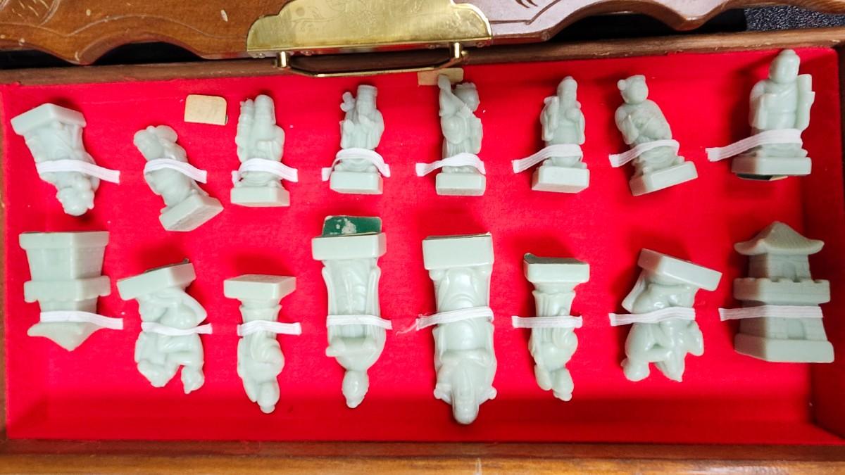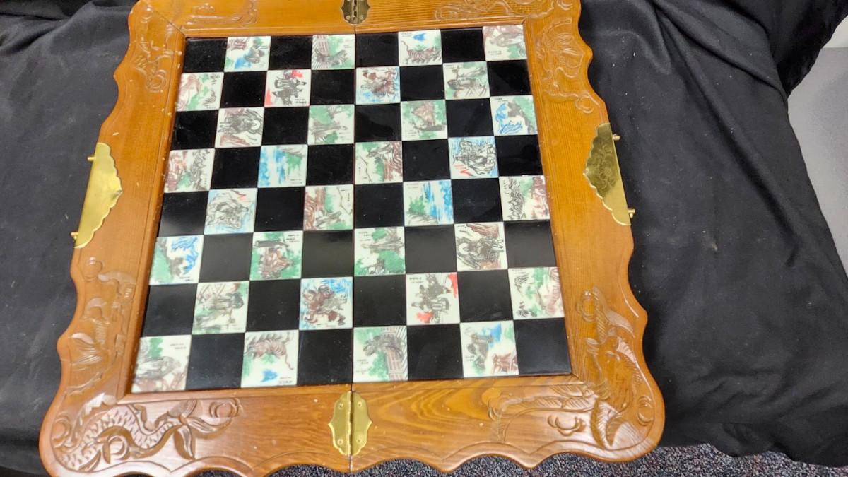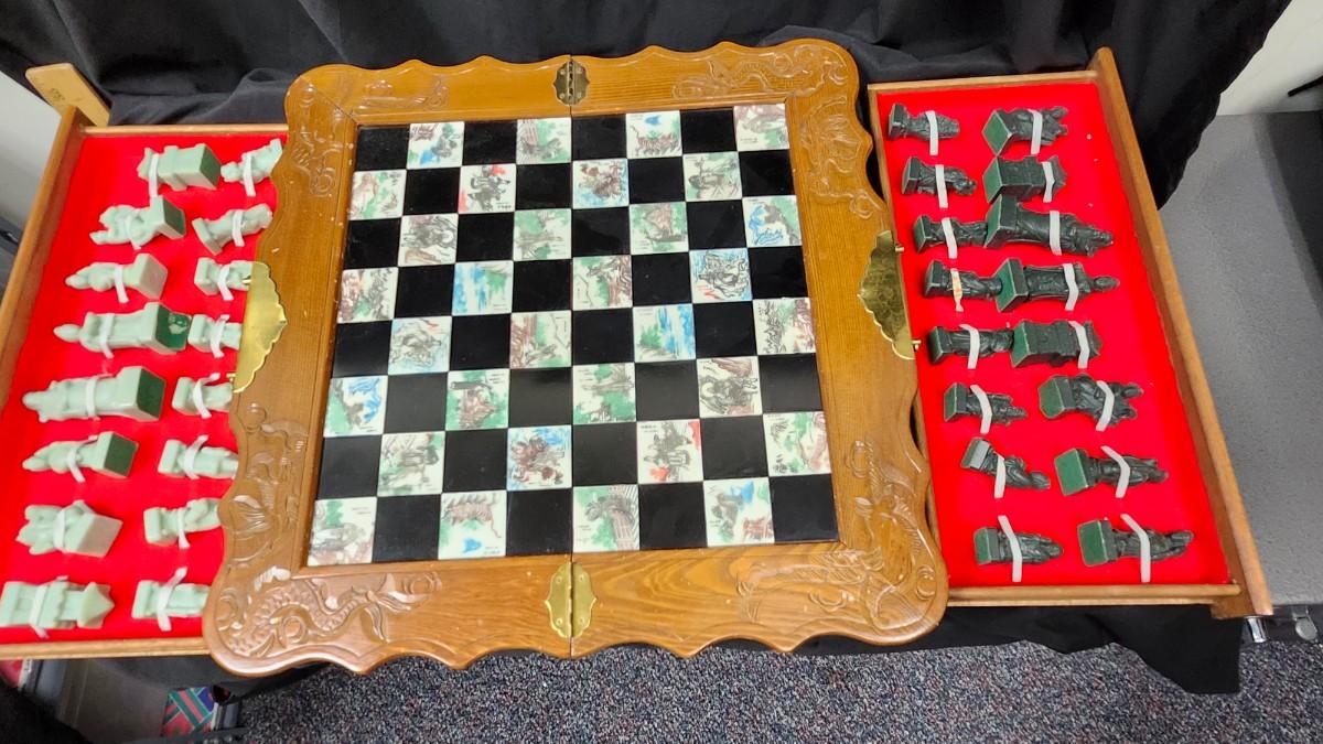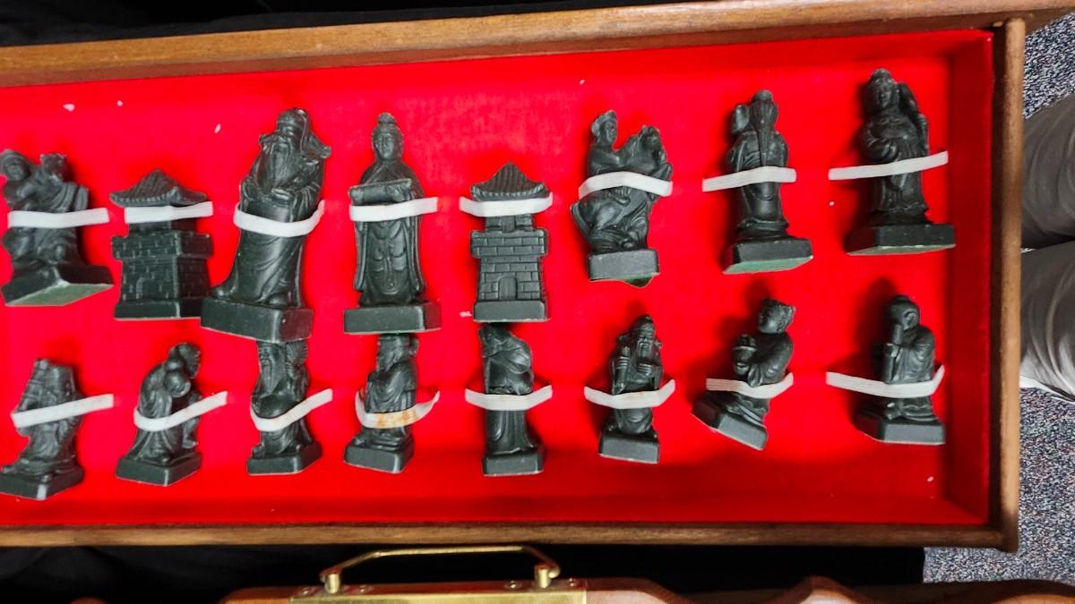 The Chess Board is a folding case with brass handles and drawers on each side to hold the Soapstone chess pieces that are about 2.5 inches tall, royal court figures. Local pickup.