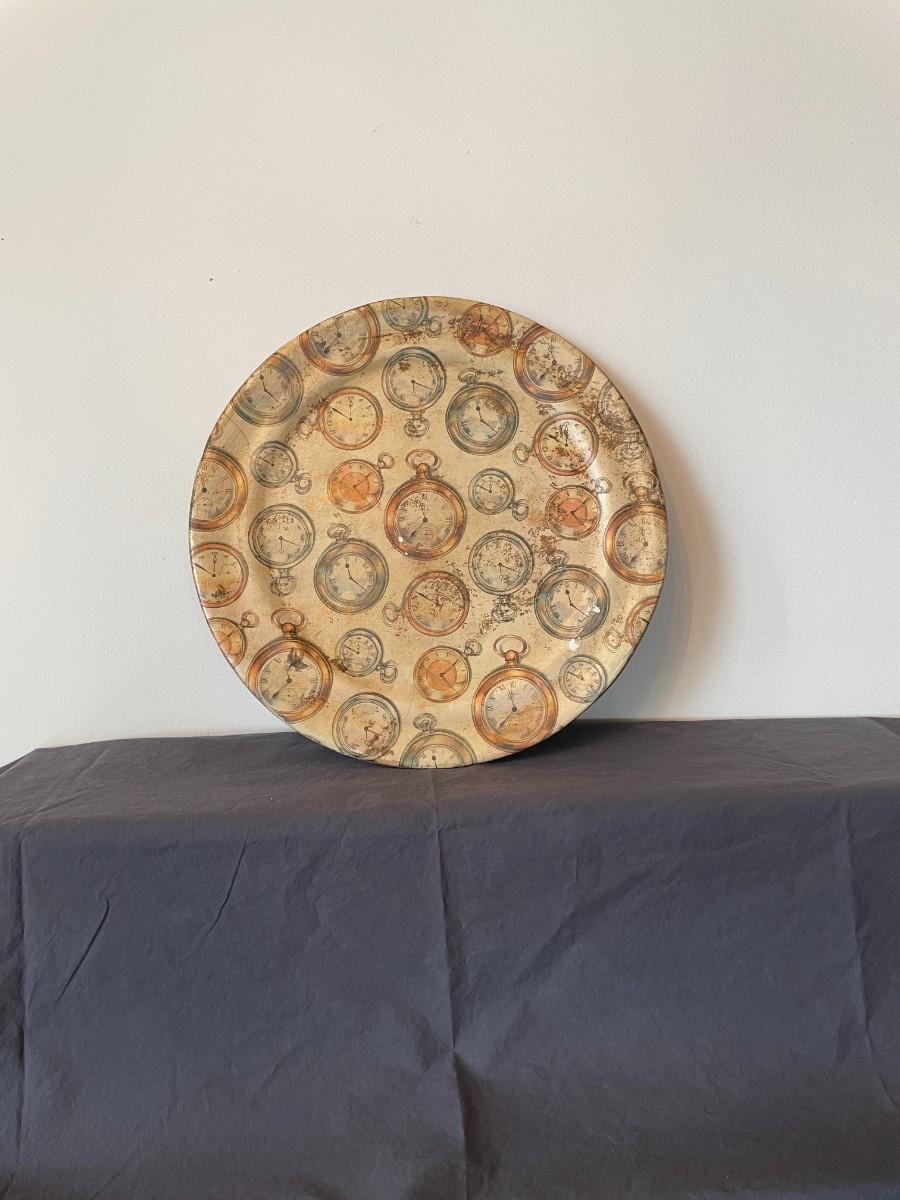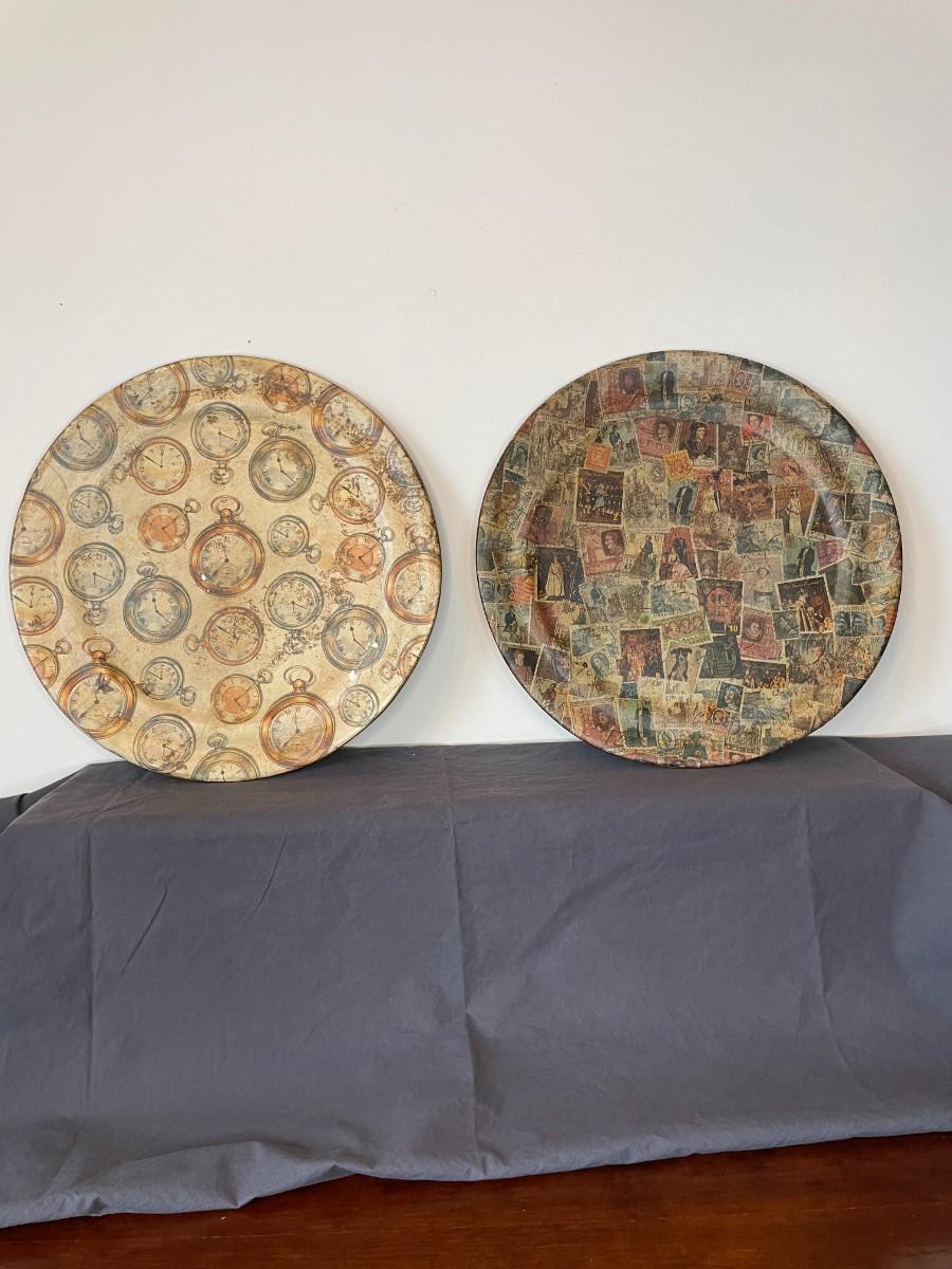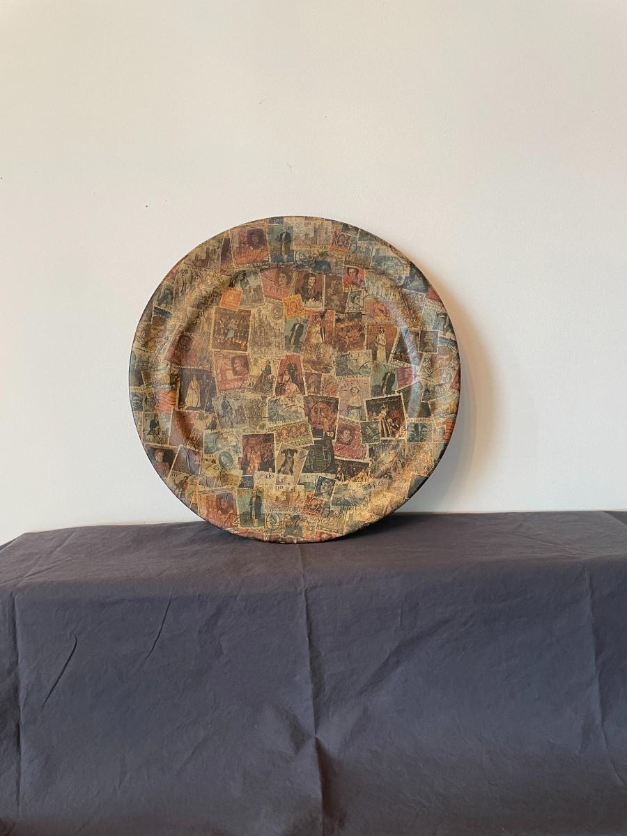Vintage Decoupage Postage Stamp decorative plate and Watch printed decorative plate . Hand Made. Measuring 13"