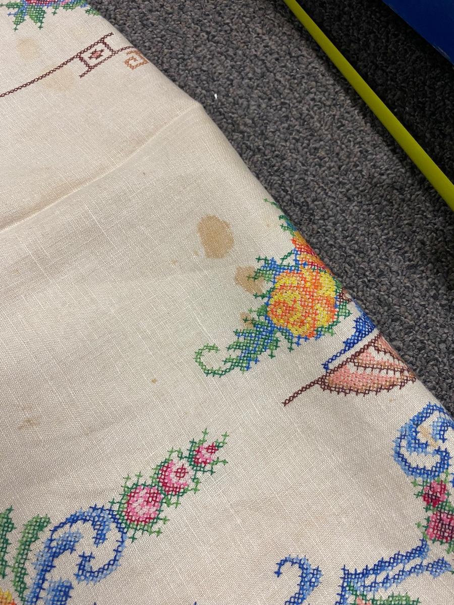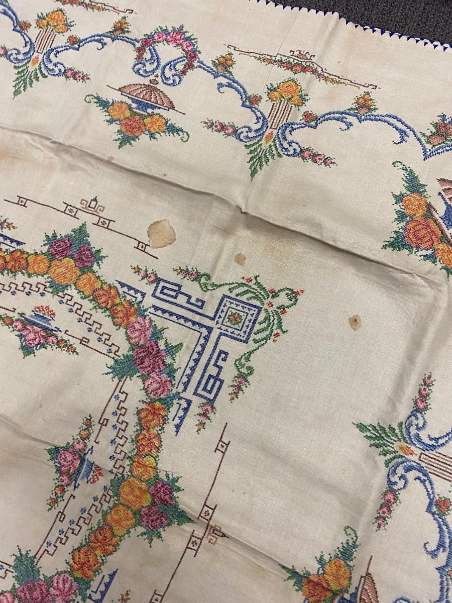 Vintage Hand Made Embroidered Tablecloth with Napkins Original Tags. Colorful embroidered pattern. Light discolor and a few spots from age. Tablecloth is 72x108.