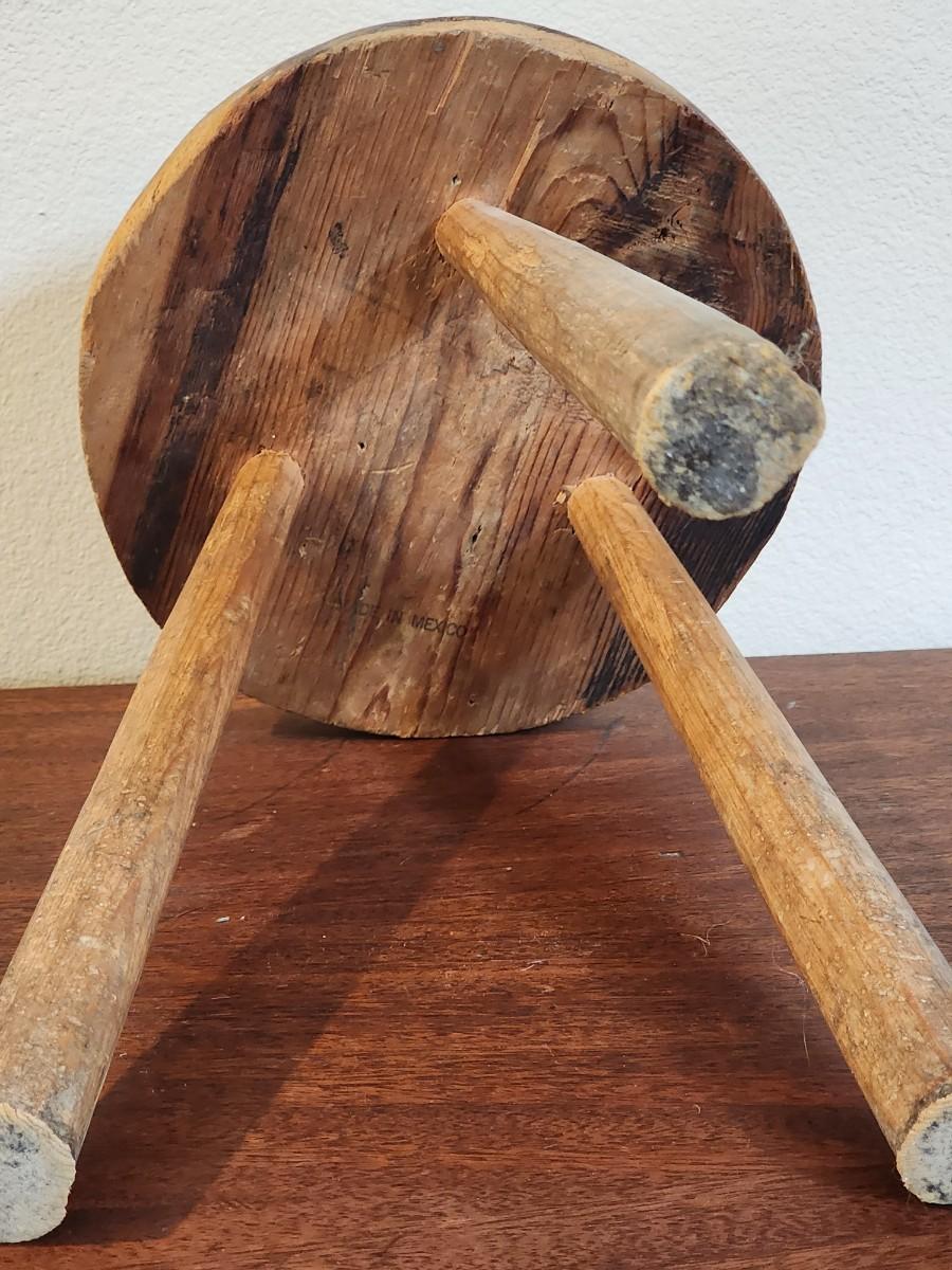 15" tall, 10.5" wide. Rough hewn, handmade wooden stool with peg legs, made in the primitive style. Stamped Made in Mexico.