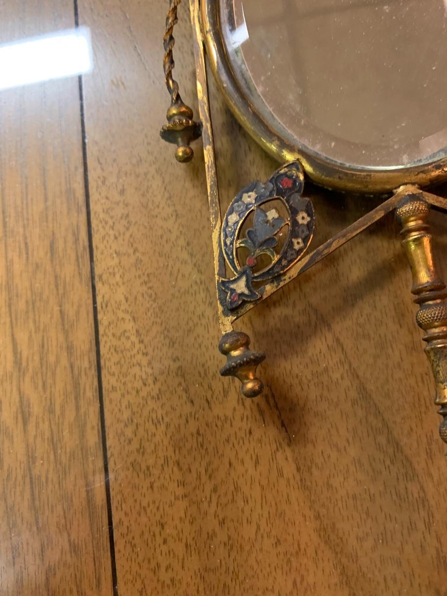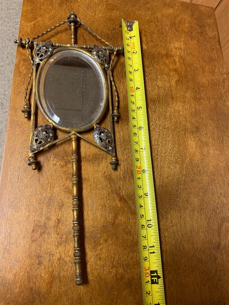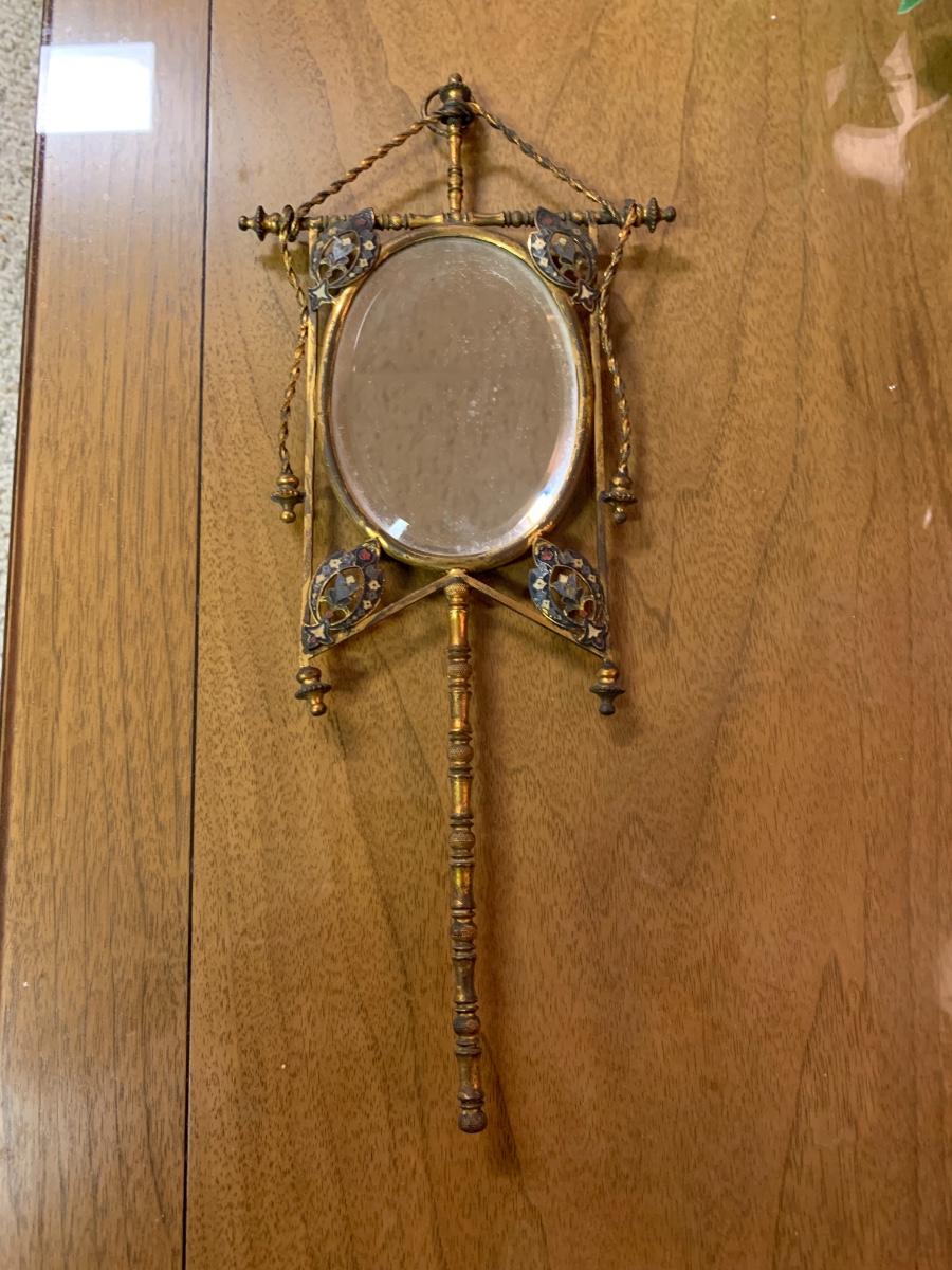 Gold colored mirror, intricate twisted frame with enamel patterned highlights in corner. Can be hand held or hung on wall.