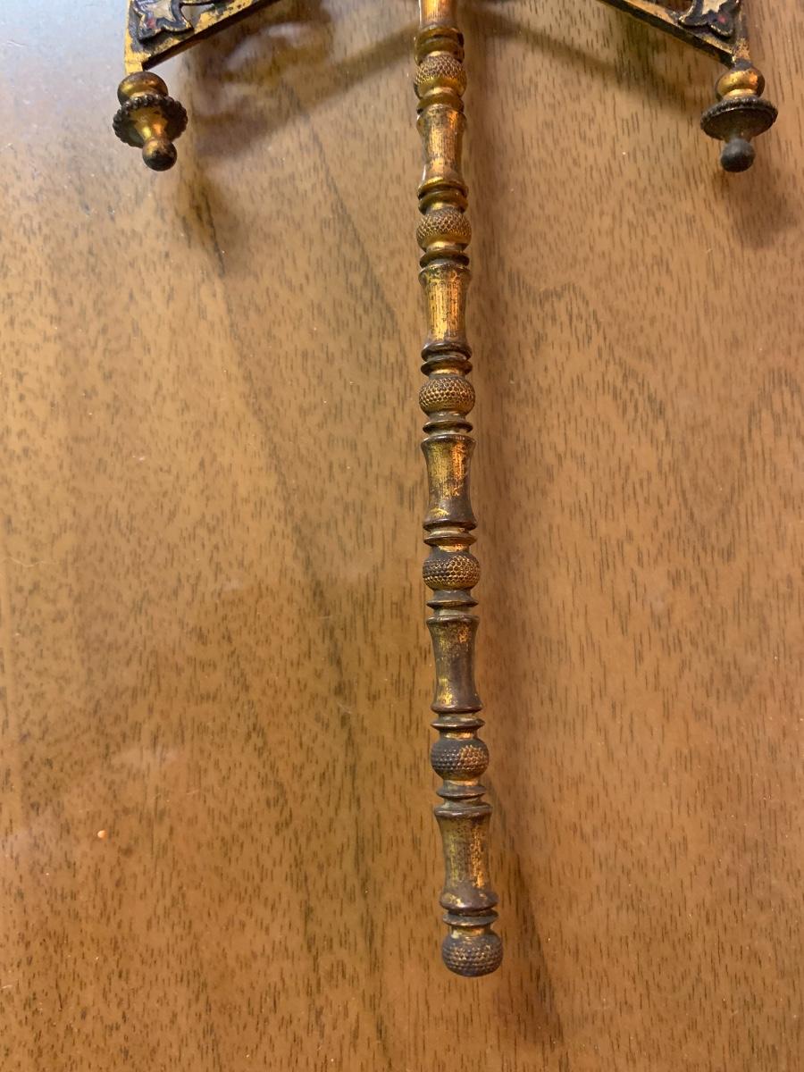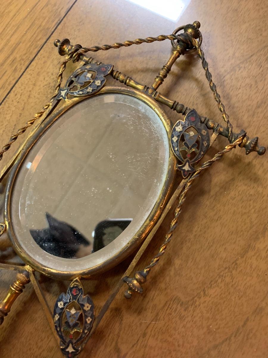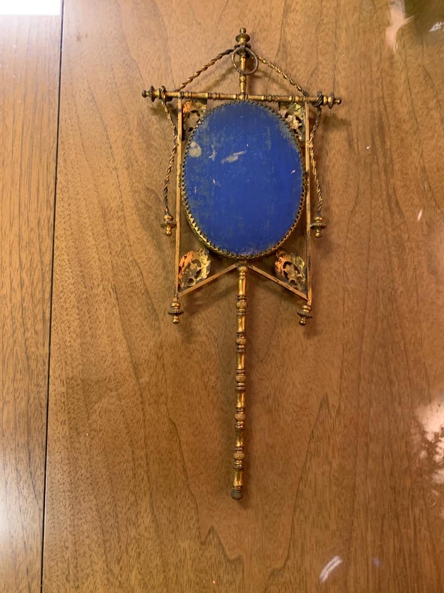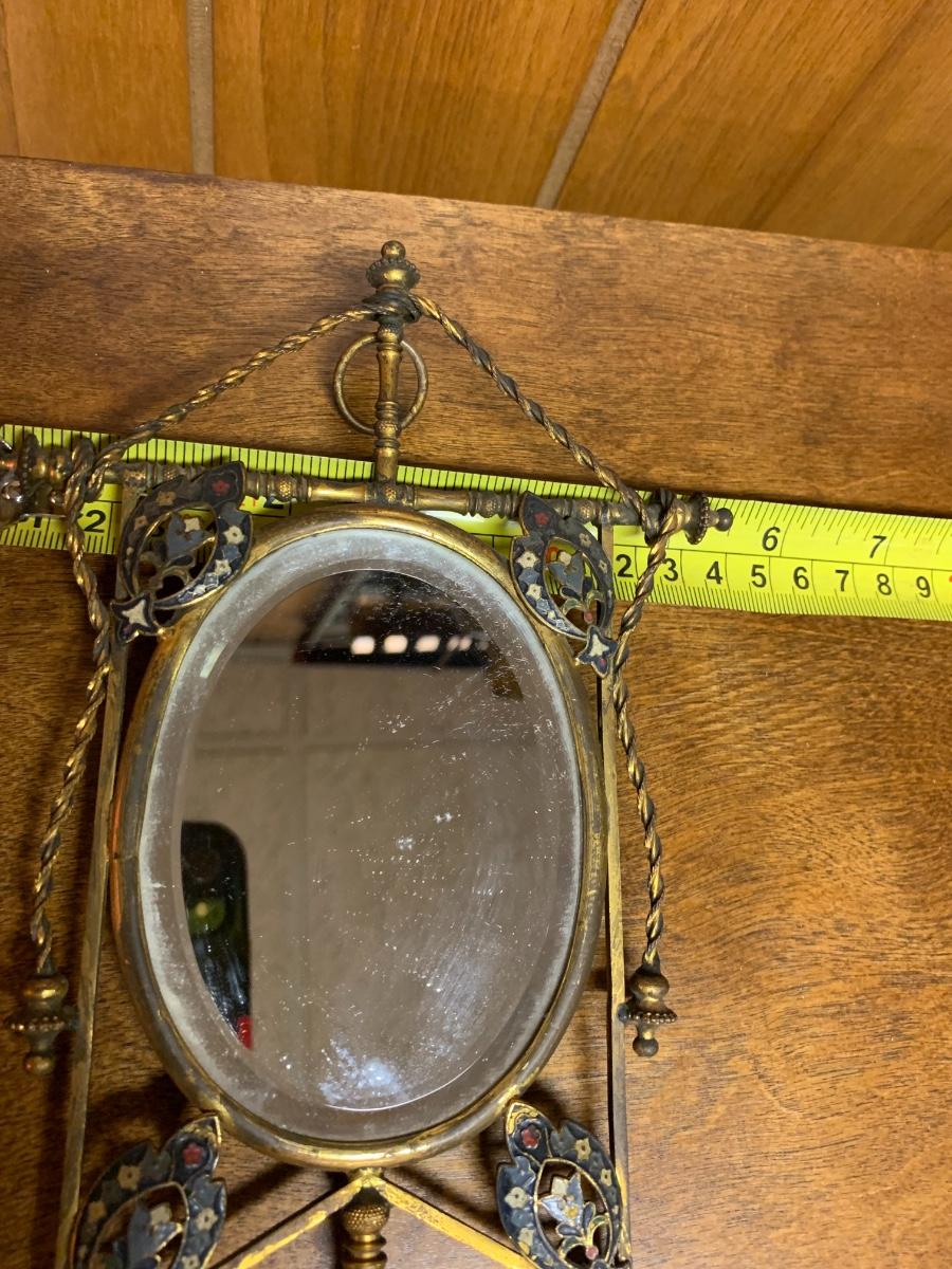 Gold colored mirror, intricate twisted frame with enamel patterned highlights in corner. Can be hand held or hung on wall.