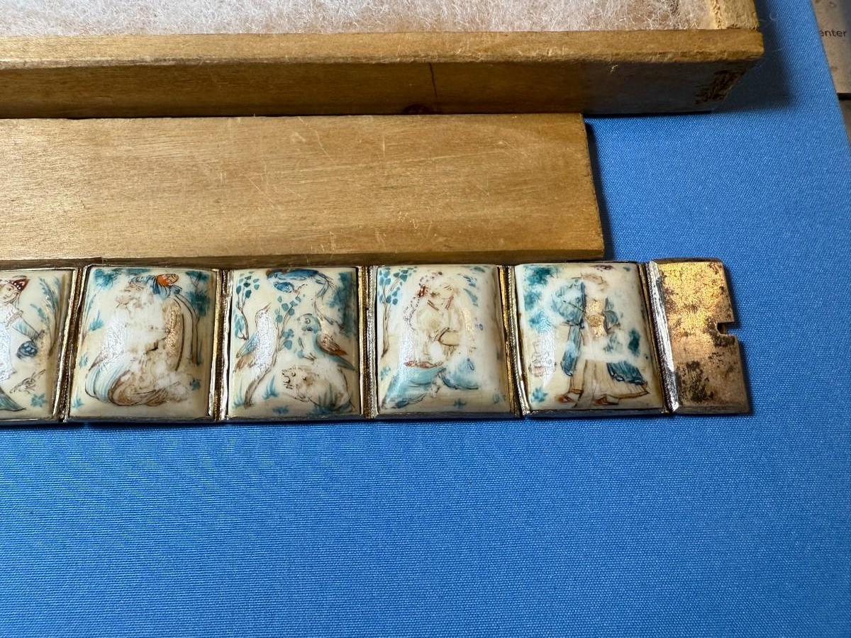Vintage Hand Painted Asian Storyteller Bovine 7.5” Sterling Bracelet in Good Preowned Condition. (Some of the Paint Scenes are very Weak).