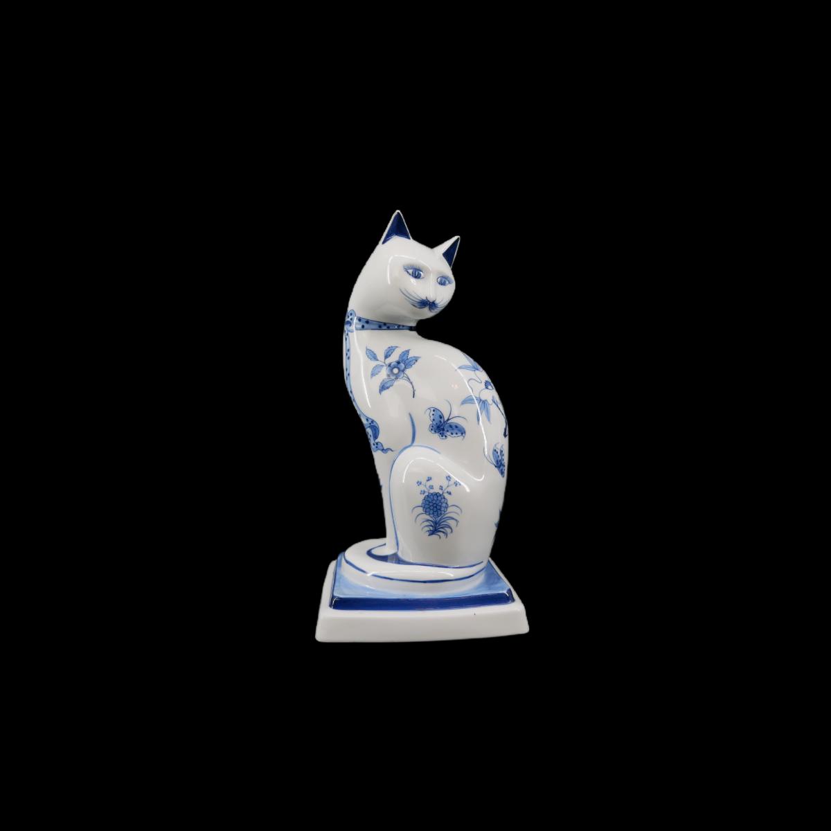 Large vintage porcelain hand painted cat statuette. Blue and white floral design with butterflies, handmade in Thailand. Cat has thoughtful gaze, gorgeous whiskers, and ornately painted long ribbon around its neck. Excellent condition. Measures L 5.5" x H 11" x W 5". Weighs 1 lb 14 oz. (D33)