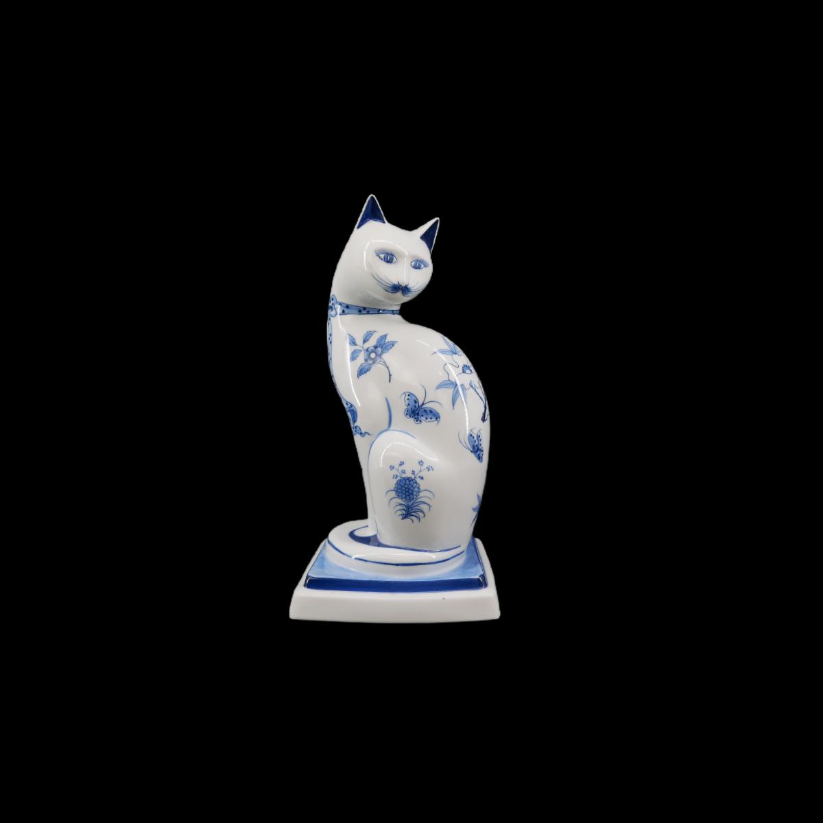 Large vintage porcelain hand painted cat statuette. Blue and white floral design with butterflies, handmade in Thailand. Cat has thoughtful gaze, gorgeous whiskers, and ornately painted long ribbon around its neck. Excellent condition. Measures L 5.5" x H 11" x W 5". Weighs 1 lb 14 oz. (D33)