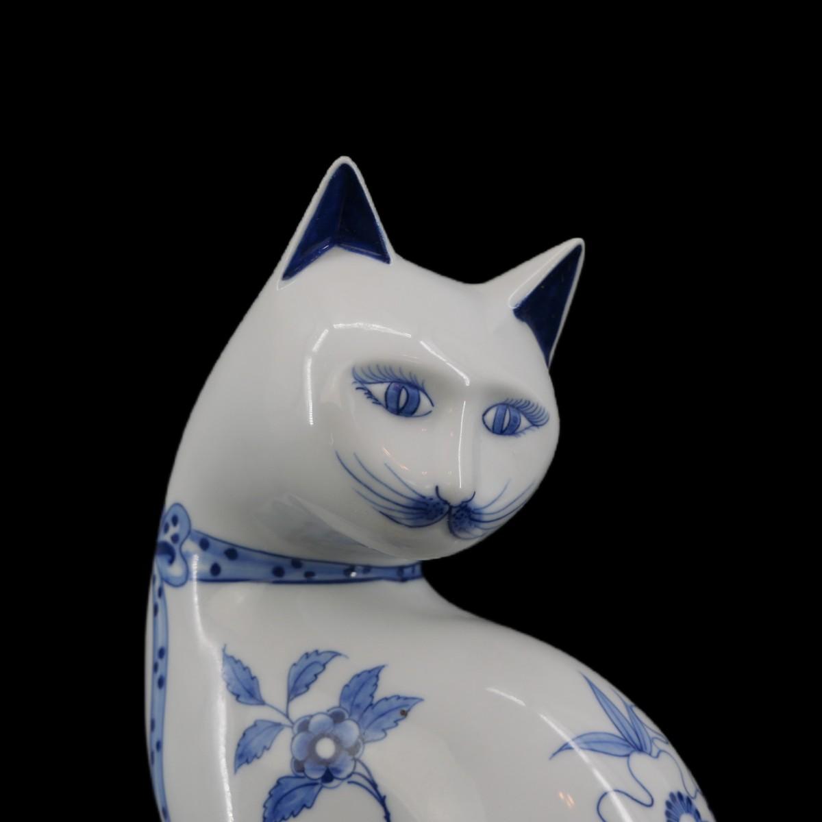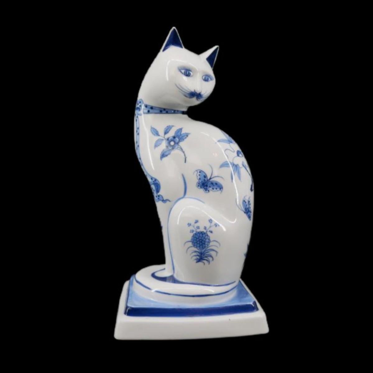 Large vintage porcelain hand painted cat statuette. Blue and white floral design with butterflies, handmade in Thailand. Cat has thoughtful gaze, gorgeous whiskers, and ornately painted long ribbon around its neck. Excellent condition. Measures L 5.5" x H 11" x W 5". Weighs 1 lb 14 oz. (D33)