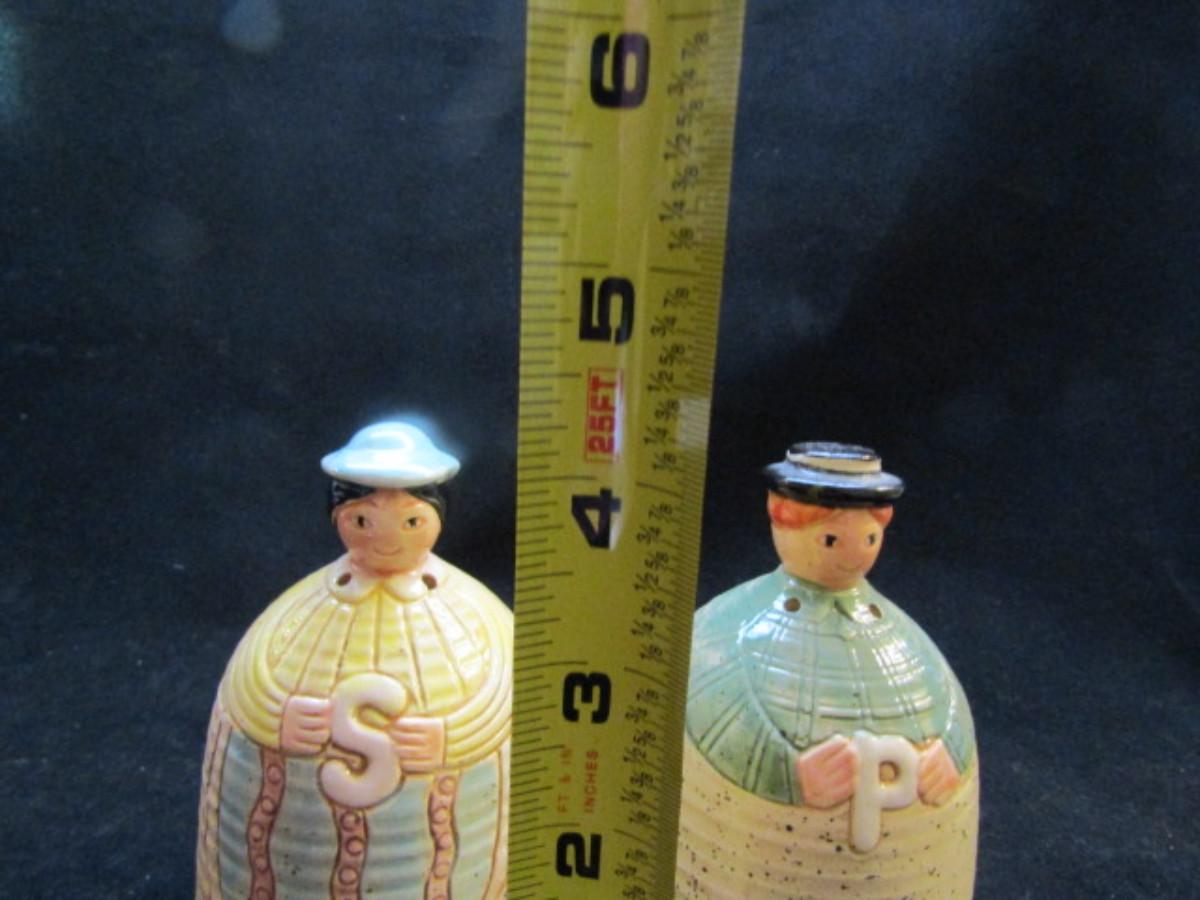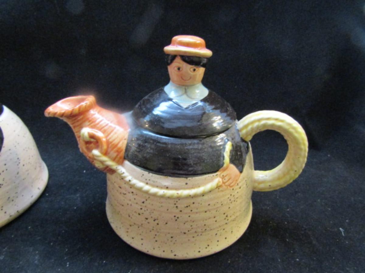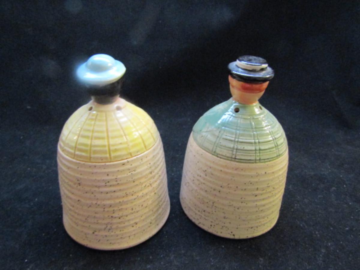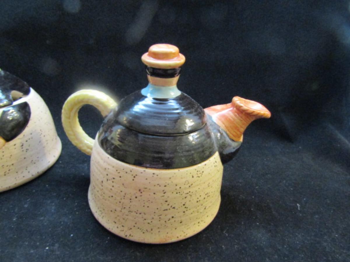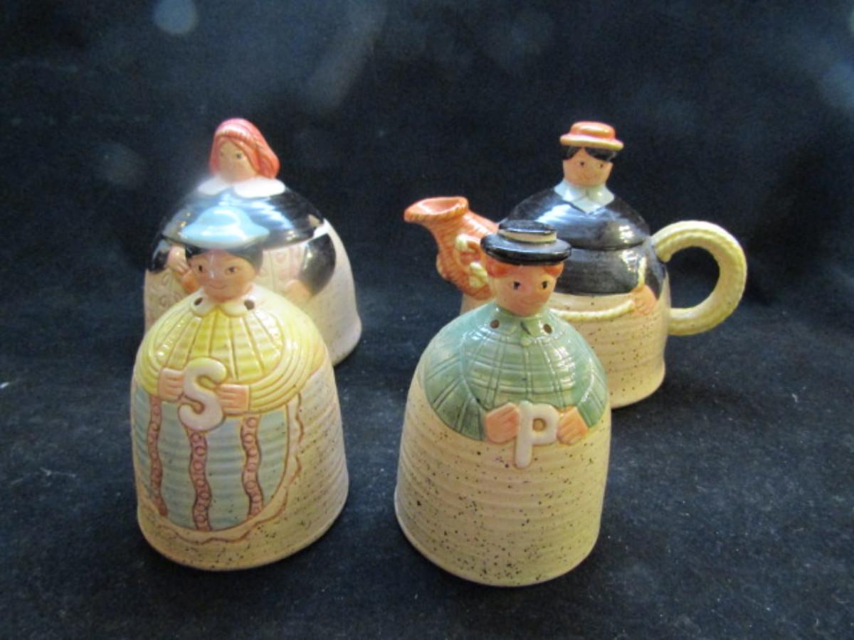 Vintage, Hand Painted Folk Craft Pieces by Shafford (#31). Assortment includes small teapot, covered sugar bowl, and salt and pepper shakers.