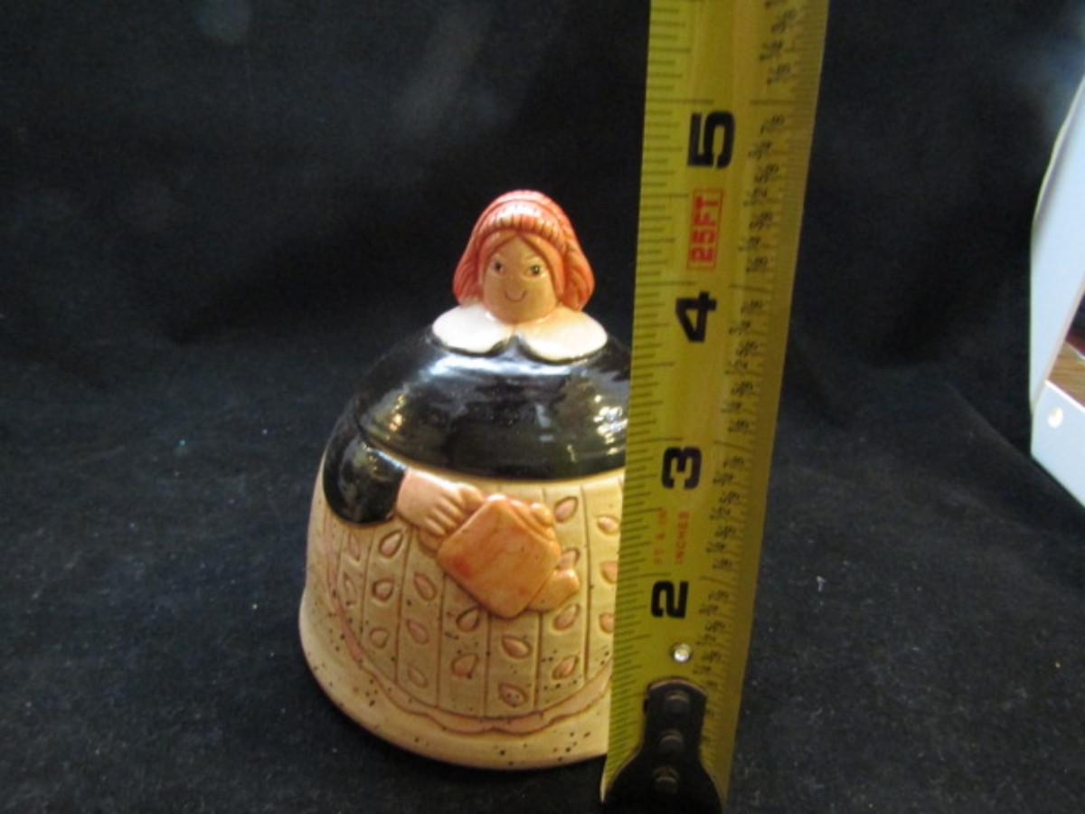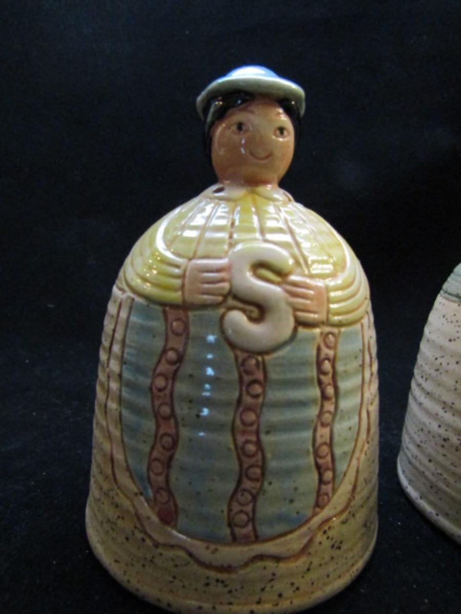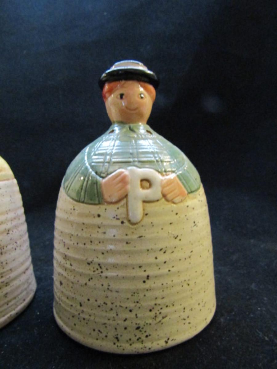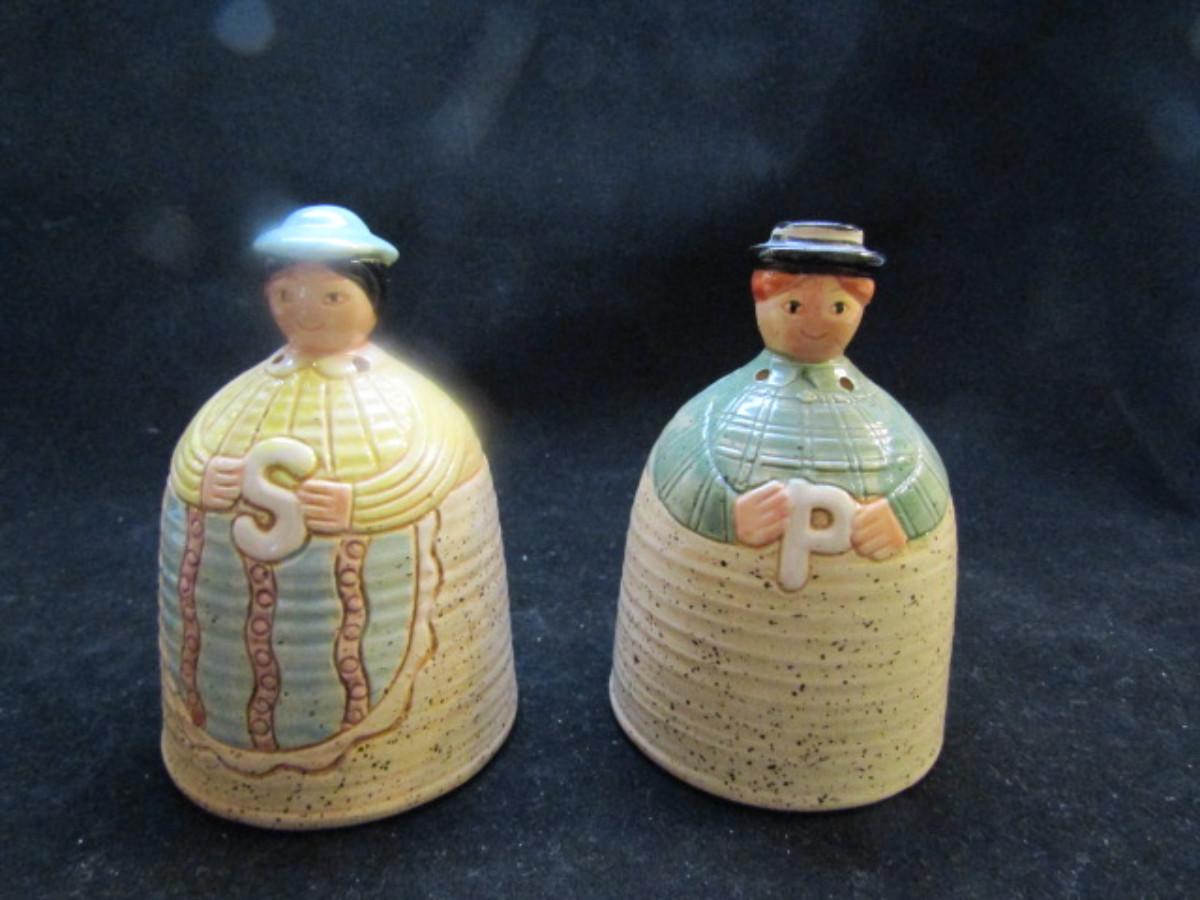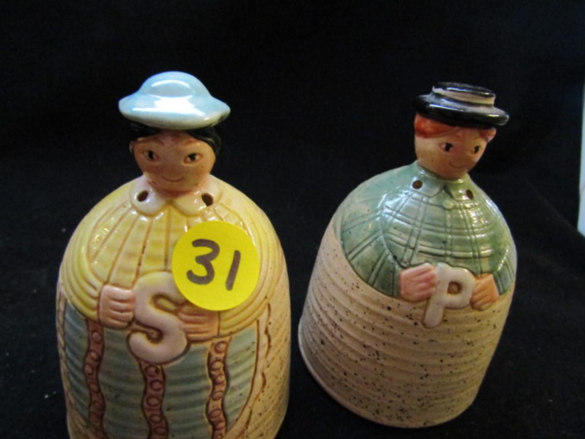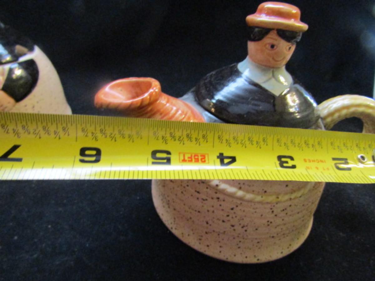 Vintage, Hand Painted Folk Craft Pieces by Shafford (#31). Assortment includes small teapot, covered sugar bowl, and salt and pepper shakers.