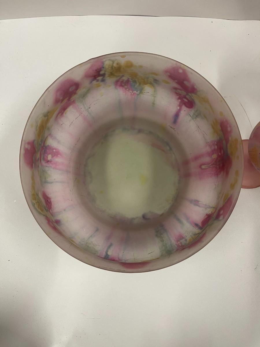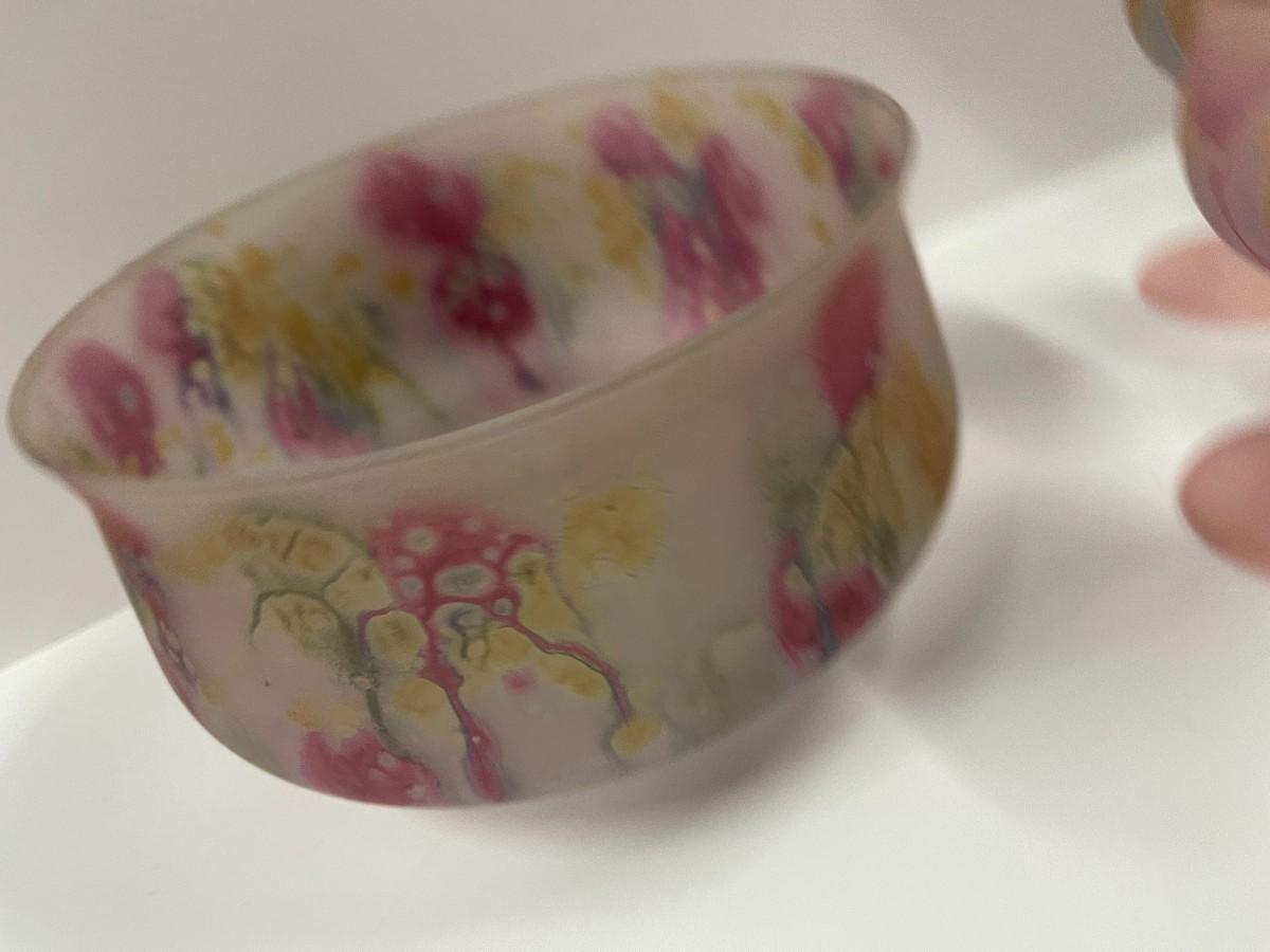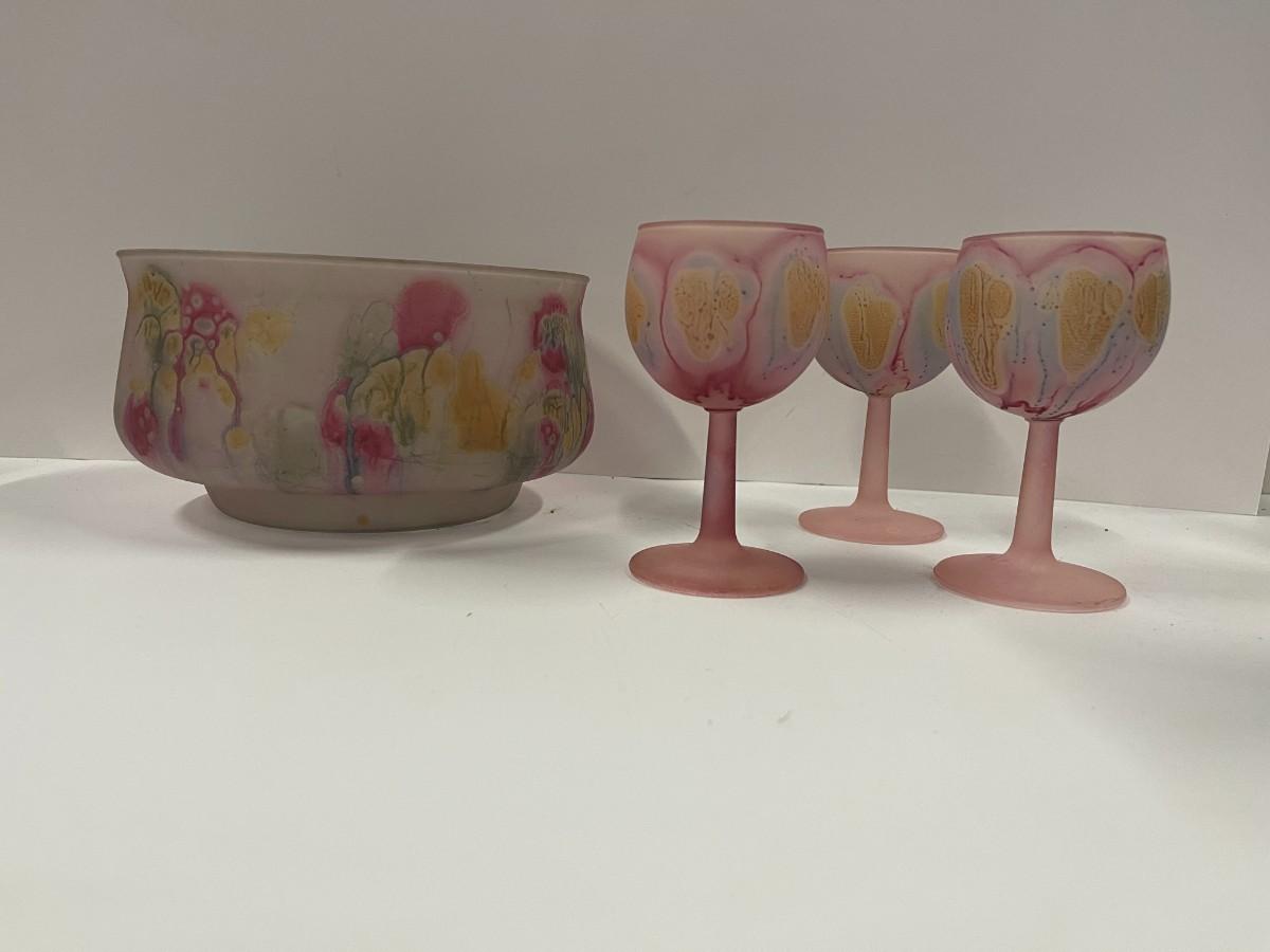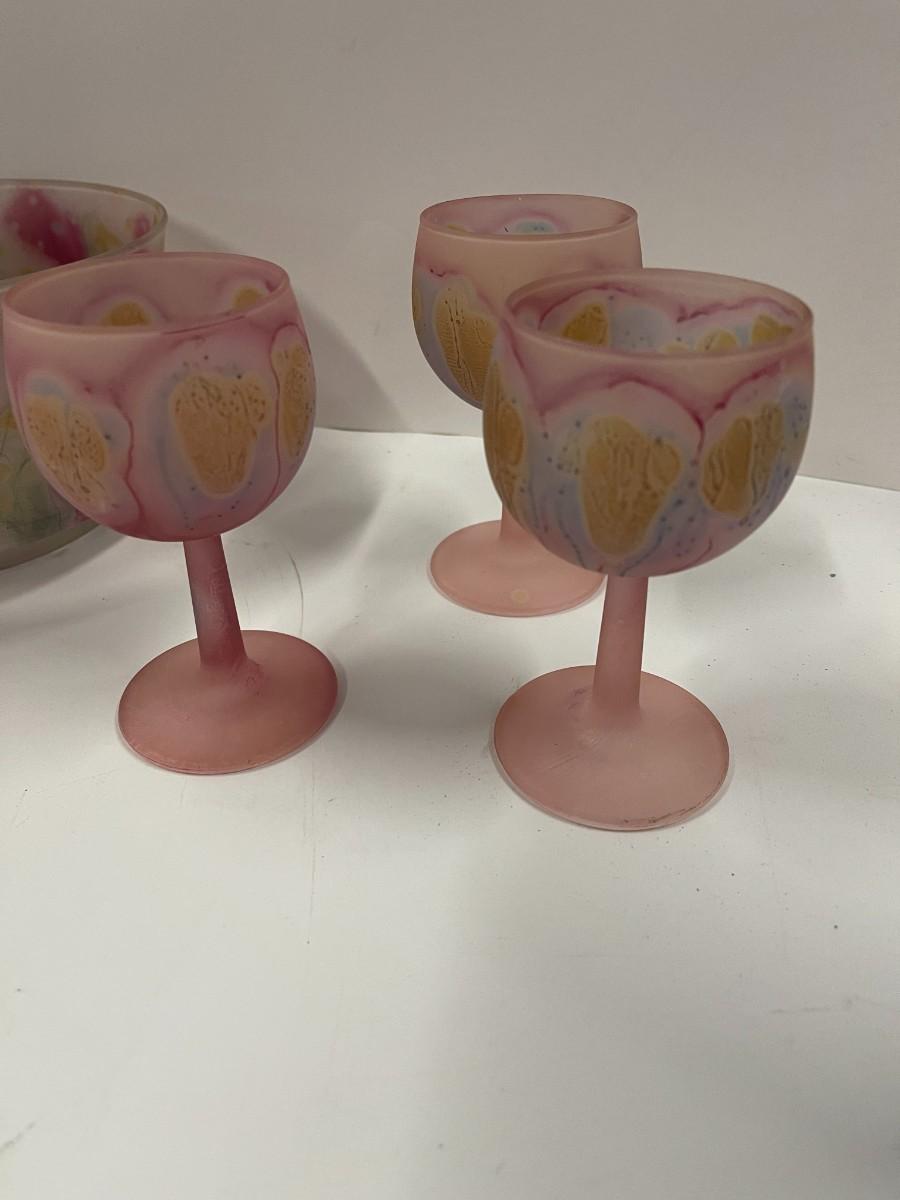 Vintage hand painted bowl and 3 wine glasses made in Israel. Bowl is 7 1/2" x 4" tall. Glasses are 2 1/2" wide at the bowl. All in excellent condition.