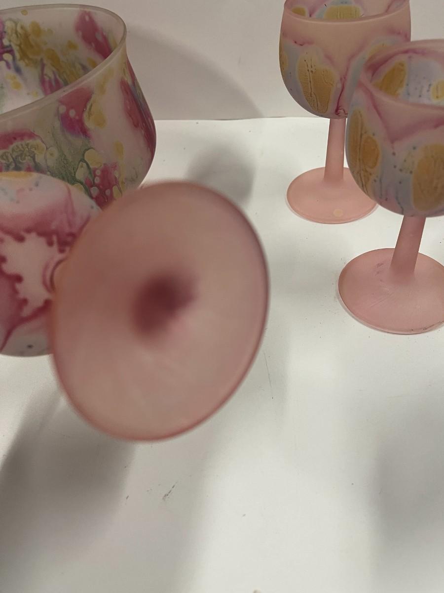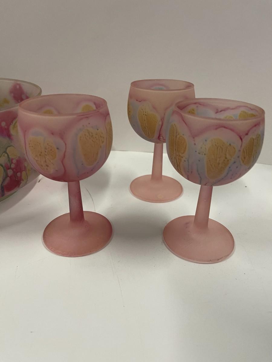 Vintage hand painted bowl and 3 wine glasses made in Israel. Bowl is 7 1/2" x 4" tall. Glasses are 2 1/2" wide at the bowl. All in excellent condition.